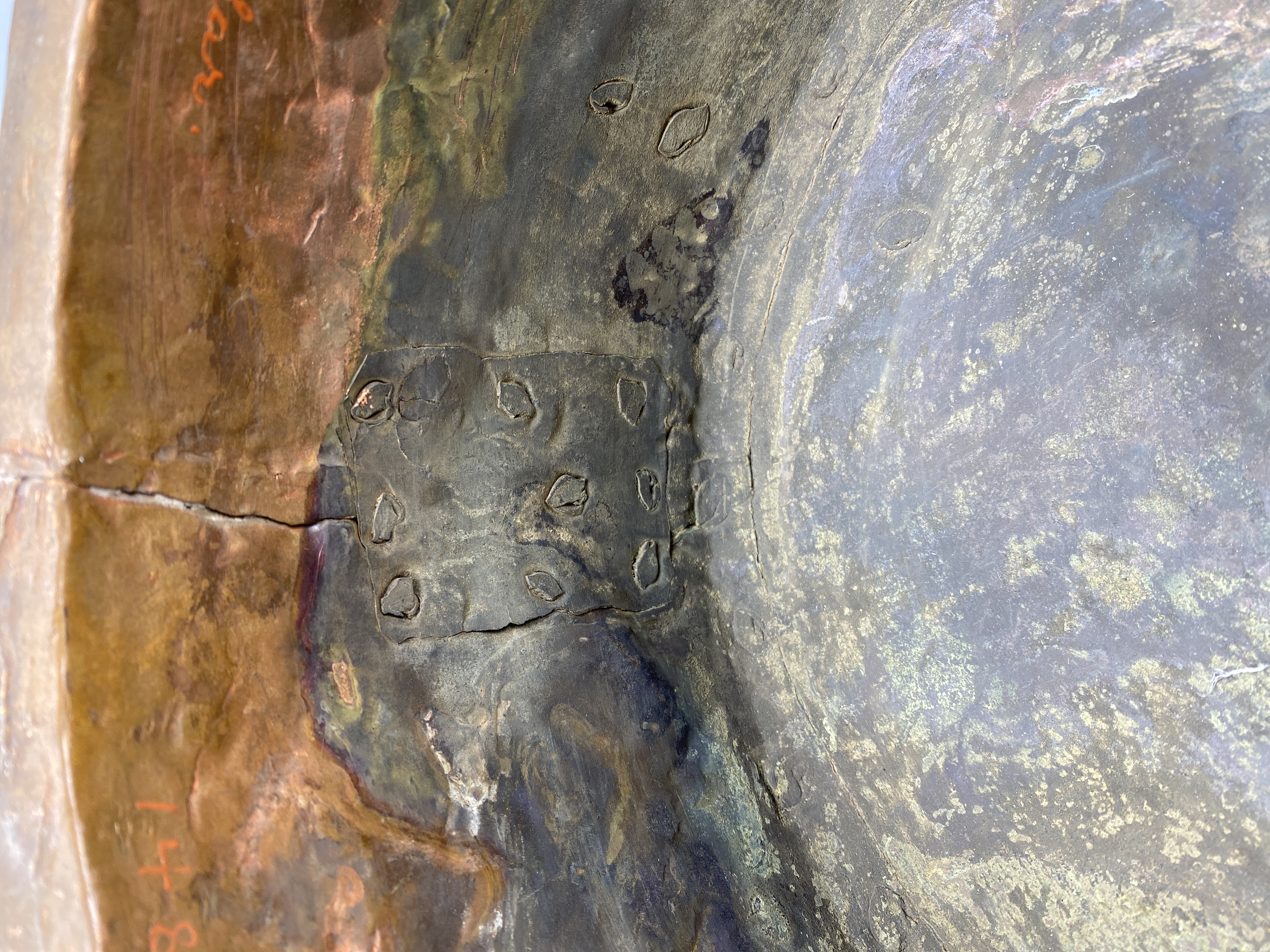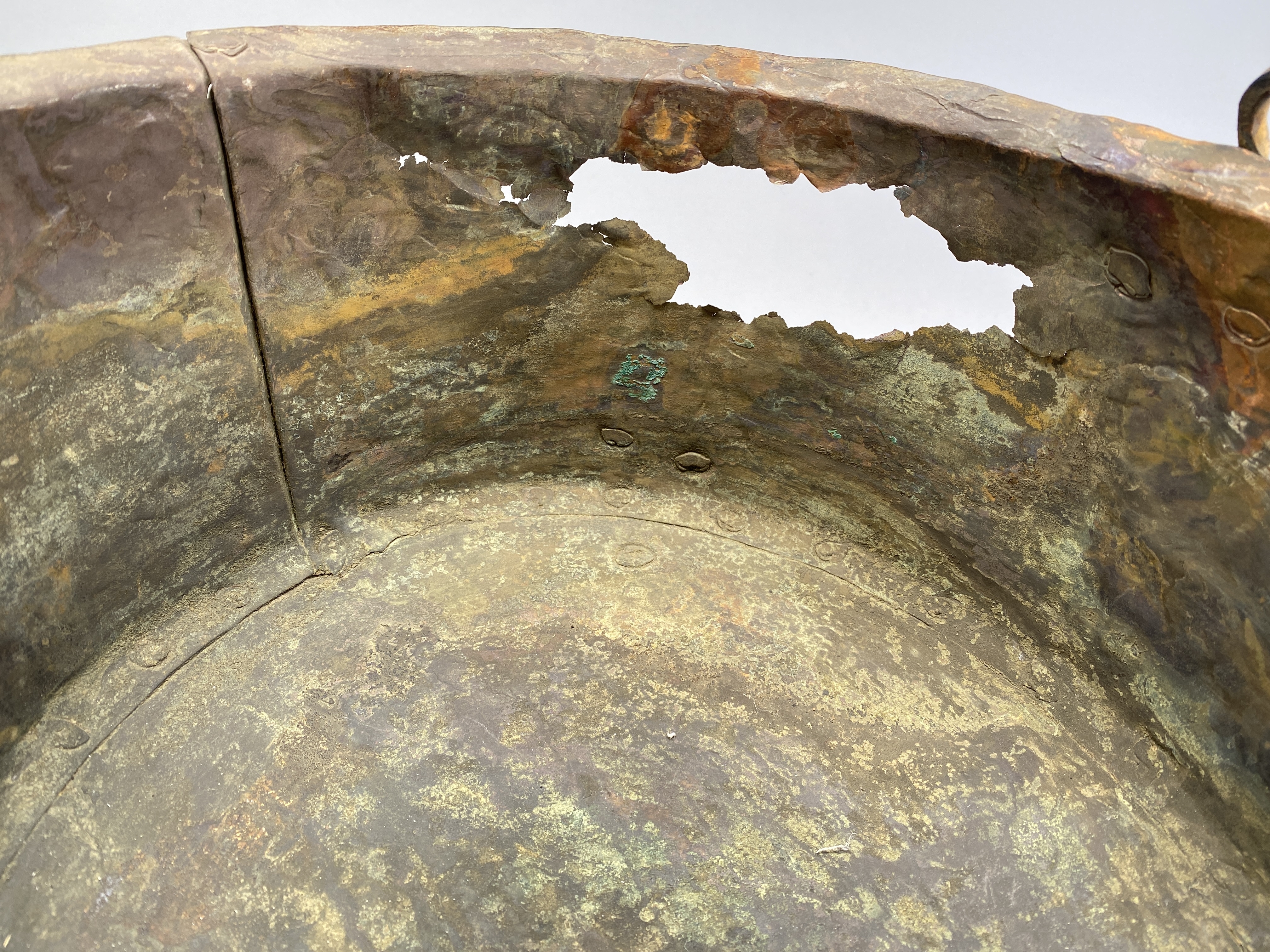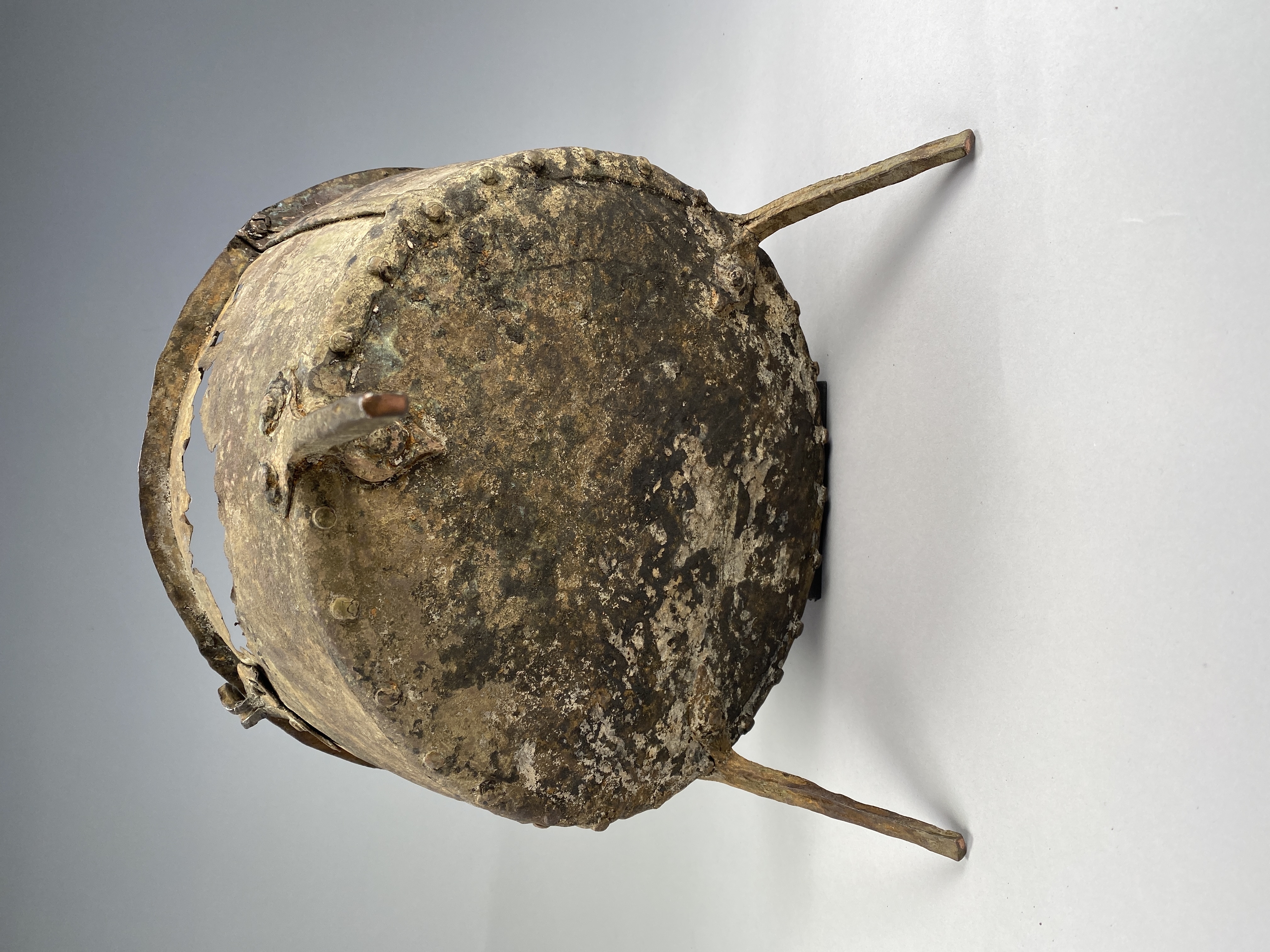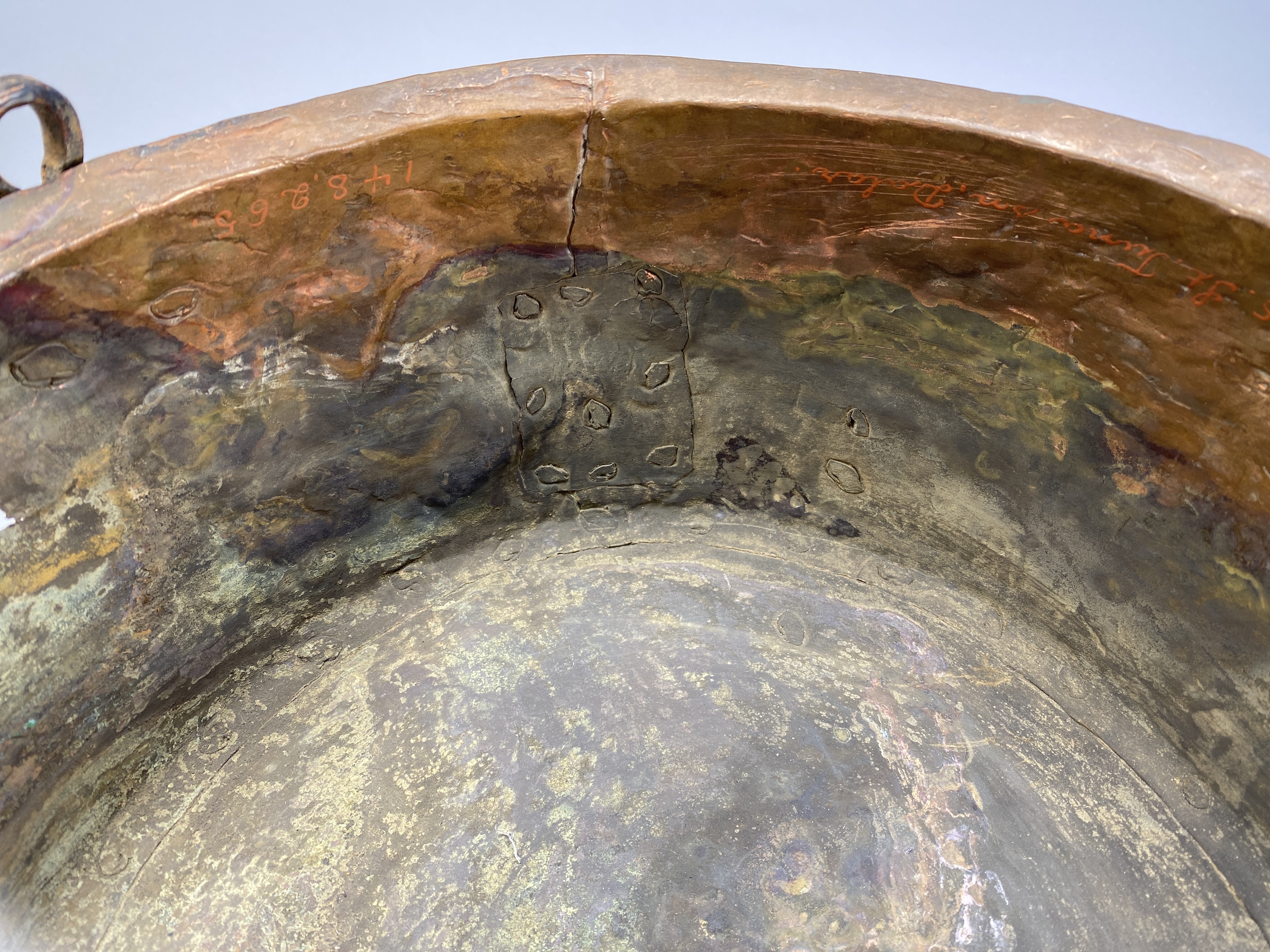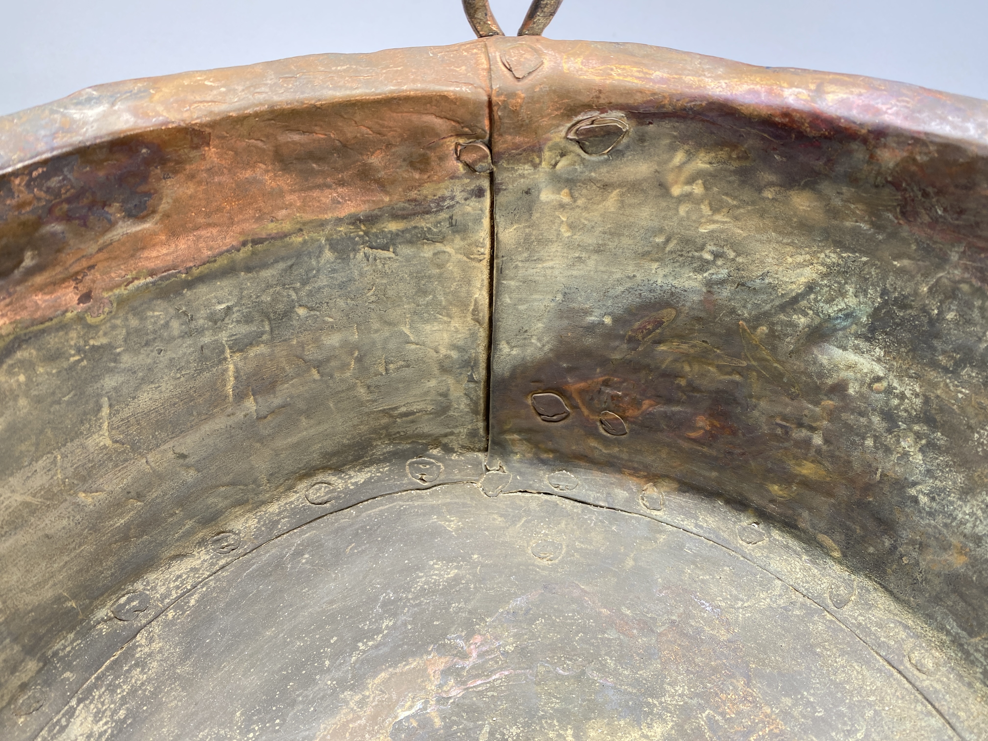 Kittel av koppar med tre ben och två hankfästen. Nitad av fyra plåtar.