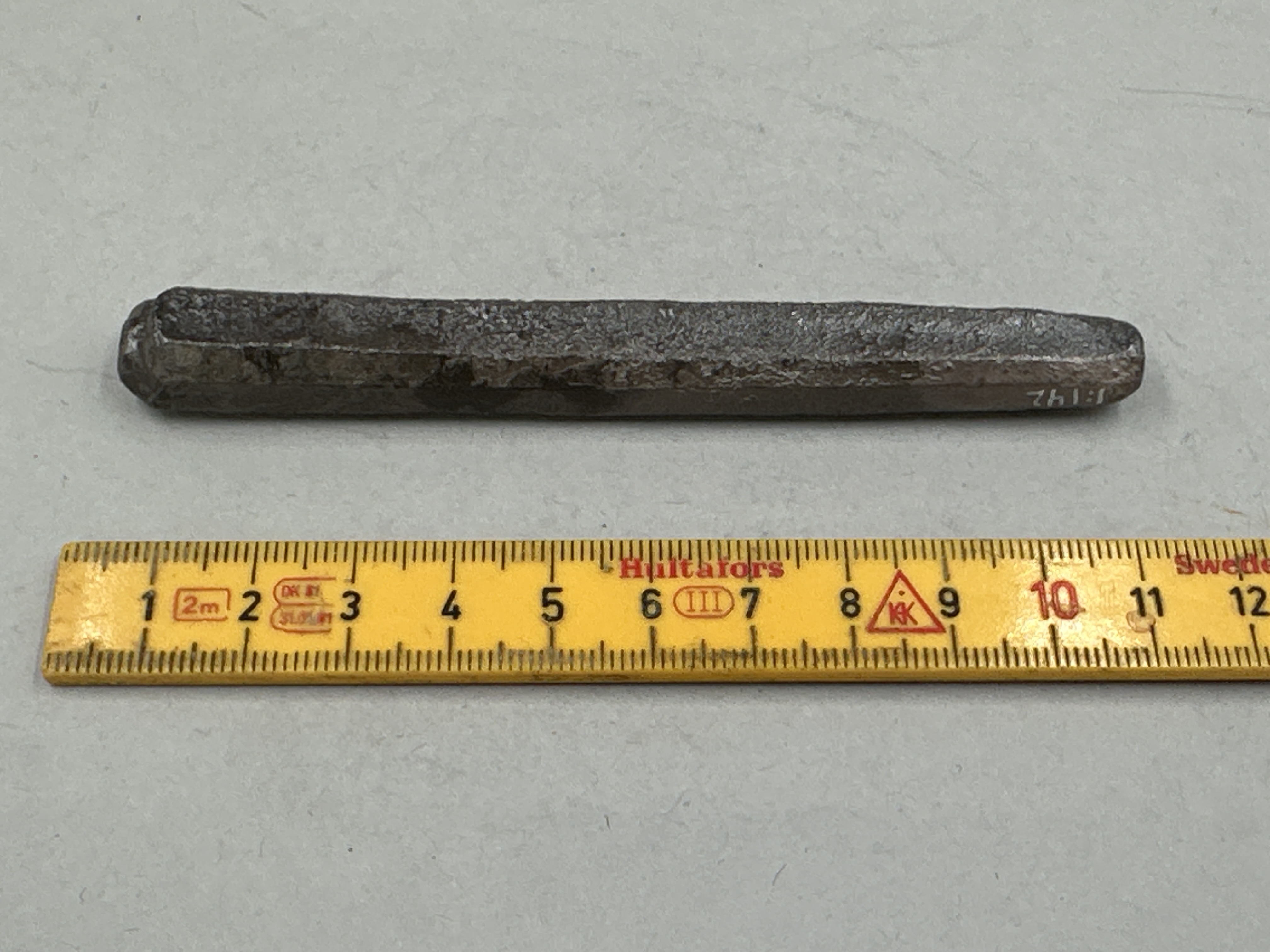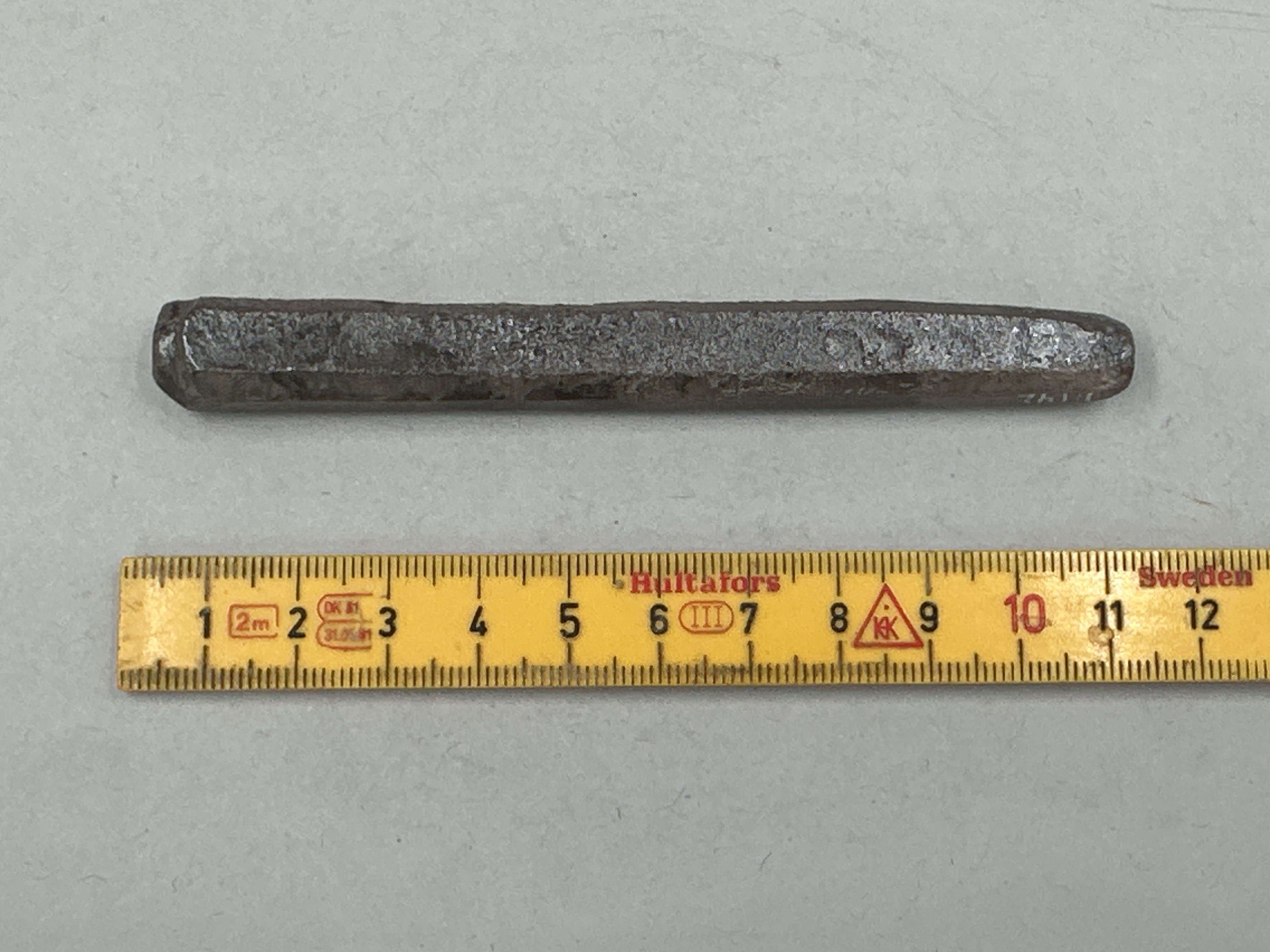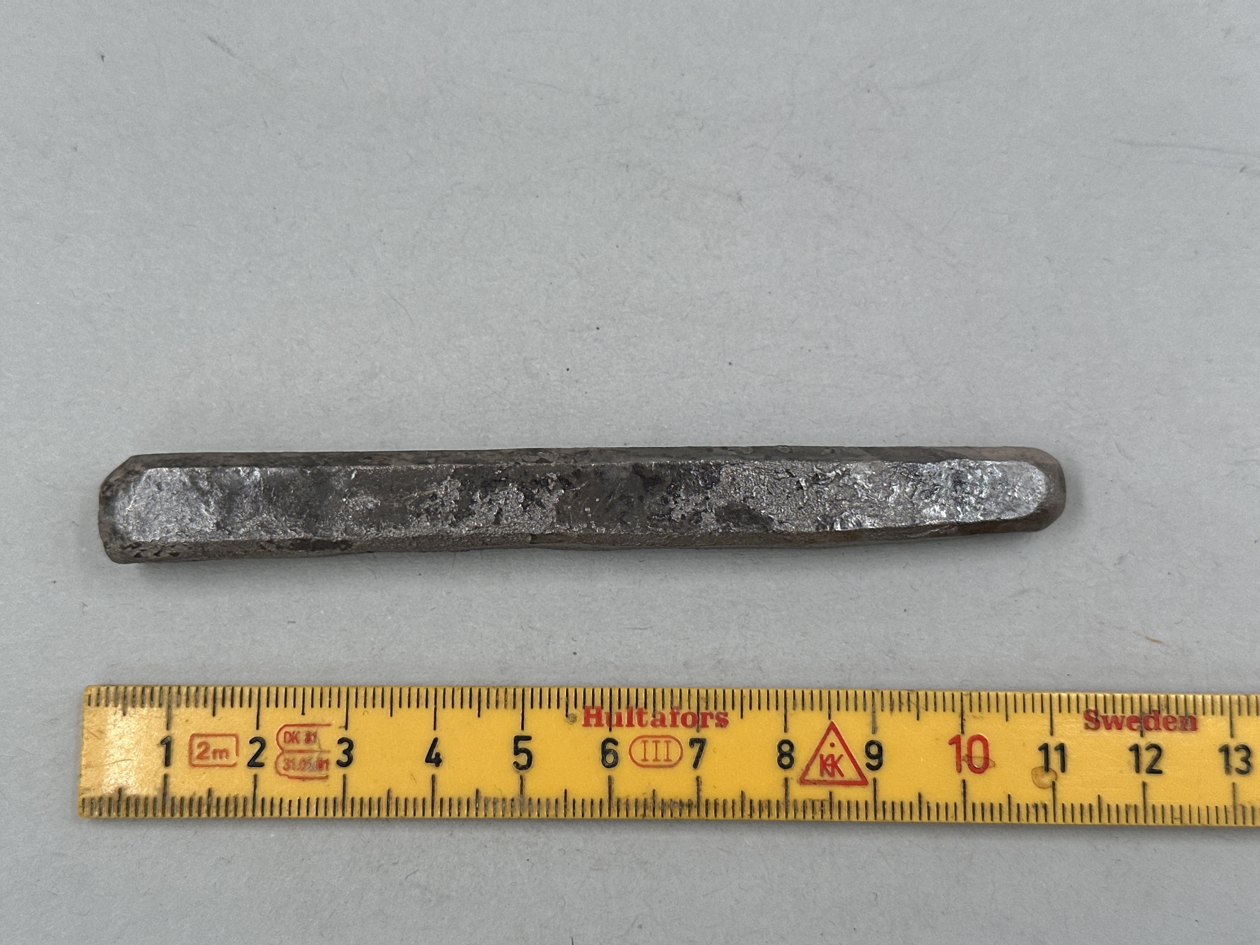 Avlång rektangulär form med avfasade kanter. Tjockare i ena änden. Skadat ytskikt.