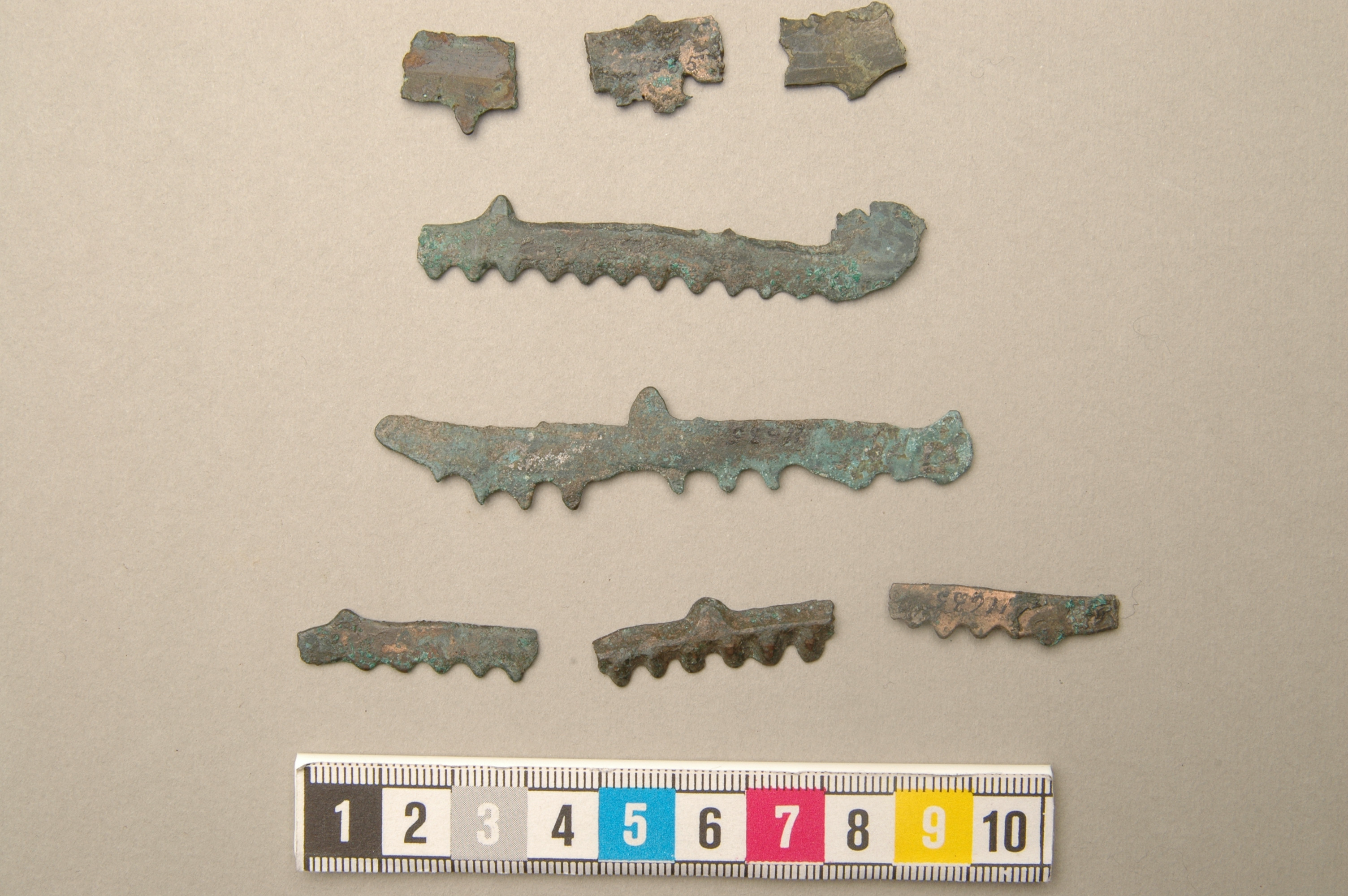 Åtta fragment av sågtandade skäror. Fem av smal typ, tre av en bredare typ.