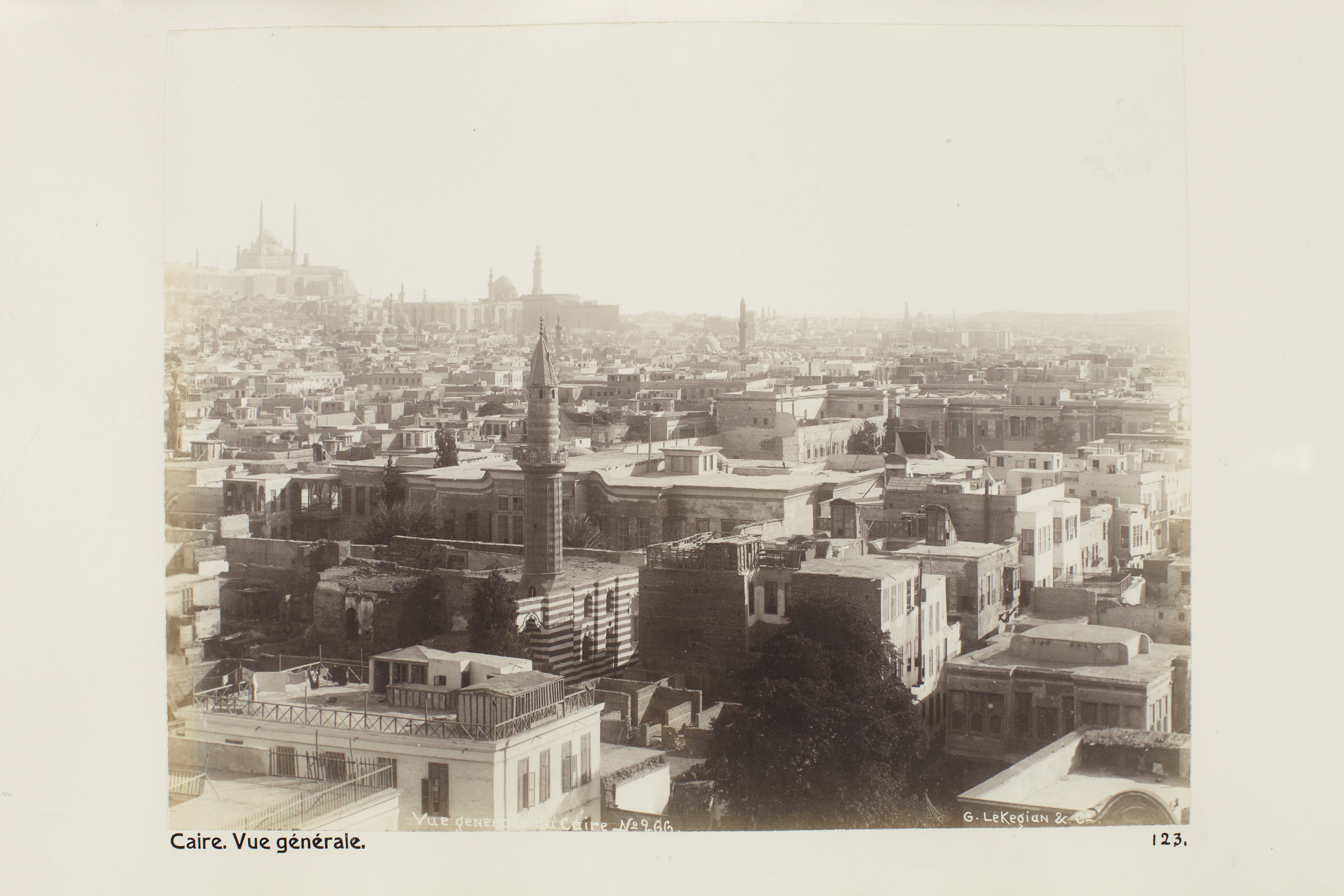 Vy över Kairo, Egypten. Text på fotografiet: Caire. Vue générale. Fotografierna LXVI:M.01.- 201. kommer från resan till Egypten och Sudan som Wilhelmina och Walther von Hallwyl gjorde vintern 1900-1901. De lämnade Sverige den 5 november 1900 och fortsatte från Egypten till Palestina den 28 mars 1901. Med på resan var döttrarna Ellen med maken Henric de Maré och Irma med maken Wilhelm von Geijer. Wilhelminas sällskapsdam, fröken Ida Uhse reste också med. Under en del av resan anslöt sig ledamoten av Internationella domstolen i Kairo, assessorn Otto Conrad Waldemar Cedercrantz med makan Anna Elisabeth. Vid resan uppför Nilen hade Walther von Hallwyl hyrt ångfartyget Columbia med besättning. Båtresan startade i Kairo 27 december 1900, gick ända till Wadi Halfa varifrån man reste vidare med tåg till Khartum och tillbaka till Wadi Halfa. Båten vände åter i riktning mot Kairo, men det verkar som att sällskapet tog tåg sista biten, från Luxor. Henric och Ellen de Maré samt fru Cedercrantz lämnade båten redan då de passerade Luxor första gången. Resten av sällskapet återvände till Kairo den 1 mars. Fotografierna LXVI:M.01.-120. togs av resenärerna själva, de största av Ellen de Maré, de mellersta av Wilhelmina von Hallwyl och de minsta av Wilhelm von Geijer. Resten köptes av professionella fotografer i Kairo, de flesta från Studio Photogr. Artistique G. Lekegian & Cie. Alla uppgifter kommer från Ida Uhses reseanteckningar. Inköpt hos studio Photogr. Artistique G. Lekegian & Co’.