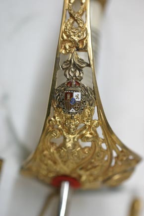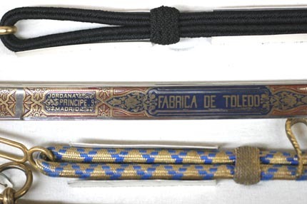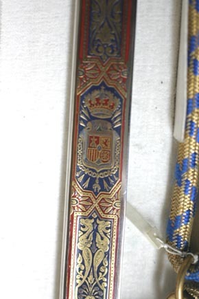 Fäste av förgylld mässing med bakre parerstång i form av djurhuvud, yttre parerplåten större med oval knapp med krönt ankare mot finräfflad botten. Kappa i form av lejonhuvud övergående i rygg beslag med graverade rankor. Nedtill ringformigt beslag medbladkrans. Klinga böjd, förnicklad, eneggad med jelman 260 mm lång med mittås och vulstformig rygg. Ornering på båda sidor 370 mm lång från basen räknat, i form av vid basen på båda sidor rektangulärt fält med blå och röd botten och med blad- och bandformig dekor (förgylld), därefter rektangulärt fält med text: "JORDANA PRINCIPE 9 MADRID", liknande utdraget rektangulärt med text: "FABRICA DE TOLEDO" därefter tre rektangulära ornament med blå botten alla omgivna av röd dekor, det i mitten innefattande en vapensköld omgiven av elefantorden och med kunglig krona. På insidan rektangulär miniatyrmålning (?) föreställande fartyg, därefter ovalt blått fält med text: "MARINA ESPANOLA" därefter tre rektangulära blå fält, det i mitten med krönt ankare. Det röda och blå i form av kallt pålagd färg.