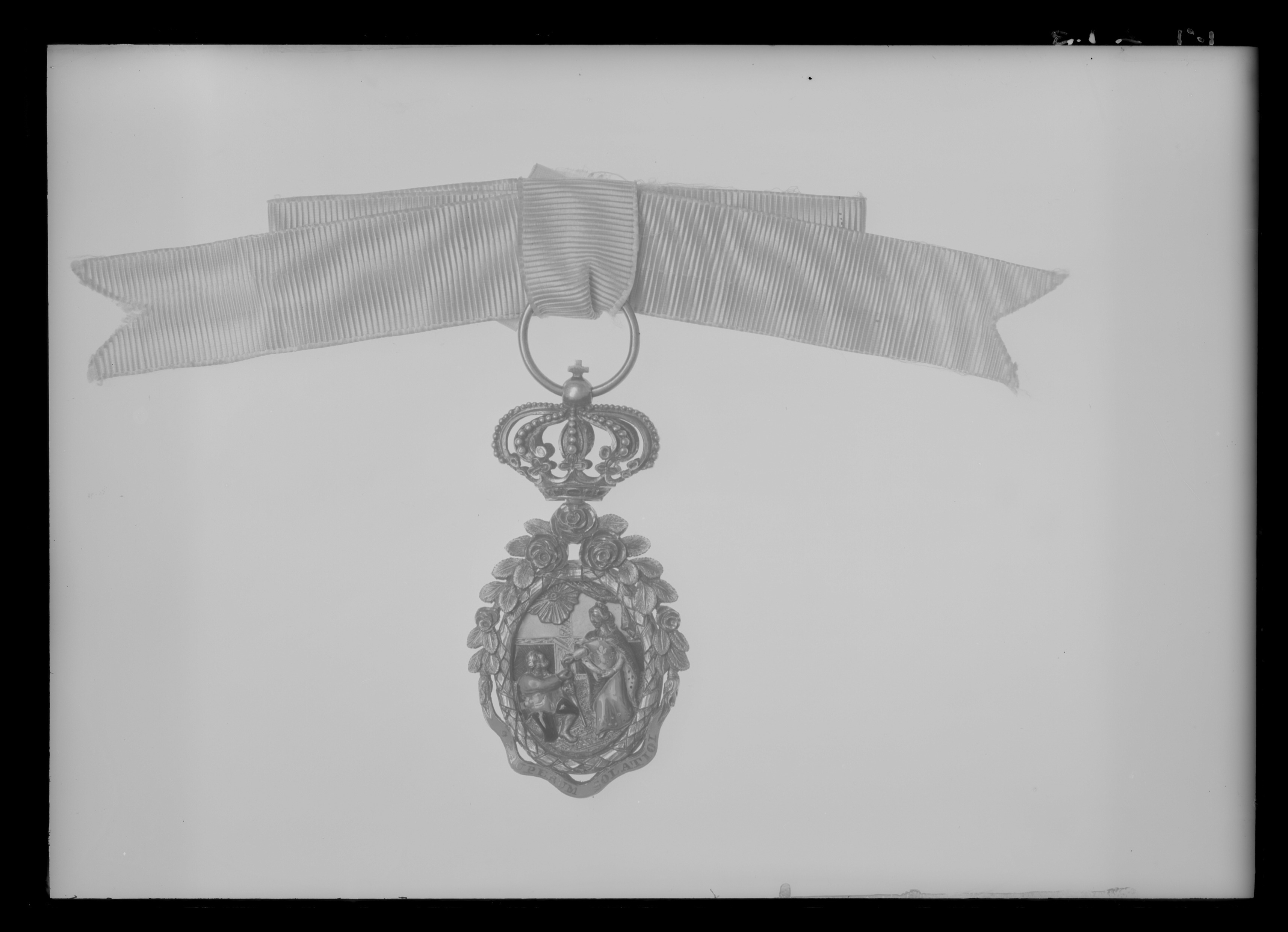 Polykrom, oval medaljong med i hög relief S:ta Isabella i blå klänning och hermelinsfodrad, röd mantel, krona på huvudet, överräckande en allmosa till en framför henne knäböjande tiggare, blå knäbyxor, grön rock, vit-svart band över axeln. I bakgrunden en en brunemaljerad balustrad, pelare med draperi, upptill till v. Guds allseende öga omgivet av strålkrans. Bagrunden vit med mönster i guld. Medaljongen omgiven av en lagerkrans i guld i hög relief, omlindad med blanka, räfflade band, lagda i kors nertill. Därutanför på övre hälften en genombruten krans av två rosenkvistar i hög relief, ihopknuten upptill med en rosett, därovanför en seraf. På kransen nertill ett emaljerat textband, ljusblå emalj, guldtext: "PAUPERUM SOLATIO". Frånsidans medaljongen täckt av vit emalj med ljusblå kantring, i den vita emaljen monogram av guld: C I, därovanför en oval lagerkrans, i den blå emaljen guldtext: "REAL ORDEM DE SANTA IZABEL", nertill över den vita och delvis över den blå ett mörkblått band med guldtext: "MDCCCI". Ovanför serafens huvud en kula, däri fäst med scharner en kunglig krona av guld samt röd och grön emalj, rödemaljerad hätta. Igenom äpplet draget en bandring av guld.