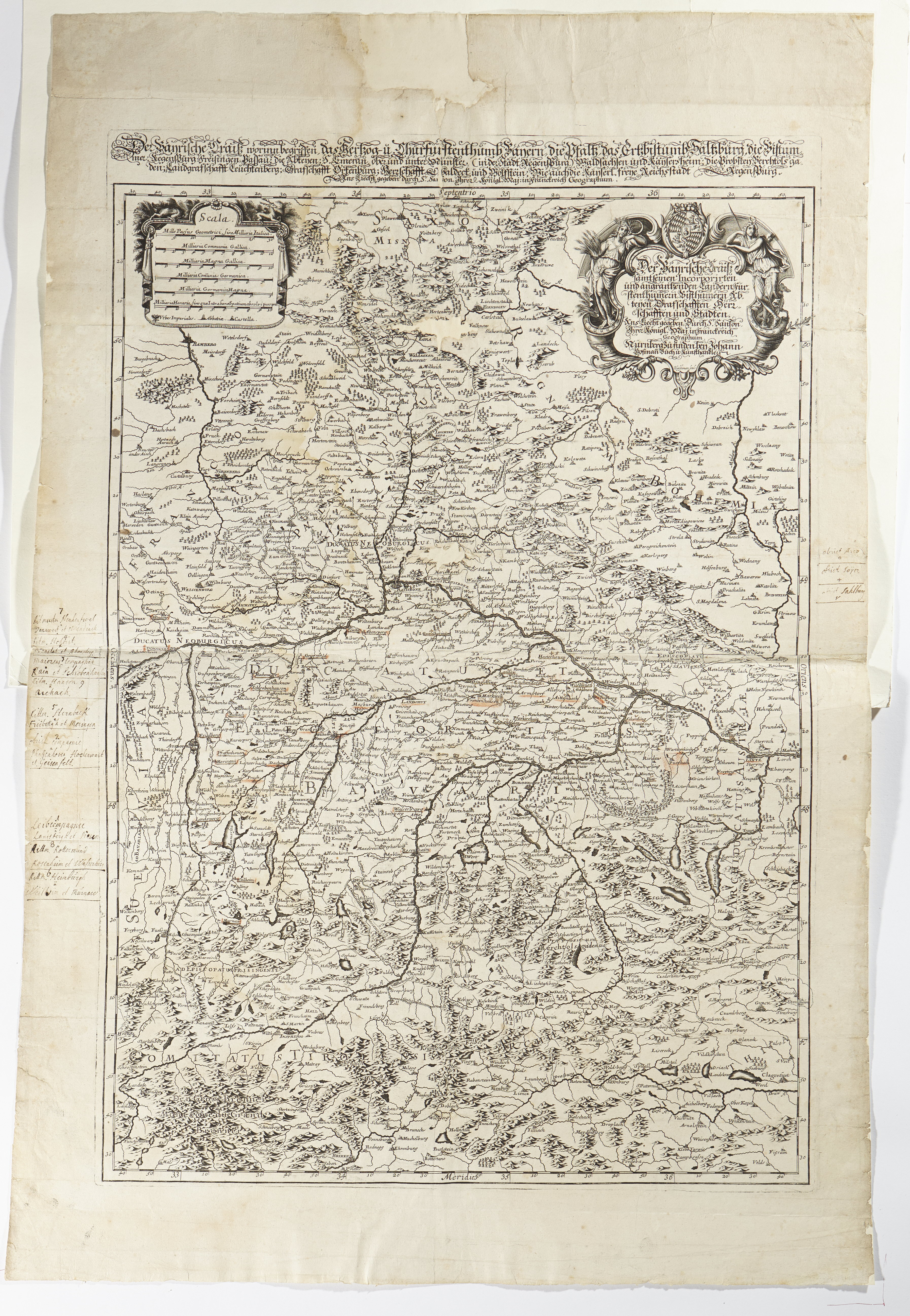 Hopklistrad i två delar. Koppartryck på papper. Troligen 1600-tal. I kartusch upptill t.h. ”Der Bayriche Krais samt seinen Incorpo risten unde angräntzenden Ländern fürstenthümen Bis thümen ab...eyen...Herzschaften und Städten ins Licht gegeben durch Sr Sanson Ihre Köngl. Majt in Frankreich Geographen Nürnberg zu finden sei Johann Hofmanns Buch und Kunsthändler”. Hipscham scul. Skala upptill t.v. Vissa orter för- eller understrukna med rödpenna och tusch på några ställen. Anteckningar med svart bläck i kanterna om tyskt befäl med kompanier, med motsvarande siffror utmärkta på kartan.
