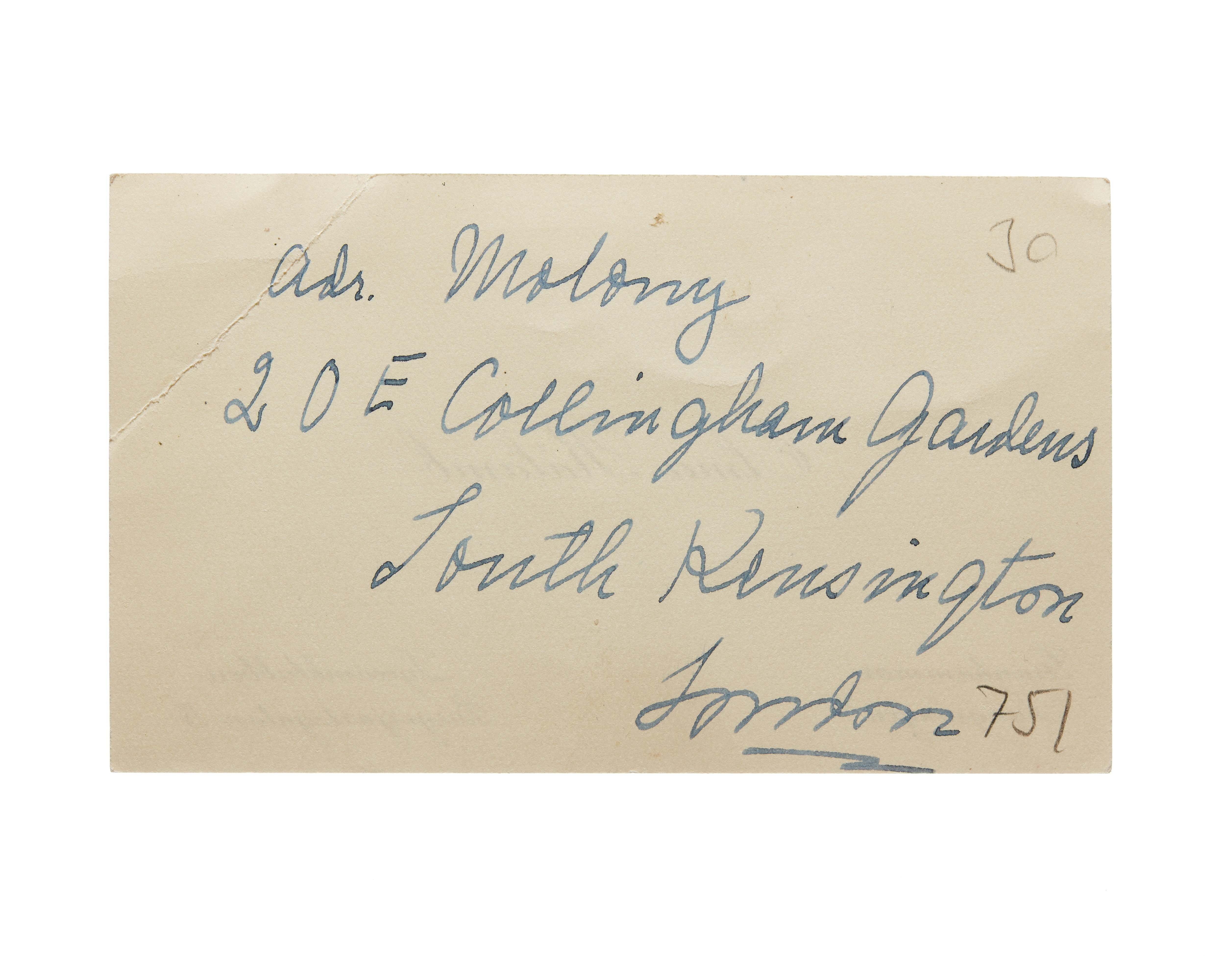 Ett visitkort från Elma Rålamb, daterat 1930, vikt i övre högra hörnet. Adress (nedre högra hörnet) Lyceumklubben Birgerjarlsgatan 5. Handskrift "...".