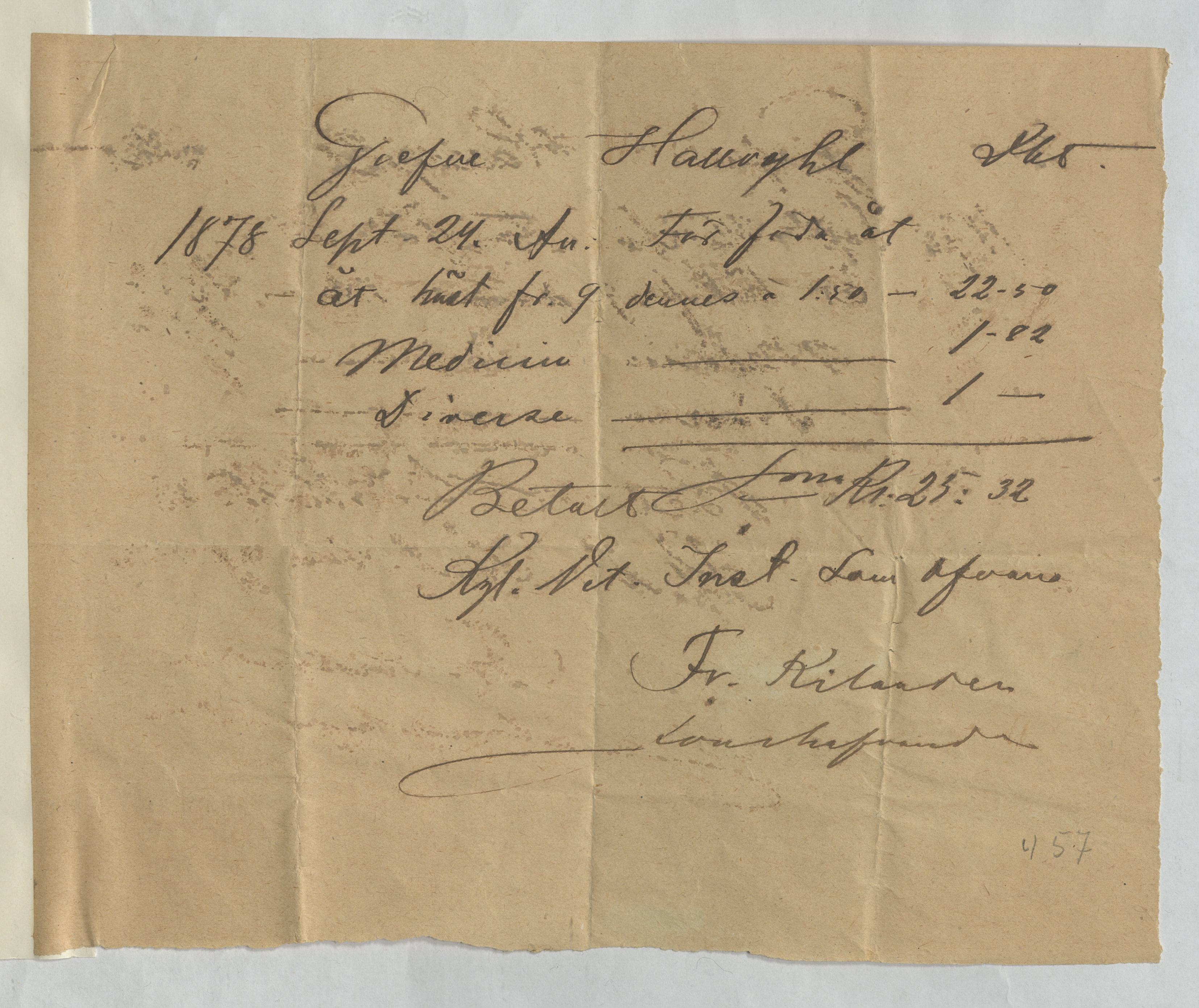 Kvitto från Kungl. Veterinär Institutet. Gällande betalning för föda åt häst.