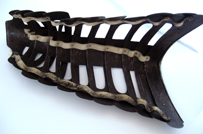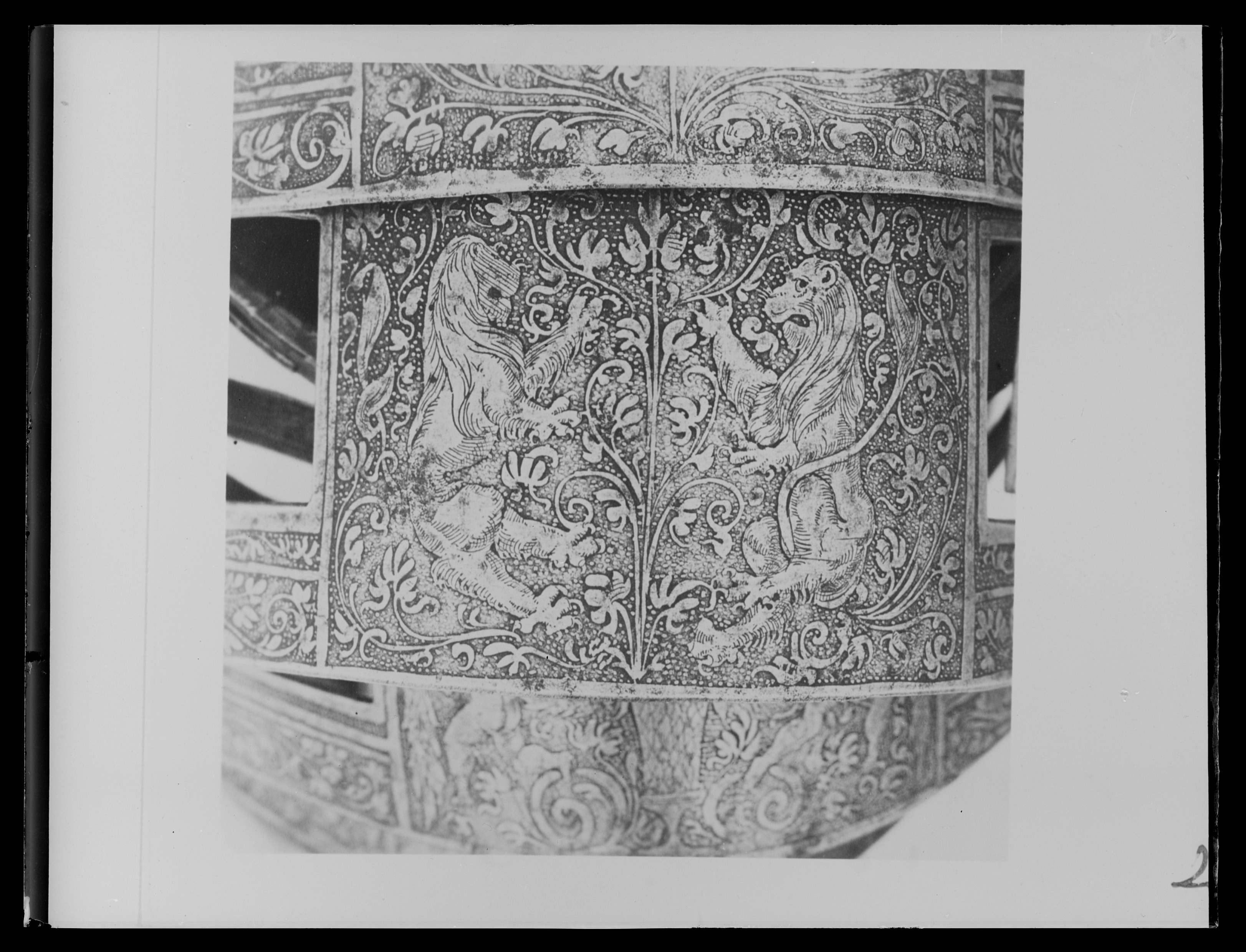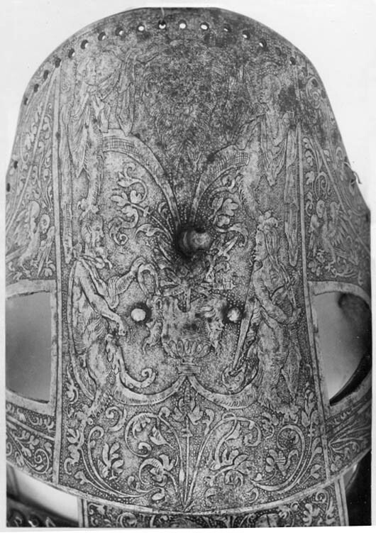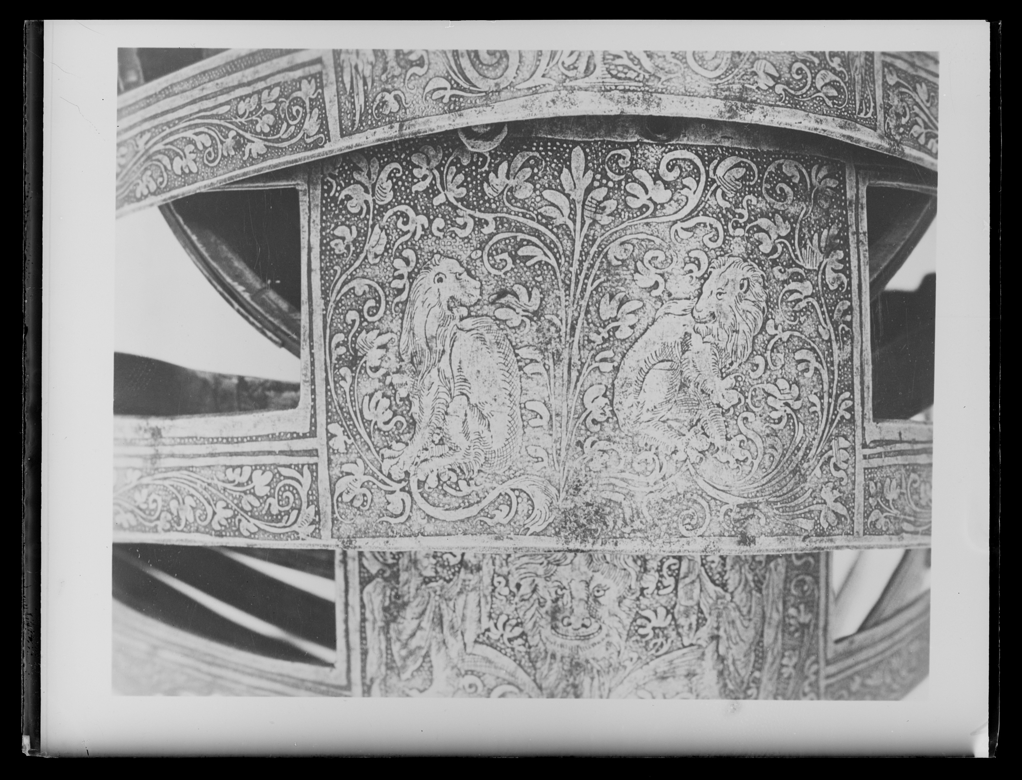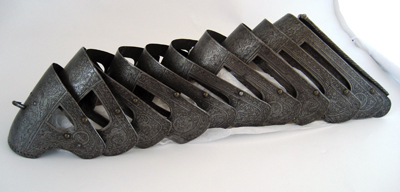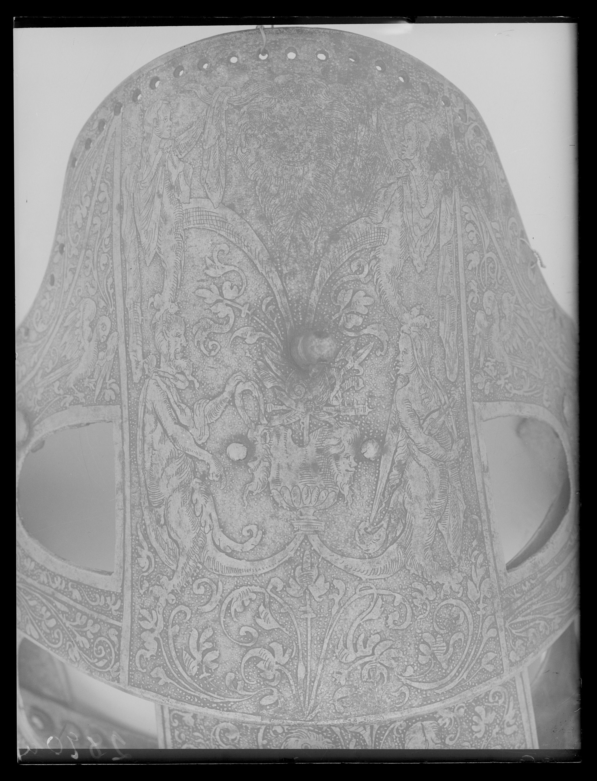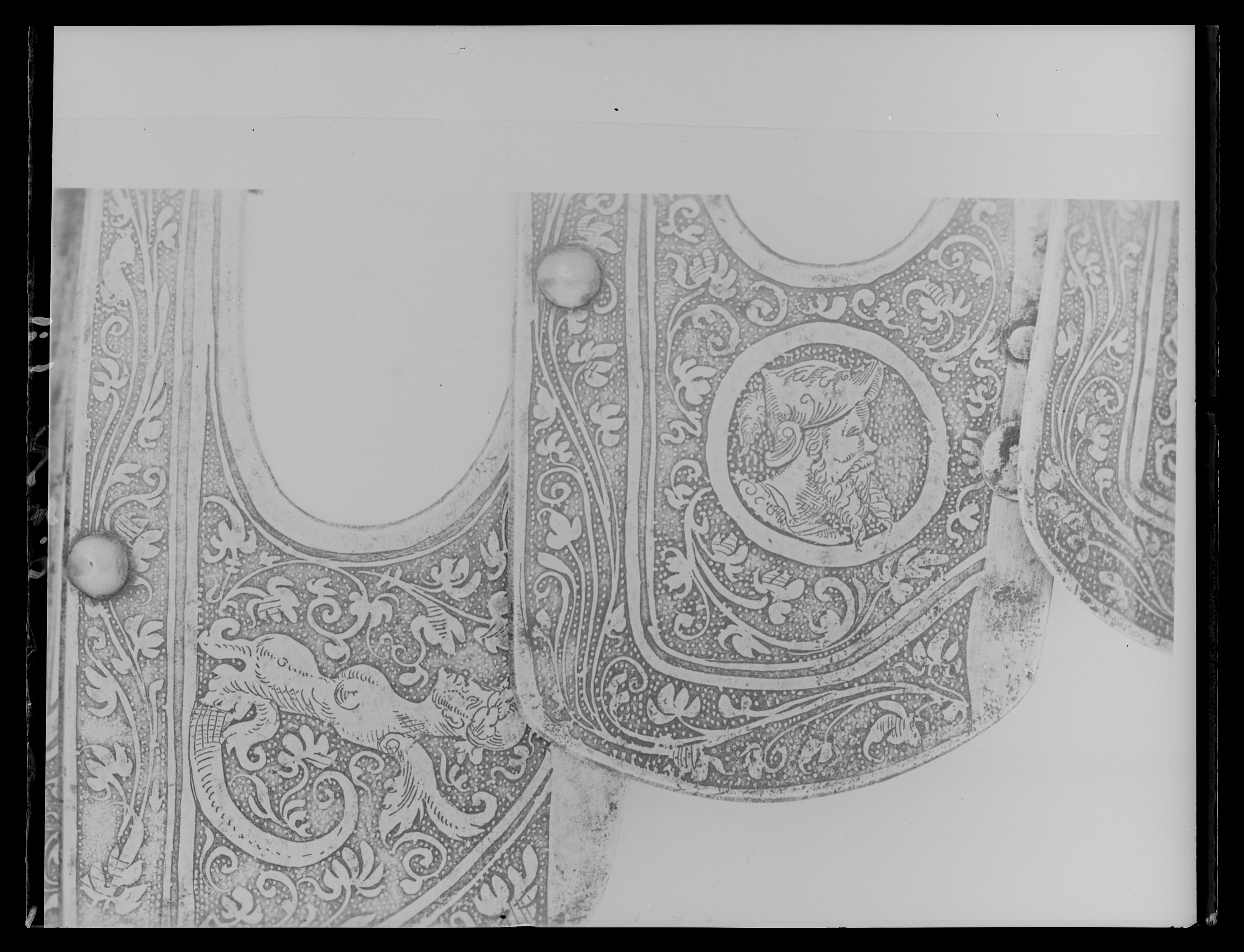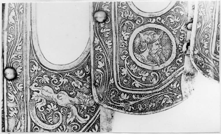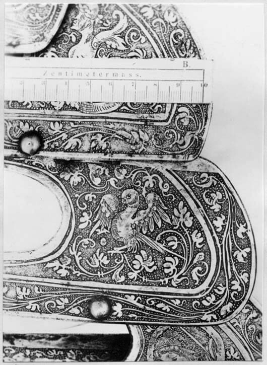 Driven stålplåt med heltäckande etsad dekor. Insidan svärtad med tydliga slagmärken. Bestående av elva U-formiga skenor ökande i längd bakåt. Skenorna lagda omlott och sammanfogade i varandra med längsgående 25 mm breda band av gulvitt sämskat skinn, fästade med en nit i var skena. På var sida en urtagning, rektangulär med rundad nedre kant och vid sidan om denna en dekorativ nit med kullrig gulmetallhätta. Kanterna nertill lätt rundade och baktill fasade. Första skenan med insvängda sidor, i mitten 24 mm långt spärrstift och längs yttre kanten genomgående hål i rad. Sista skenans yttre kant omvikt, rundsmidd och repstavsfilad, bredd ca 15 mm. Etsad dekor, blanka figurer mot mörk bakgrund. På nedre delen fabliska djur och porträtt inom ovaler, omgärdat av slingrande växtrankor. På övre delen olika motiv som stående lejon ställda mot varandra och mytologiska scener, allt omgärdat av slingrande rankor.
