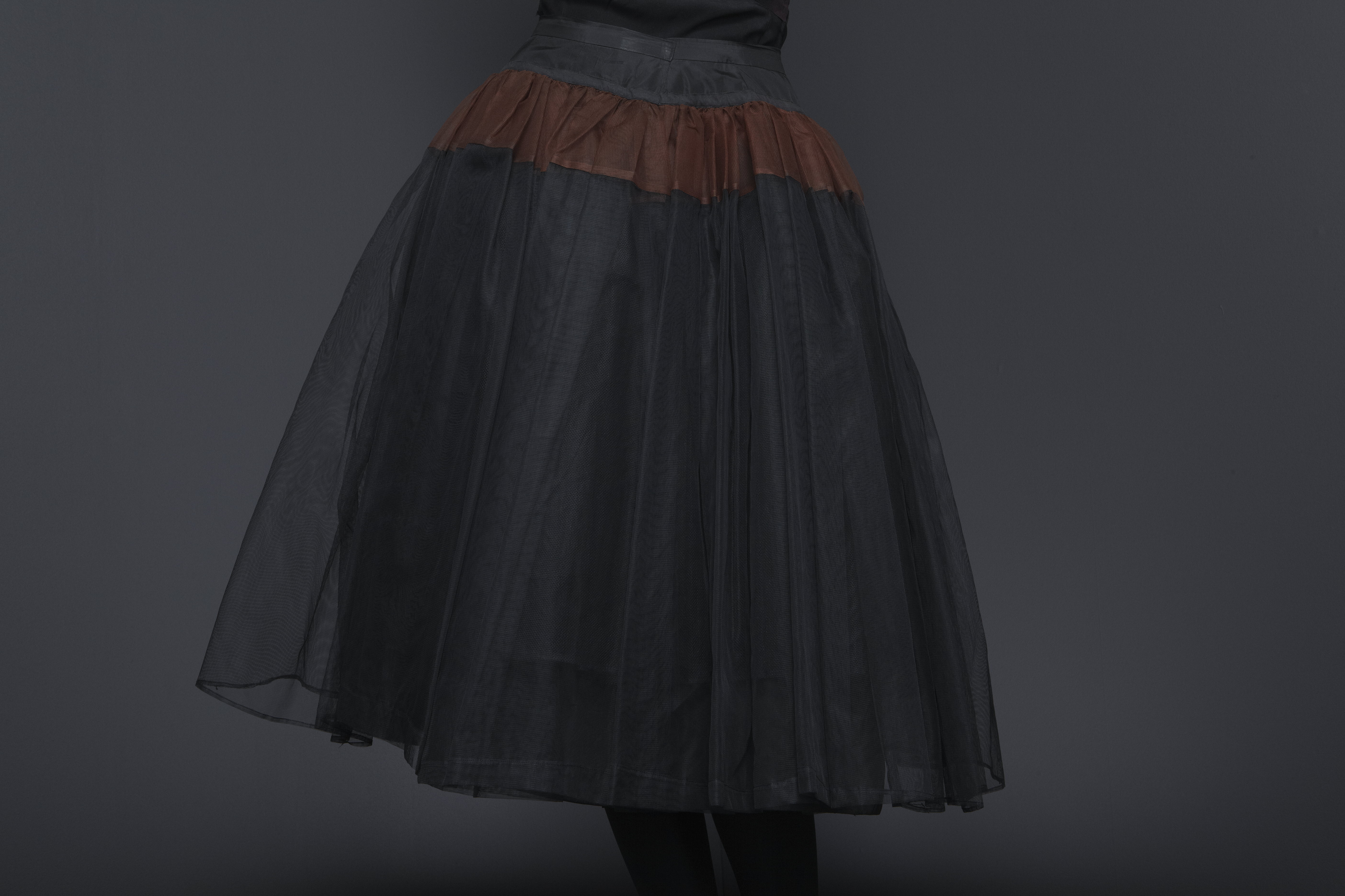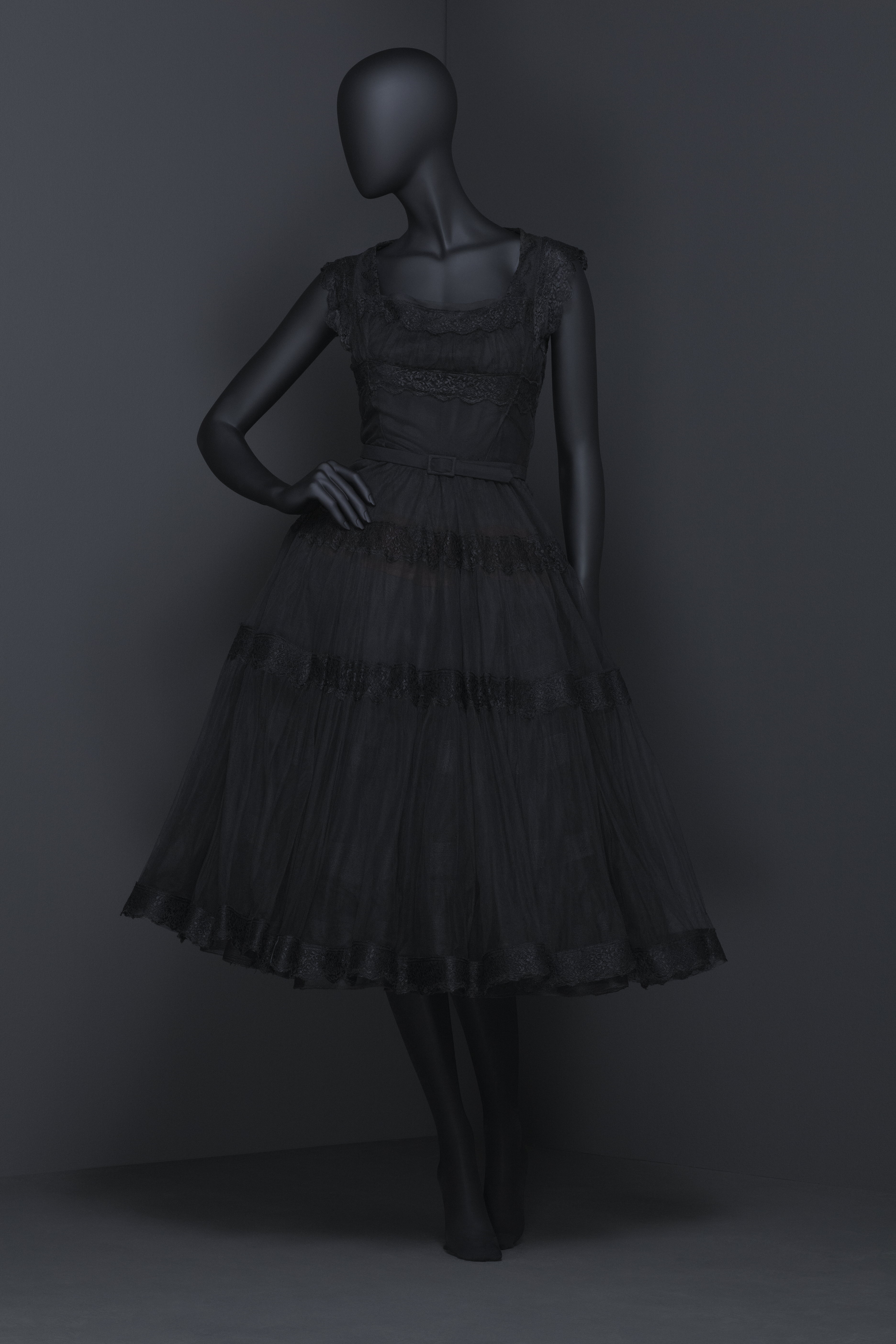 Kort, ärmlös middagsklänning med livsöm av svart tyll. Fyrkantig urringning. Dubbel rundskuren kjol. Livet med två horisontella våder. Den övre dubbel och rynkad. Våderna sammanfogade med 40 mm bred spets med broderat blommönster. Ärmhålen kantade med två rader spets. I vänster sida från ärmhålet ett 350 mm långt blixtlås. Yttre kjolen med tre horisontella våder sammanfogade med 40 mm bred spets. Den övre våden 115 mm, den mellersta 170 mm, den nedersta 360 mm. Den nedersta spetsen fodrad med stelt 46 mm bred rutvävt band av tunn plasttråd. Den inre kjolen av tyll med styvnadsband, 50 mm bred, två rader över höfterna. Mitt på en rad och nedtill tre rader. De två nedersta raderna tätt intill varandra utmed nederkanten.Sydda på en lös våd 160 mm bred och fastsydda utanpå kjolen. Invändigt i midjan ett svart ripsband 16 mm brett. Knäppt vid blixtlåset med hake och hyska. I vardera sidan påsydda hängare.