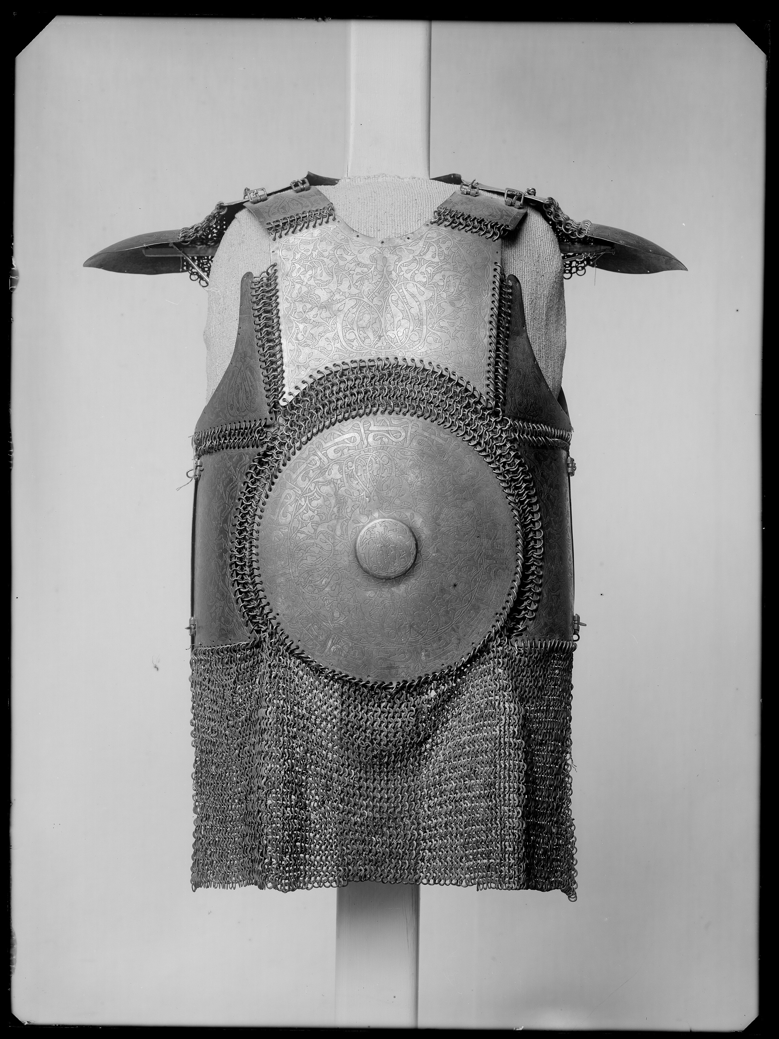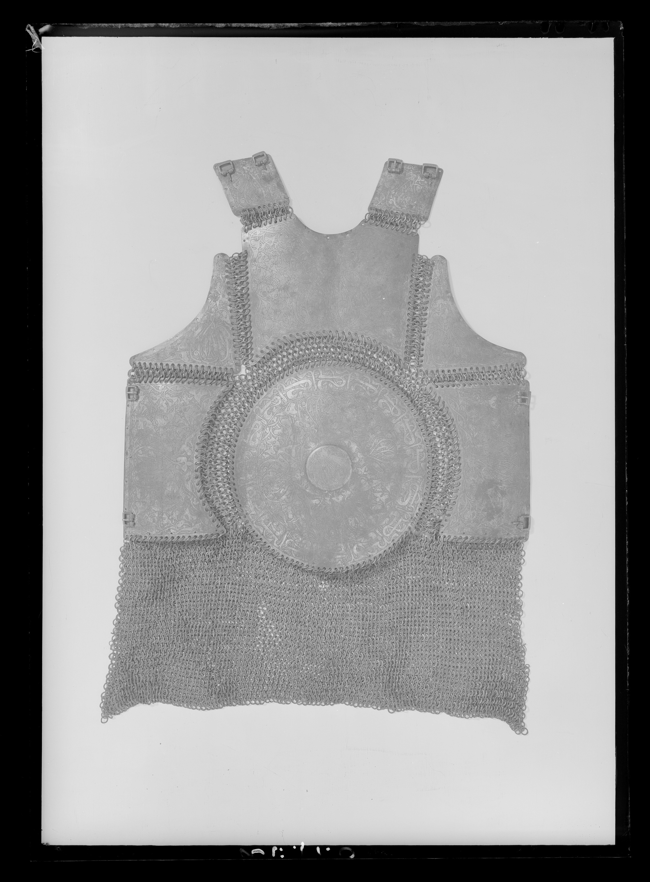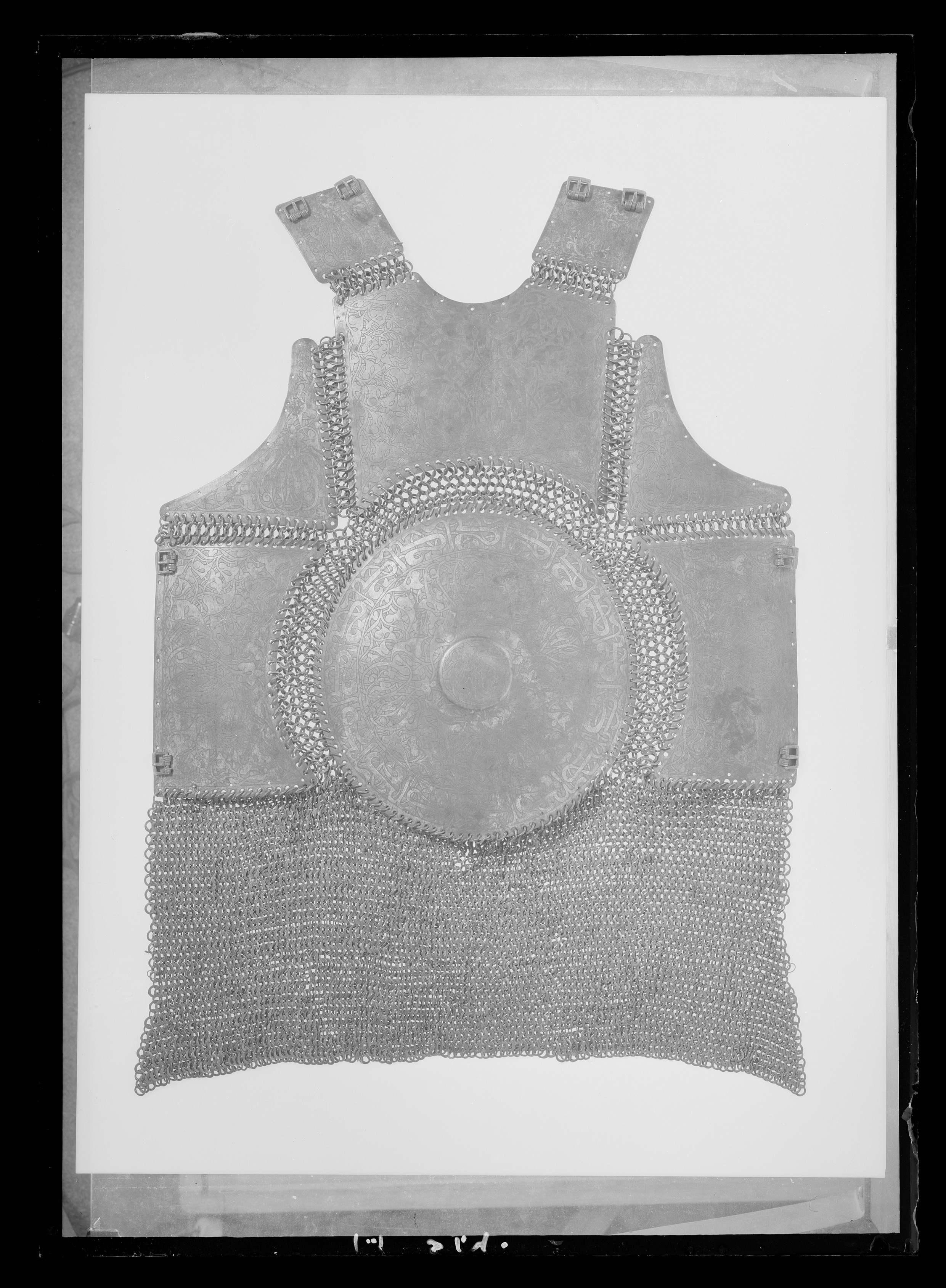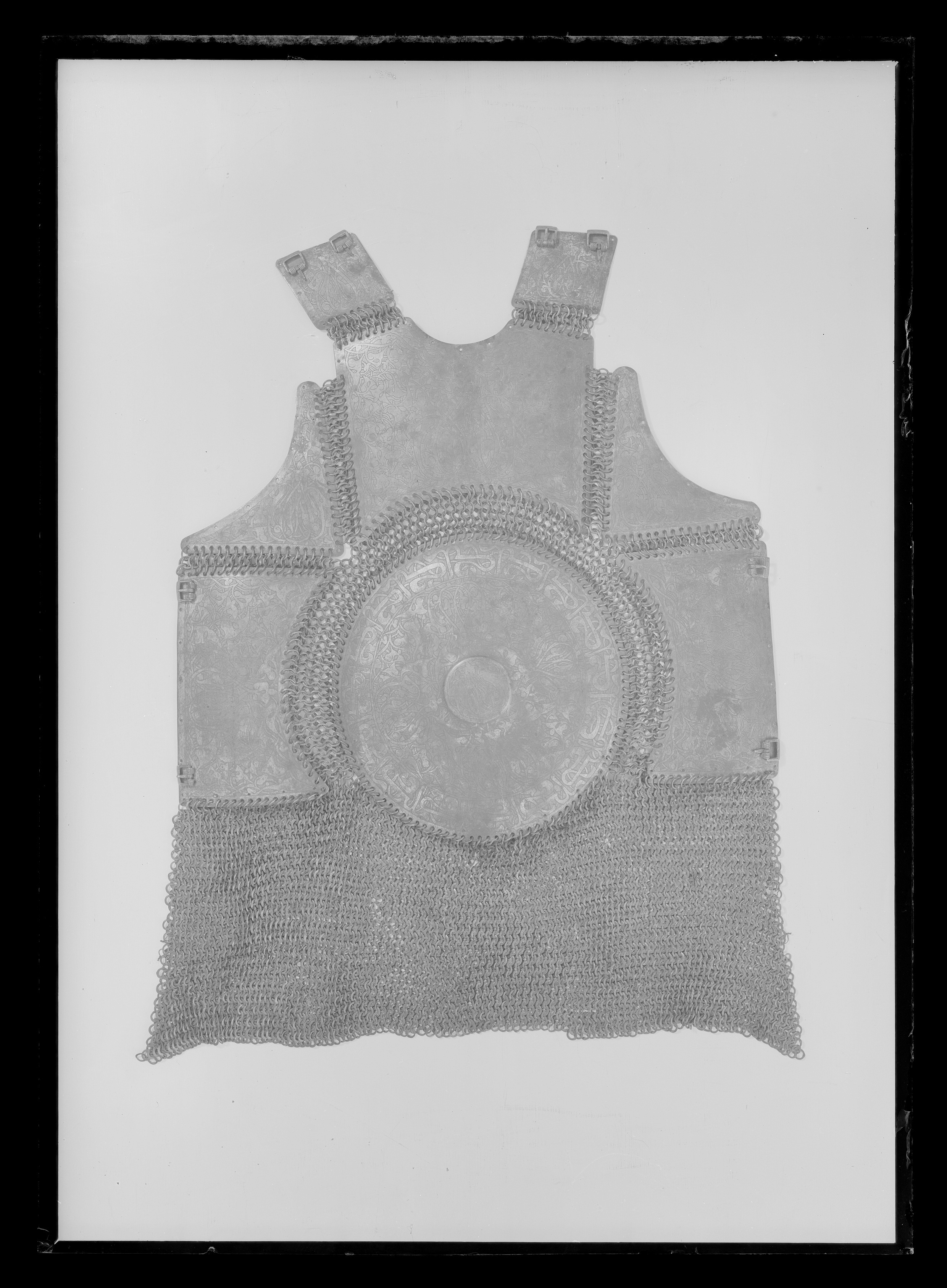 Av två separata stycken, rygg resp. bröst. Bröststycke av åtta plåtar, svagt välvda, drivna i stål och sammanlänkade med ringpansar. Överst två rombiska plåtar med i kanterna sju hål. I plattans övre kant två spännen av stål, l 18 mm, b 17 mm, fyrkantig ram med främre kanten plattad och vinklad nedåt. Fäst i två klackar med dekor av fyra graverade linjer. Nedanför, bröstplatta med upptill rundad urtagning för halsen, i kanten fem hål. Raka svagt avsmalnande kanter med nertill konkav urtagning. Under denna rund, svagt välvd plåt, diam 248 mm, med i mitten driven förhöjning, rund med platt ovansida, diam 55 mm. Kantbård, b 25 mm, av dekorativa, repeterande och förvanskade arabiska skrivtecken. I sidorna två plåtar ställda över varandra. Översta med utåt rundad urtagning för armen, och med sju kanthål. Undre plåten rektangulär med konkav urtagning åt insidan, l 195 mm. Sju hål i kanten. I yttre kant två spännen (lika som ovan). Ryggstycke av tio olikformade plåtar av drivet stål sammanlänkade med ringpansar. Tre över ryggen, och efter denna formade, plåtar. Översta plåten med rundad urtagning med uppvikt kant, h ca 4 m, för nacken. I kanten åtta hål. Raka sidor med hål i rad med vidhängande ringpansar som fäster i axelstyckena. I ena kanten del av tapp/nit. Mittenstycket fäster i övre kanterna. Raka och nedåt avsmalnande sidor. Nedersta stycket fäster på liknade sätt. Raka avsmalnande sidor med i undre sidan konkav urtagning. I mitten nertill rund plåt med i mitten driven rund och platt förhöjning. Runt denna i var sida två över vandra ställda plåtar. Övre triangulär med en spets inåt. Undre plåten rektangulär med åt insidan konkav urtagning. I ytrre kant sex hål. Axelplåtarna välvda med raka kanter och nedåt avsmalnande sidor som möts i en spets, likt en sköld. Sammanlagt åtta hål i kanterna. Ringpansaret av runda lätt plattade ringar med bredare överlappande ändar, diam 8,5 mm. Sammansmidda med genomgående nit. Nedre delen, l ca 205 mm, av bröststyckets ringar är av annan typ än övriga. Runda platta, diam 6 mm, med bredare överlappande ändar. Plåtarnas yta med heltäckande dekor av persiskt moreskmönster av 1500-tals karaktär (Steneberg s. 128). Mönstret brännförgyllt med graverade kanter mot prickpunsad bakgrund.