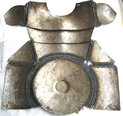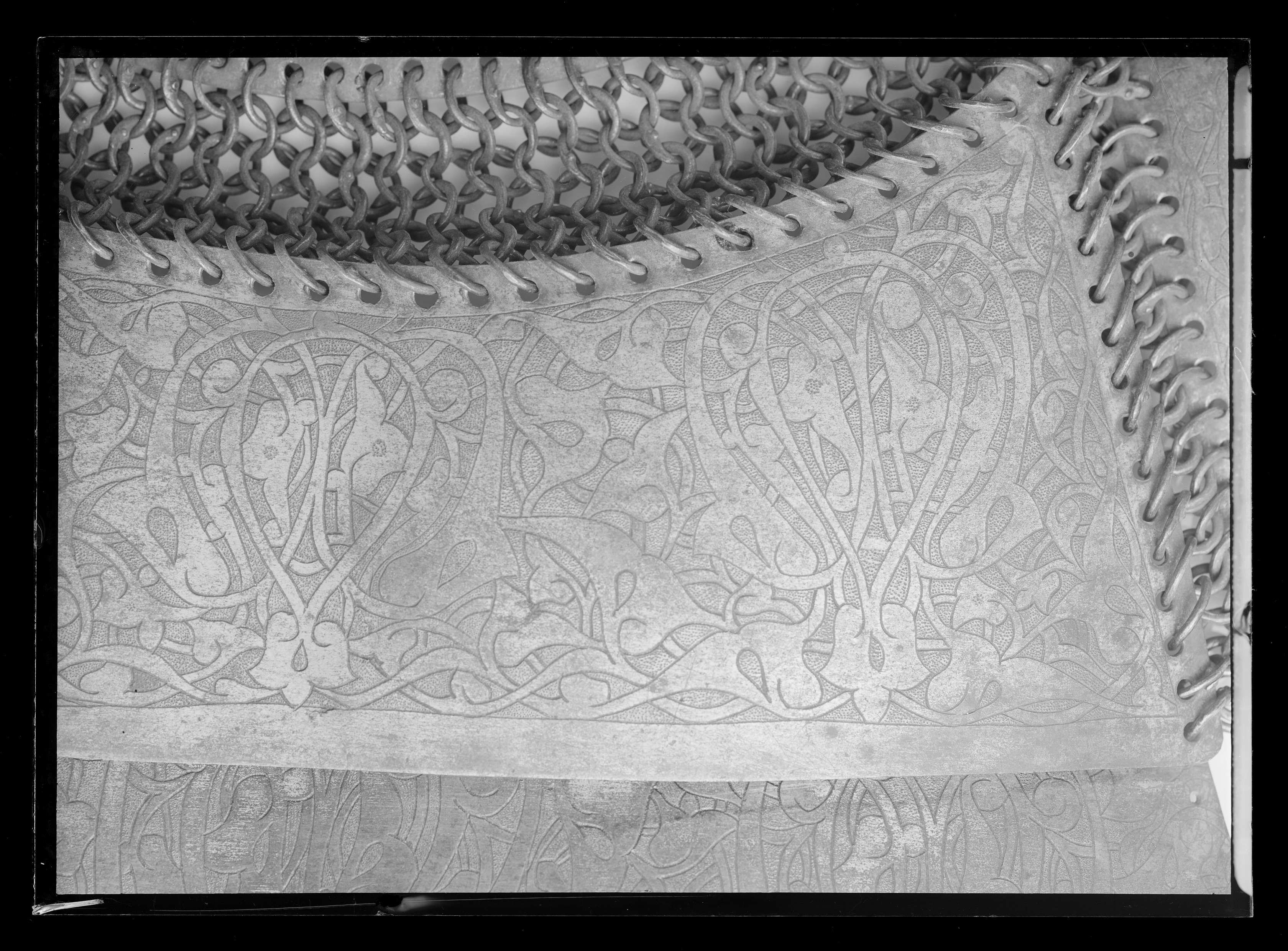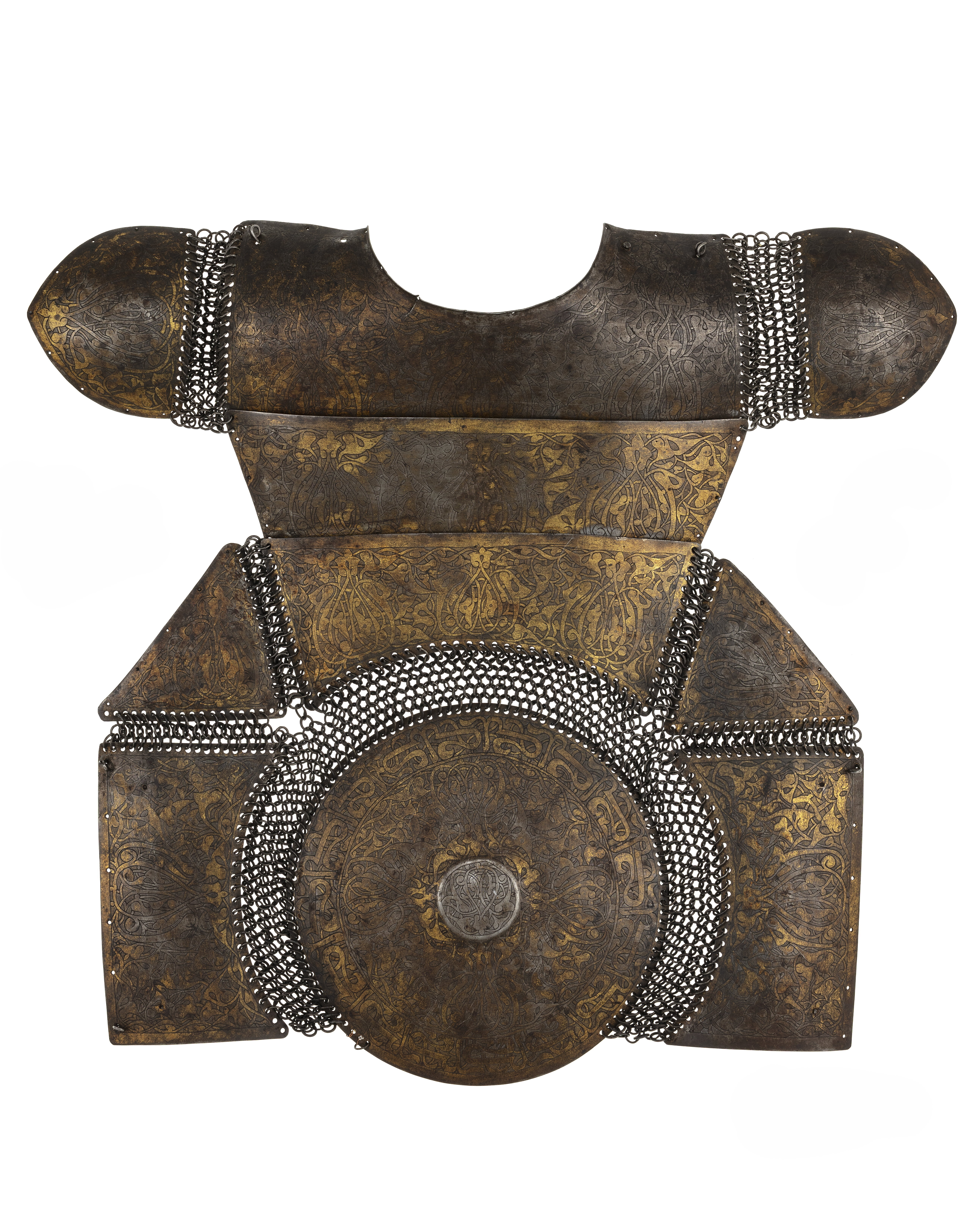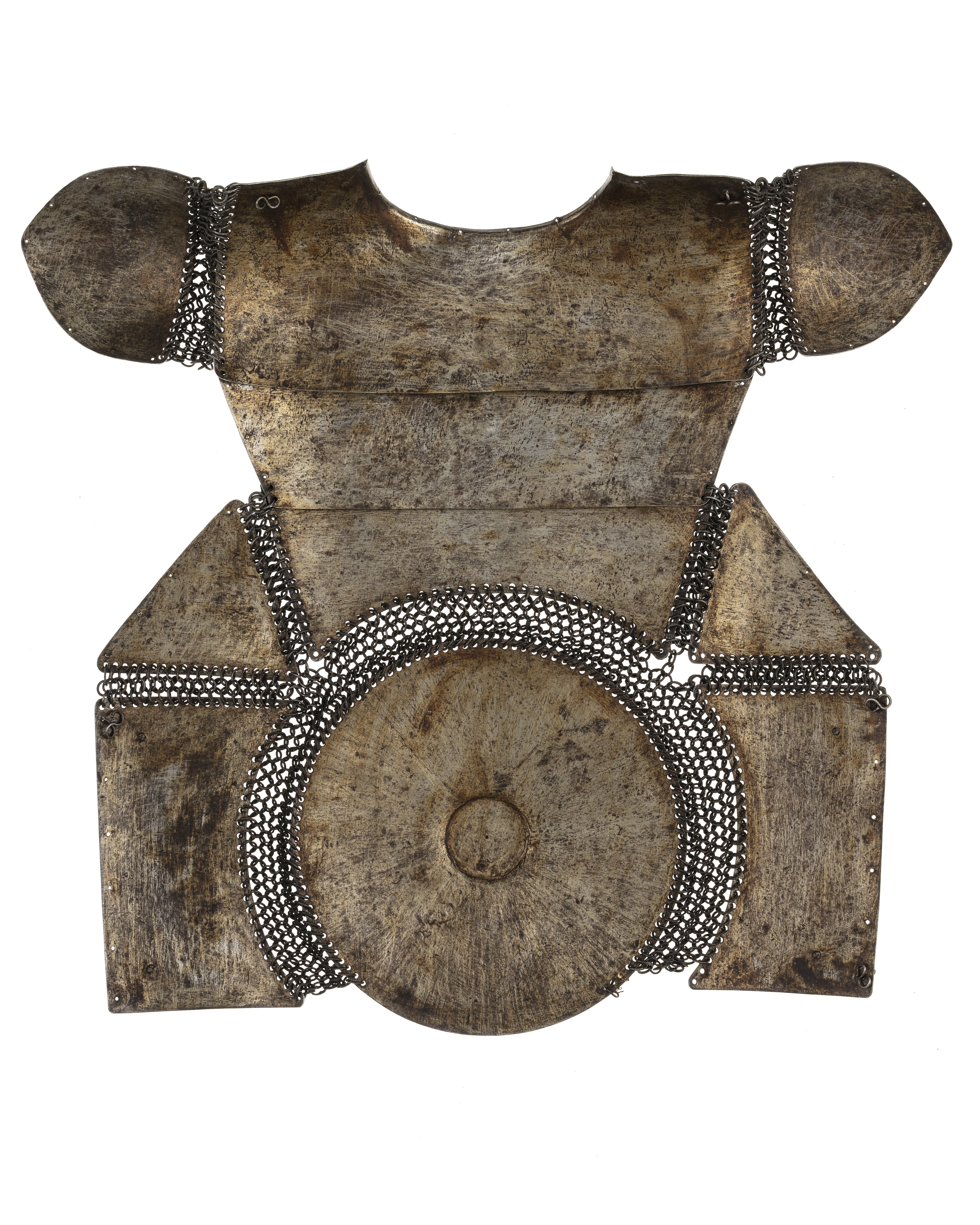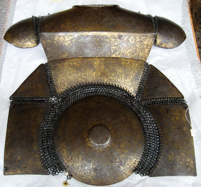 Av två separata stycken, rygg resp. bröst. Bröststycke av åtta plåtar, svagt välvda, drivna i stål och sammanlänkade med ringpansar. Överst två rombiska plåtar med i kanterna sju hål. I plattans övre kant två spännen av stål, l 18 mm, b 17 mm, fyrkantig ram med främre kanten plattad och vinklad nedåt. Fäst i två klackar med dekor av fyra graverade linjer. Nedanför, bröstplatta med upptill rundad urtagning för halsen, i kanten fem hål. Raka svagt avsmalnande kanter med nertill konkav urtagning. Under denna rund, svagt välvd plåt, diam 248 mm, med i mitten driven förhöjning, rund med platt ovansida, diam 55 mm. Kantbård, b 25 mm, av dekorativa, repeterande och förvanskade arabiska skrivtecken. I sidorna två plåtar ställda över varandra. Översta med utåt rundad urtagning för armen, och med sju kanthål. Undre plåten rektangulär med konkav urtagning åt insidan, l 195 mm. Sju hål i kanten. I yttre kant två spännen (lika som ovan). Ryggstycke av tio olikformade plåtar av drivet stål sammanlänkade med ringpansar. Tre över ryggen, och efter denna formade, plåtar. Översta plåten med rundad urtagning med uppvikt kant, h ca 4 m, för nacken. I kanten åtta hål. Raka sidor med hål i rad med vidhängande ringpansar som fäster i axelstyckena. I ena kanten del av tapp/nit. Mittenstycket fäster i övre kanterna. Raka och nedåt avsmalnande sidor. Nedersta stycket fäster på liknade sätt. Raka avsmalnande sidor med i undre sidan konkav urtagning. I mitten nertill rund plåt med i mitten driven rund och platt förhöjning. Runt denna i var sida två över vandra ställda plåtar. Övre triangulär med en spets inåt. Undre plåten rektangulär med åt insidan konkav urtagning. I ytrre kant sex hål. Axelplåtarna välvda med raka kanter och nedåt avsmalnande sidor som möts i en spets, likt en sköld. Sammanlagt åtta hål i kanterna. Ringpansaret av runda lätt plattade ringar med bredare överlappande ändar, diam 8,5 mm. Sammansmidda med genomgående nit. Nedre delen, l ca 205 mm, av bröststyckets ringar är av annan typ än övriga. Runda platta, diam 6 mm, med bredare överlappande ändar. Plåtarnas yta med heltäckande dekor av persiskt moreskmönster av 1500-tals karaktär (Steneberg s. 128). Mönstret brännförgyllt med graverade kanter mot prickpunsad bakgrund.