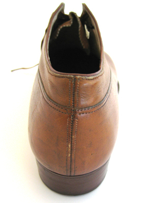 Snörsko, höger, av ljusbrunt skinn. Rundad tå med tåhätta och med en brogue. Runtom skon, bak runtom hälen och fram över ovanlädret löper en dubbel söm. Skon är ihopspannad mitt bak och har på vardera sida en kantande dekorsöm. Snörning mitt fram bestående av sex snörhål kantade med brun plast. Genom snörhålen är trätt ett skosnöre av ett 5 mm brett brunt bomullsband. En svängd dekorsöm på vardera sida om snörningen. Mitt fram en på insidan påsydd plös av ljusbrunt skinn, taggad i kanten. Sulan är av brunt pressat skinn, framtill randsydd. En s-formad ristning mitt under sulan framme vid tån. Sulan är 95 mm bred som bredast och 4 mm tjock. Klacken är 26 mm hög, 56 mm bred och 56 mm lång. Klacken har en randad dekor i övre kanten. Nubben är synlig under klacken. Skon är på insidan fodrad med gult linnetyg och med en extra förstärkning av vitt skinn bak. Innersulan är av brunt skinn och med en extra förstärkning av vitt skinn bak.