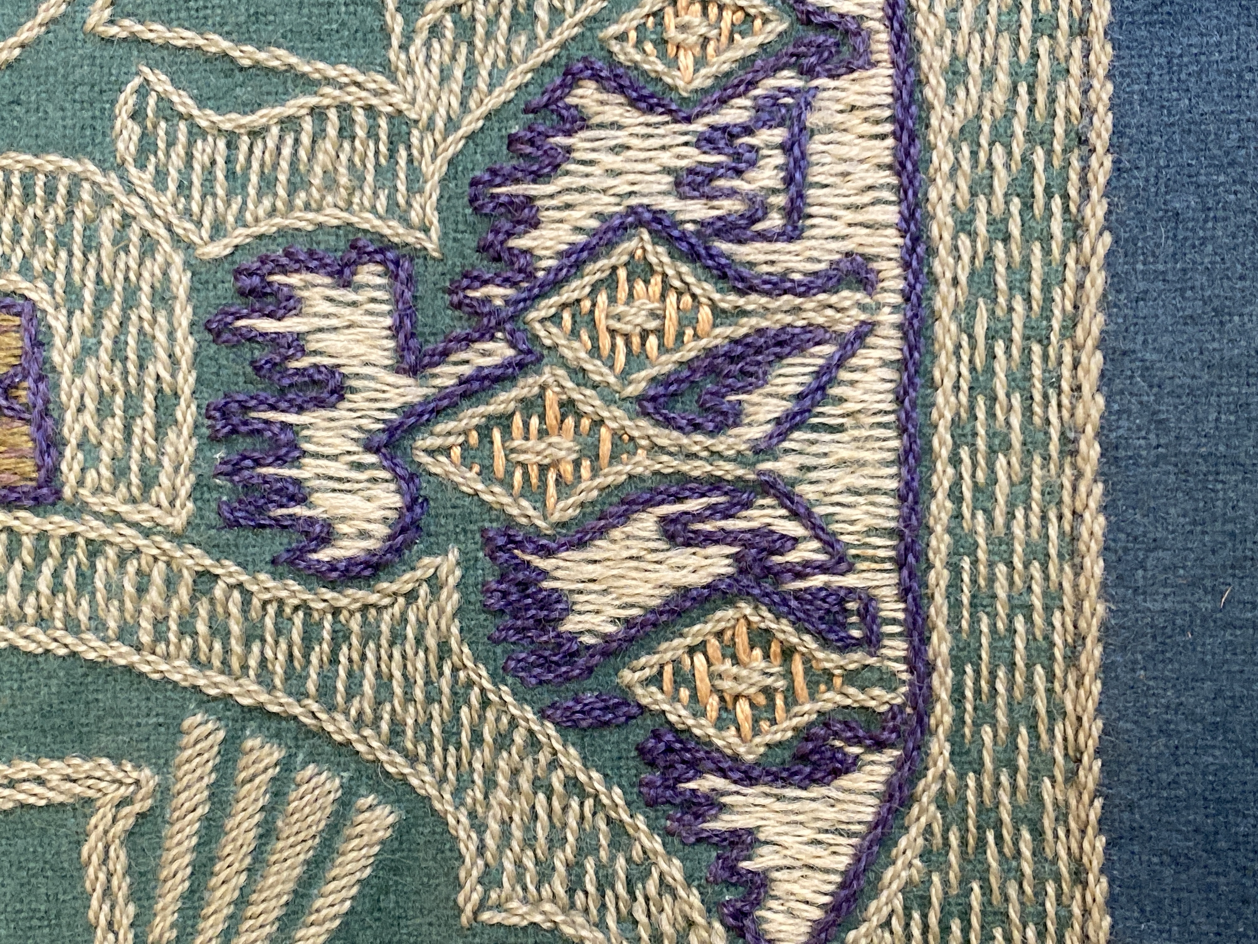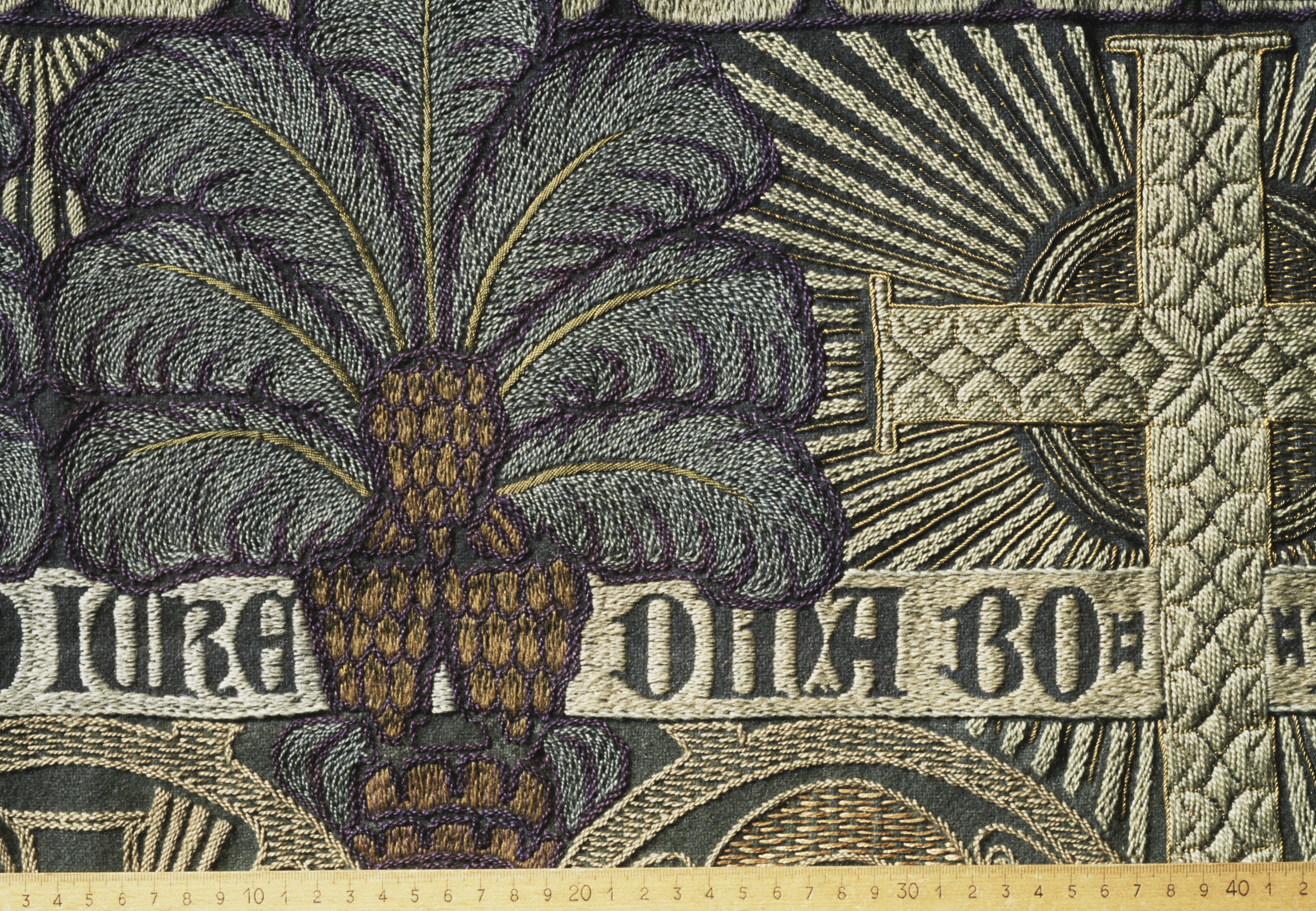 Blågrönt och grönt ylletyg. Broderade dekor, i mitten kors flankerat av palmer, evangelistsymboler. Grönt bomullssatinfoder. Sofia Gisberg, Licium. Deponerad 1988.