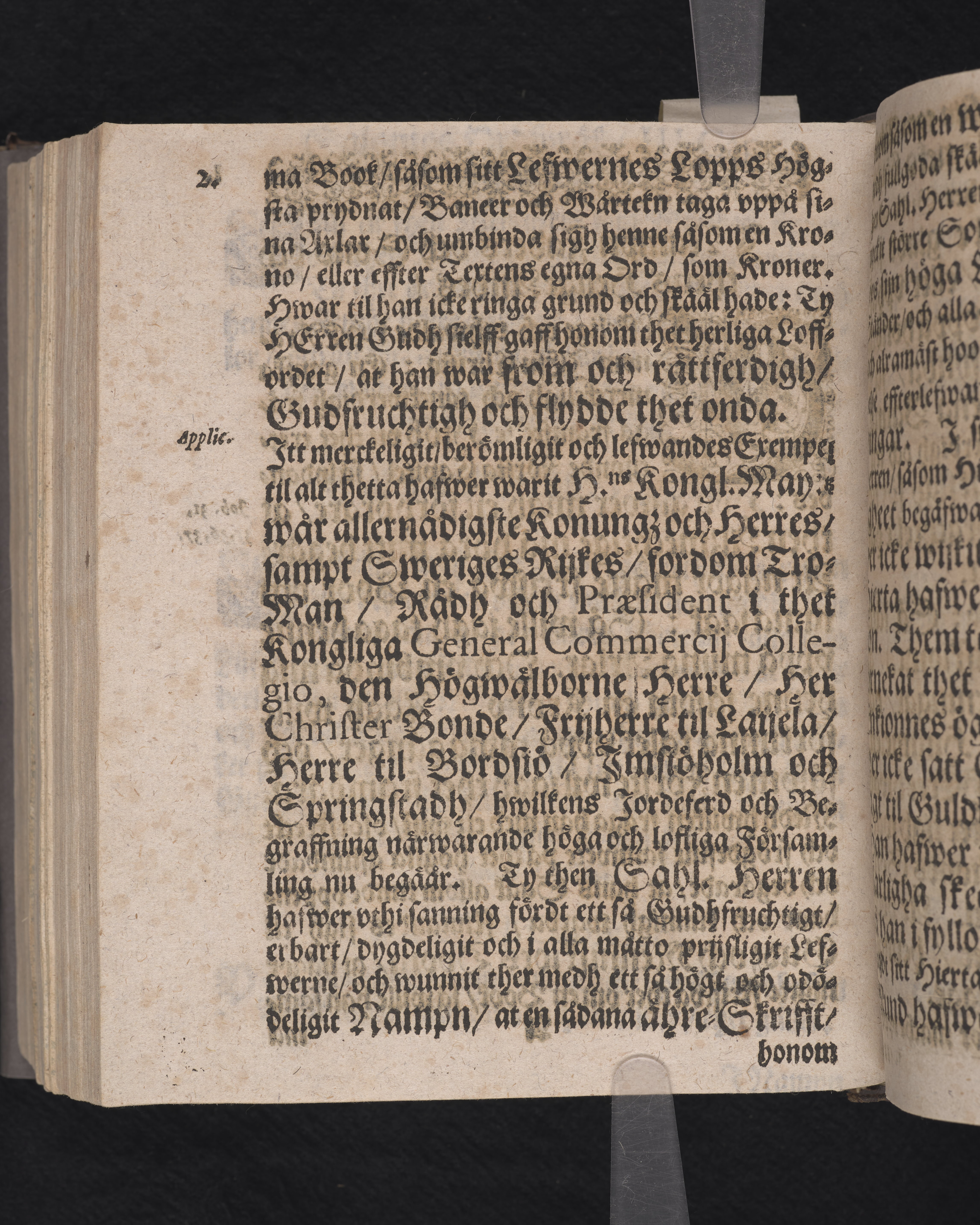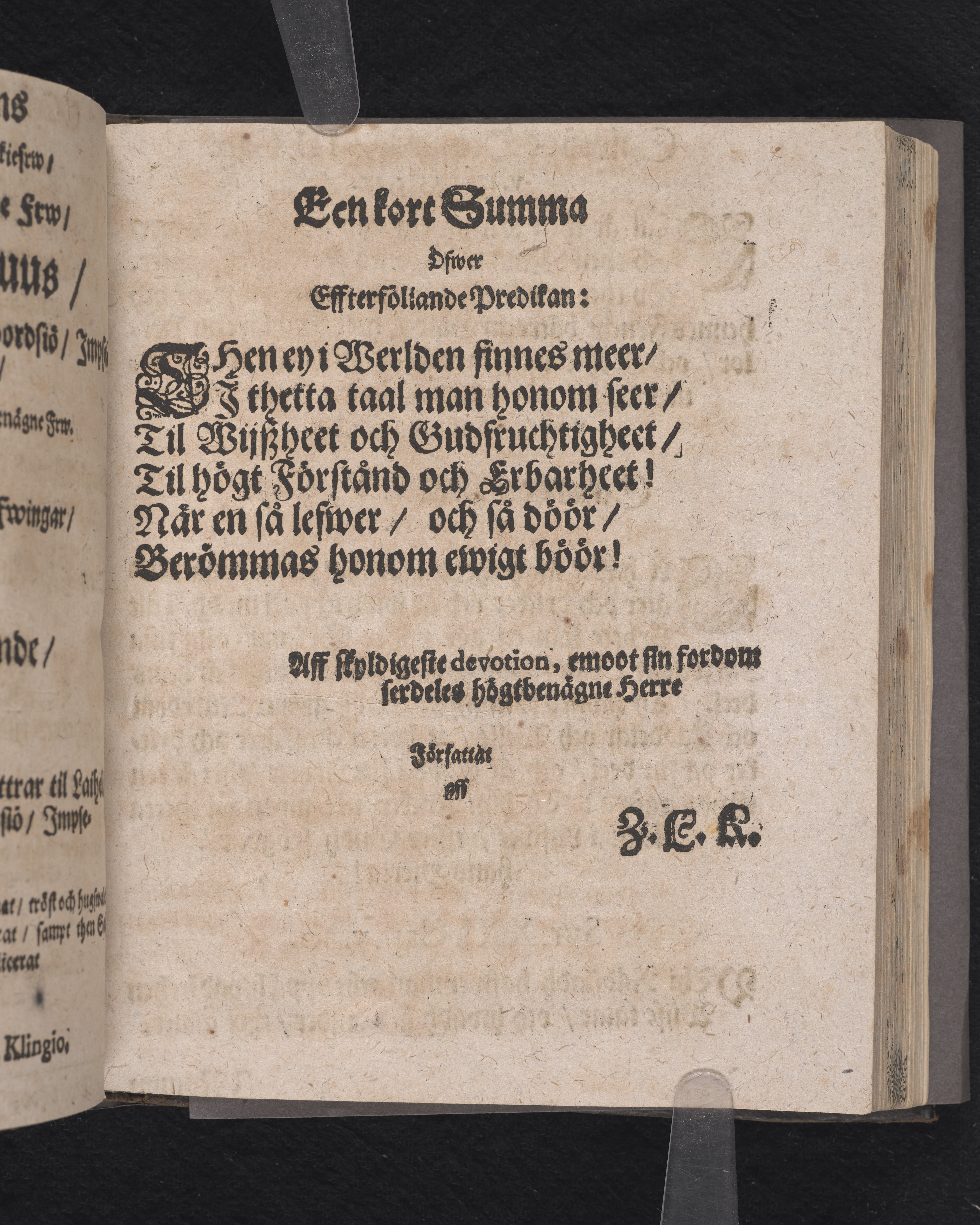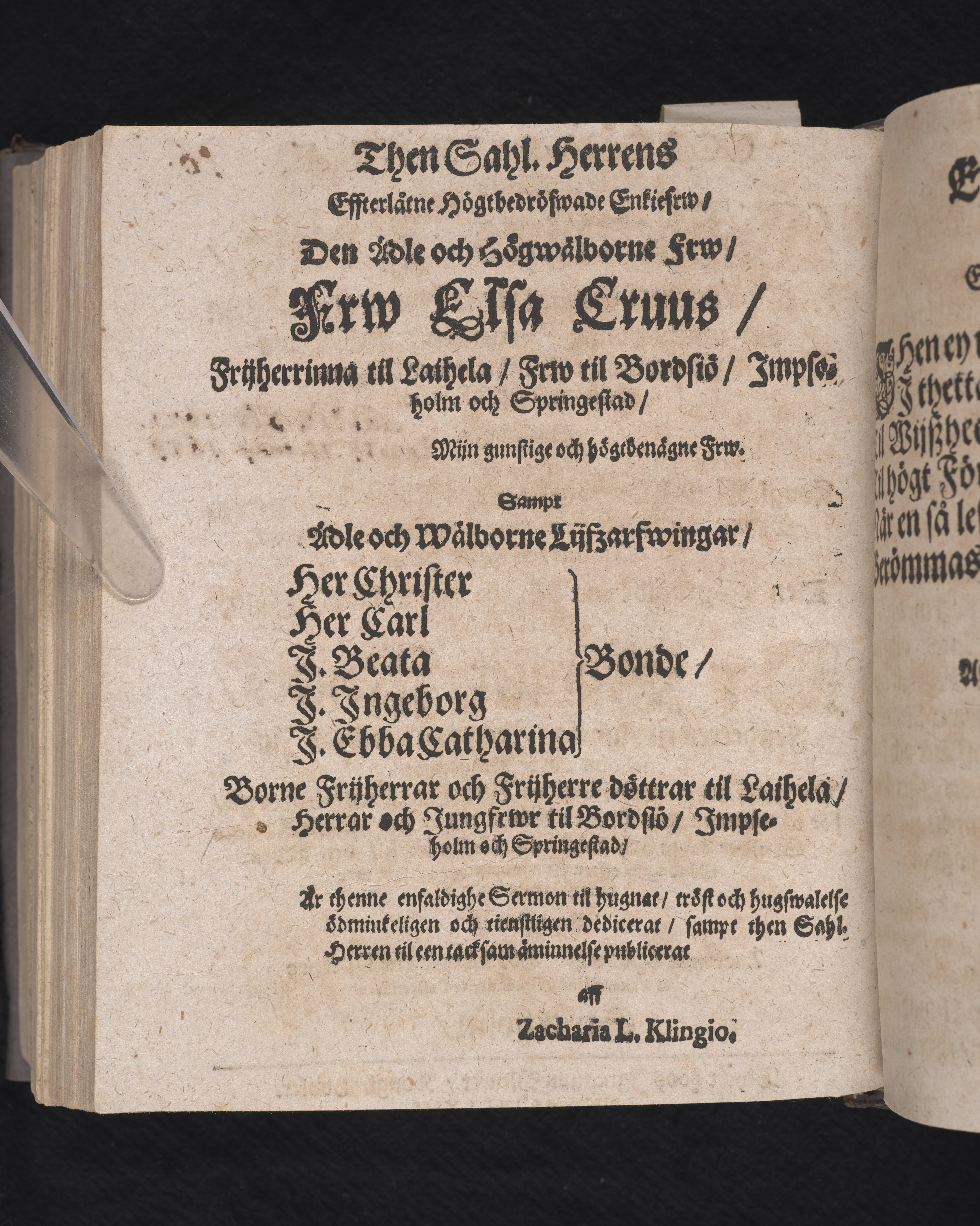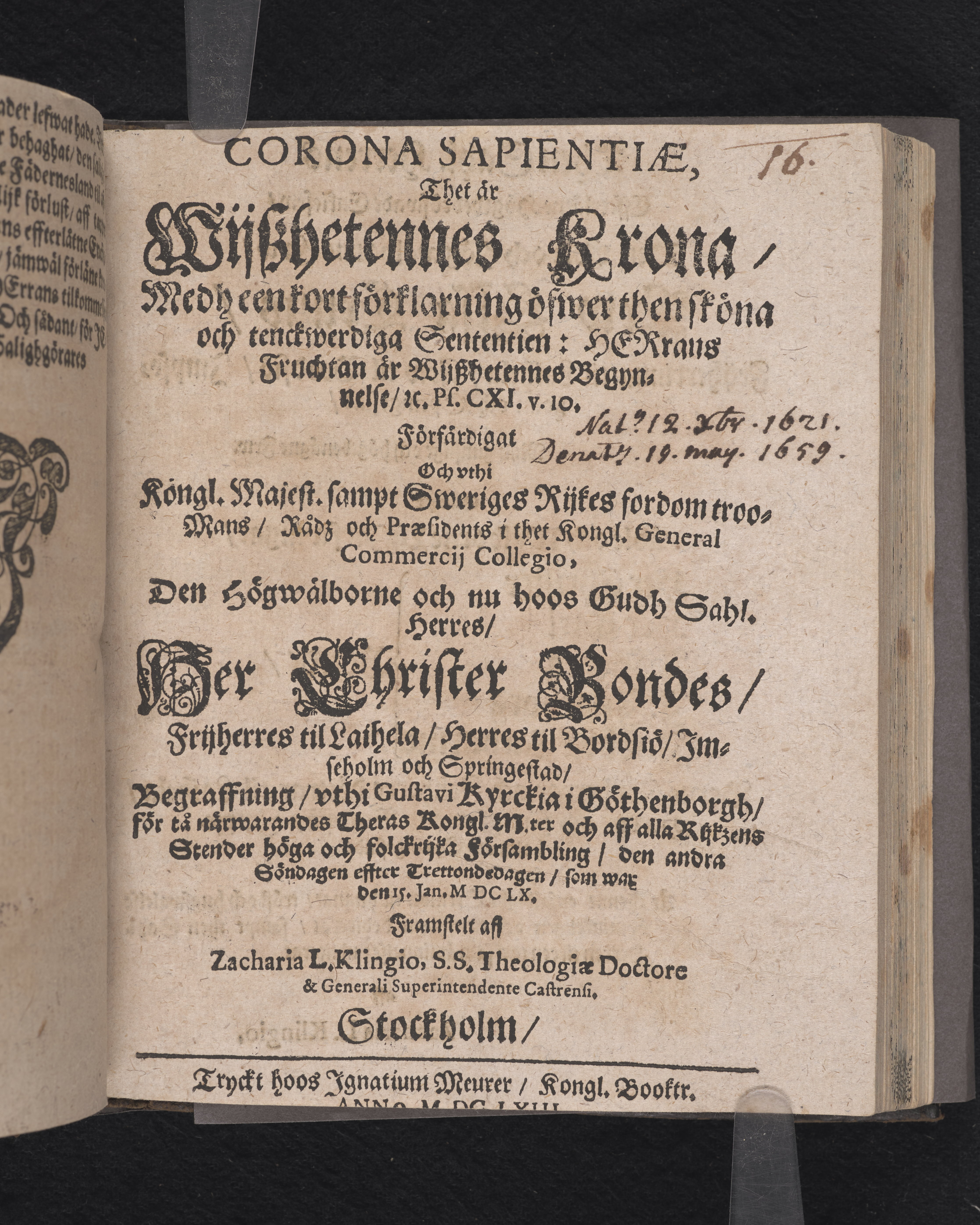 Corona sapientiæ, thet är wijsshetennes krona, medh een kort förklaring ... förfärdigat och vthi ... Christer Bondes ... begraffning ... framstelt aff Zachario L. Klingio ... Stockholm, tryckt hoos Ignatium Meurer ... anno MDCLXIII.