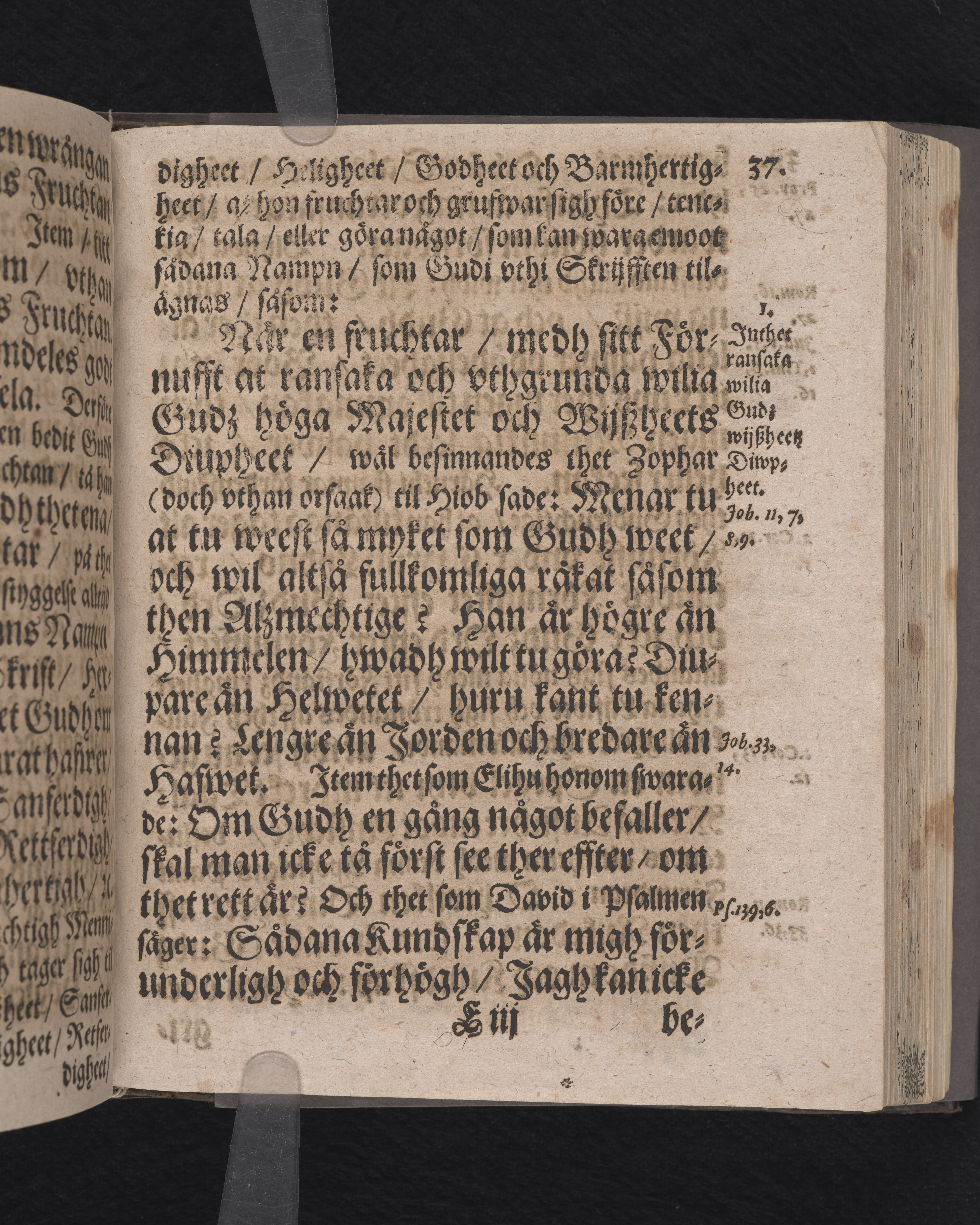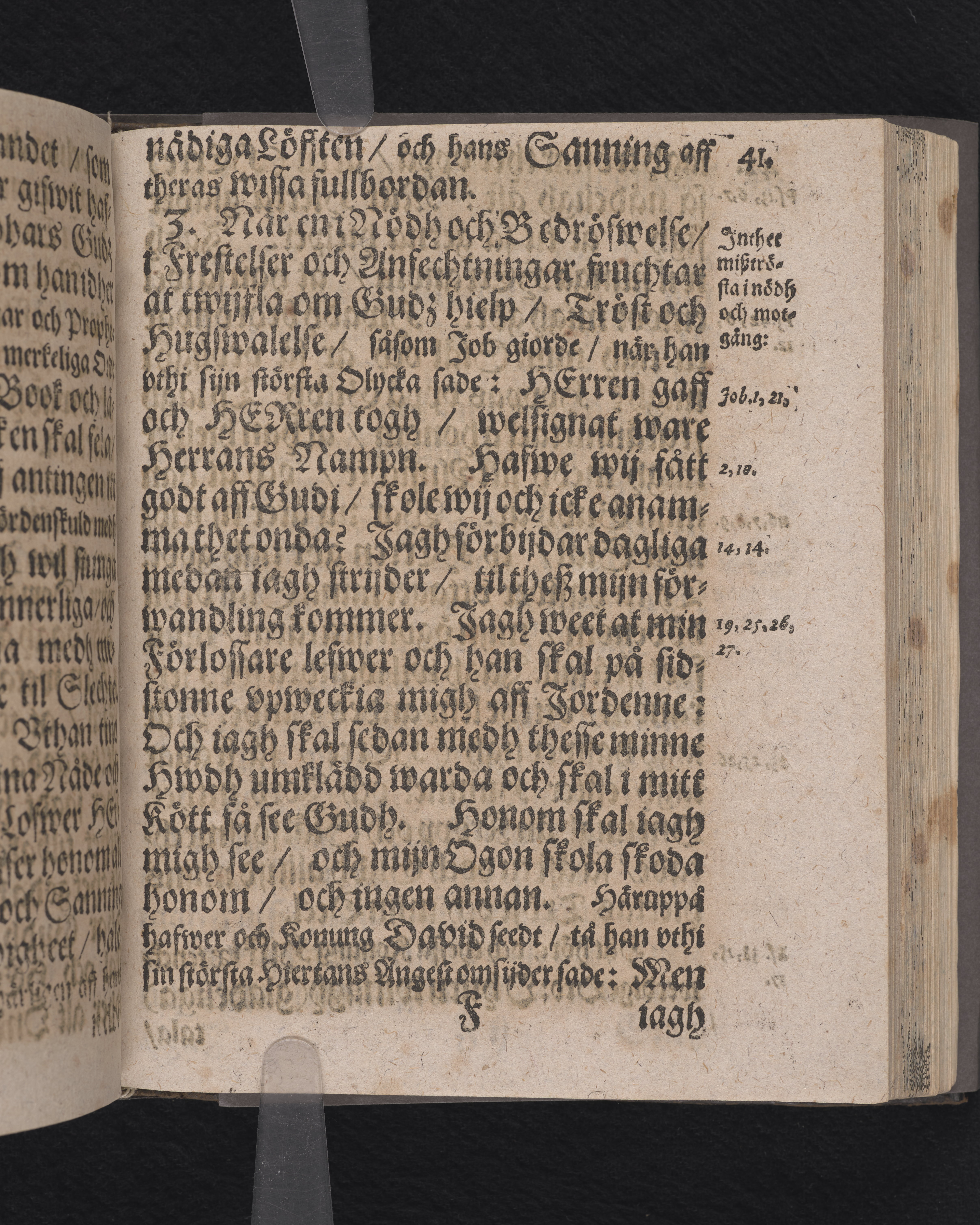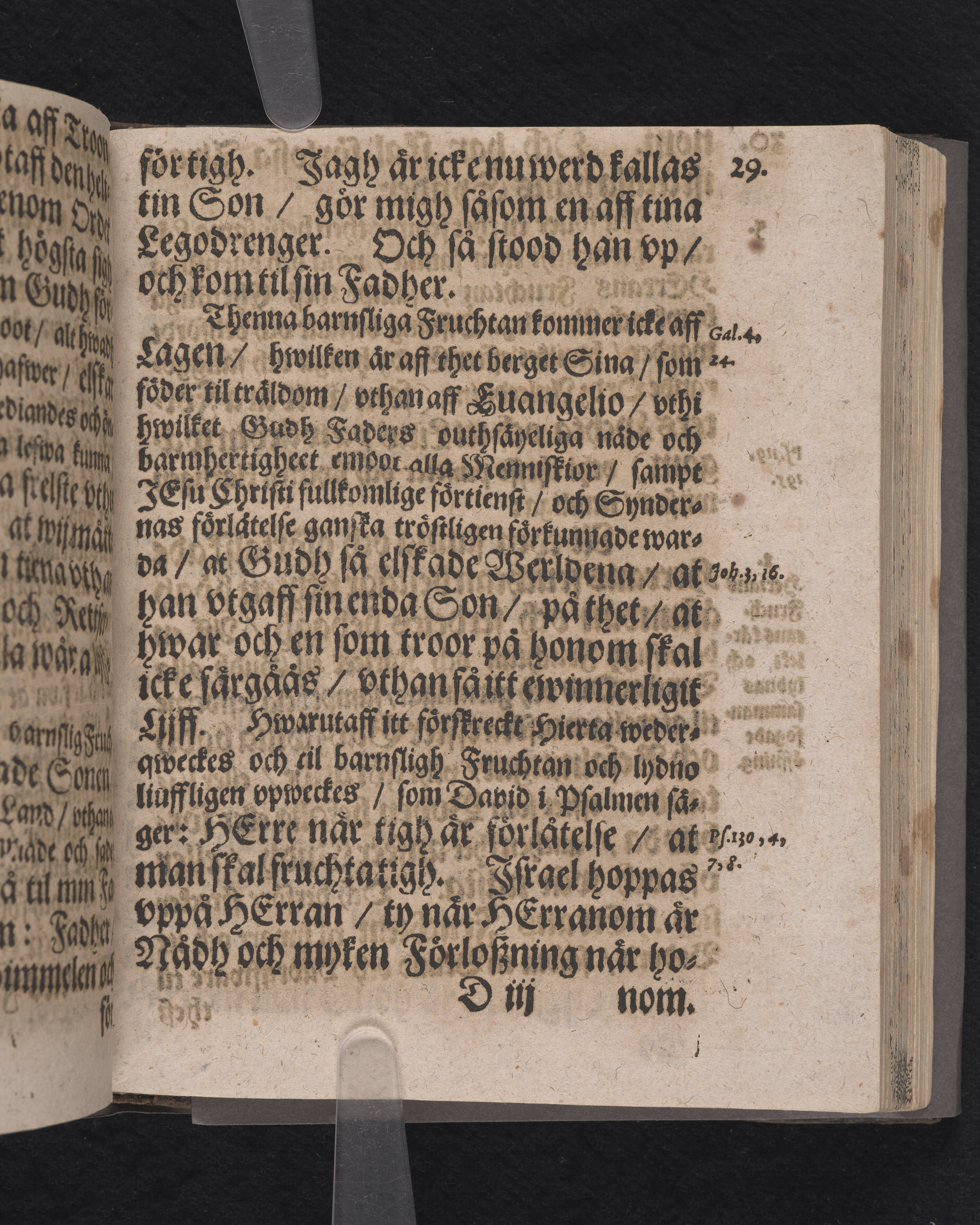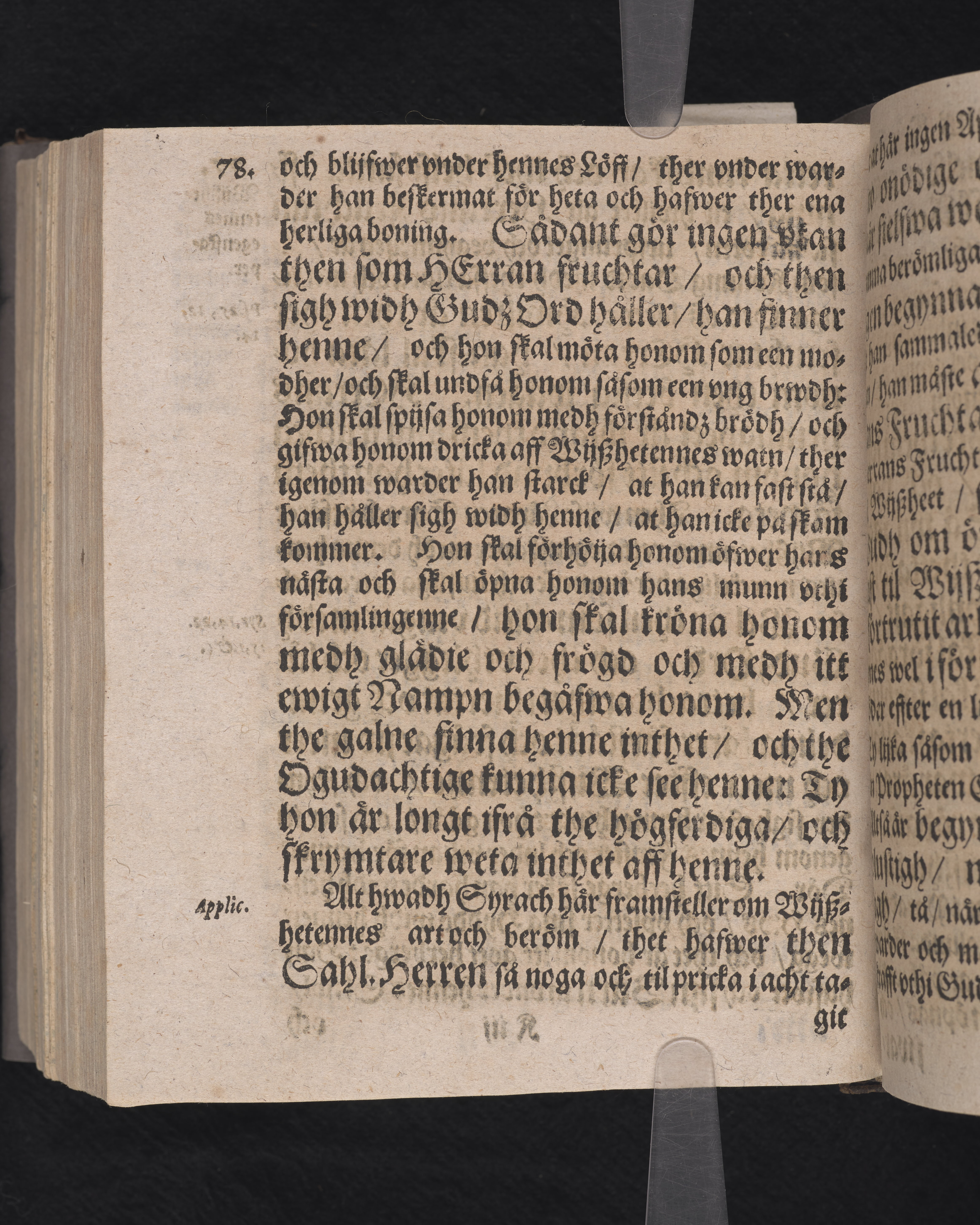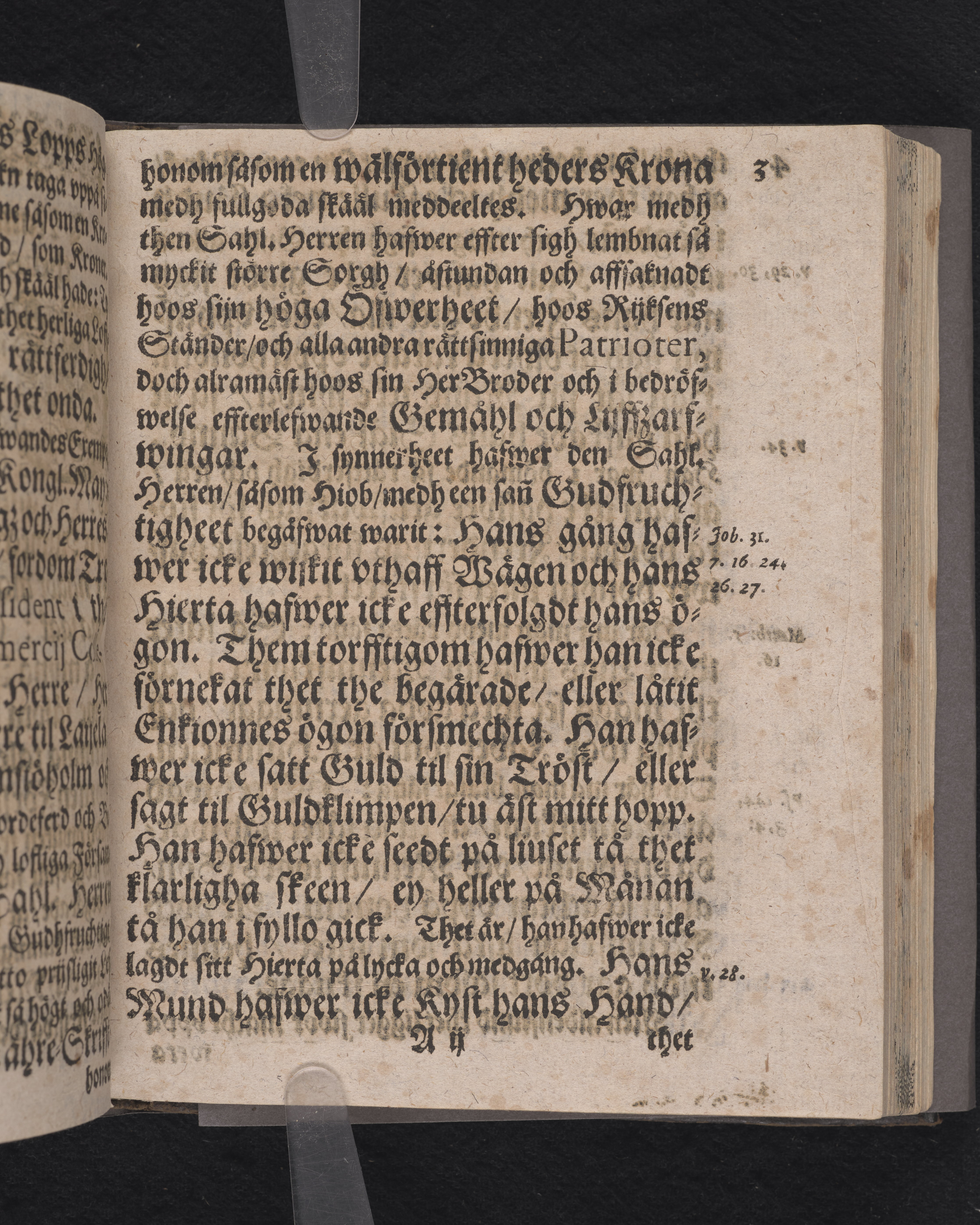 Svart helskinnsband av får, fast rygg. Stickade kapitäl. Snitten skurna, stänkfärgade i blått.