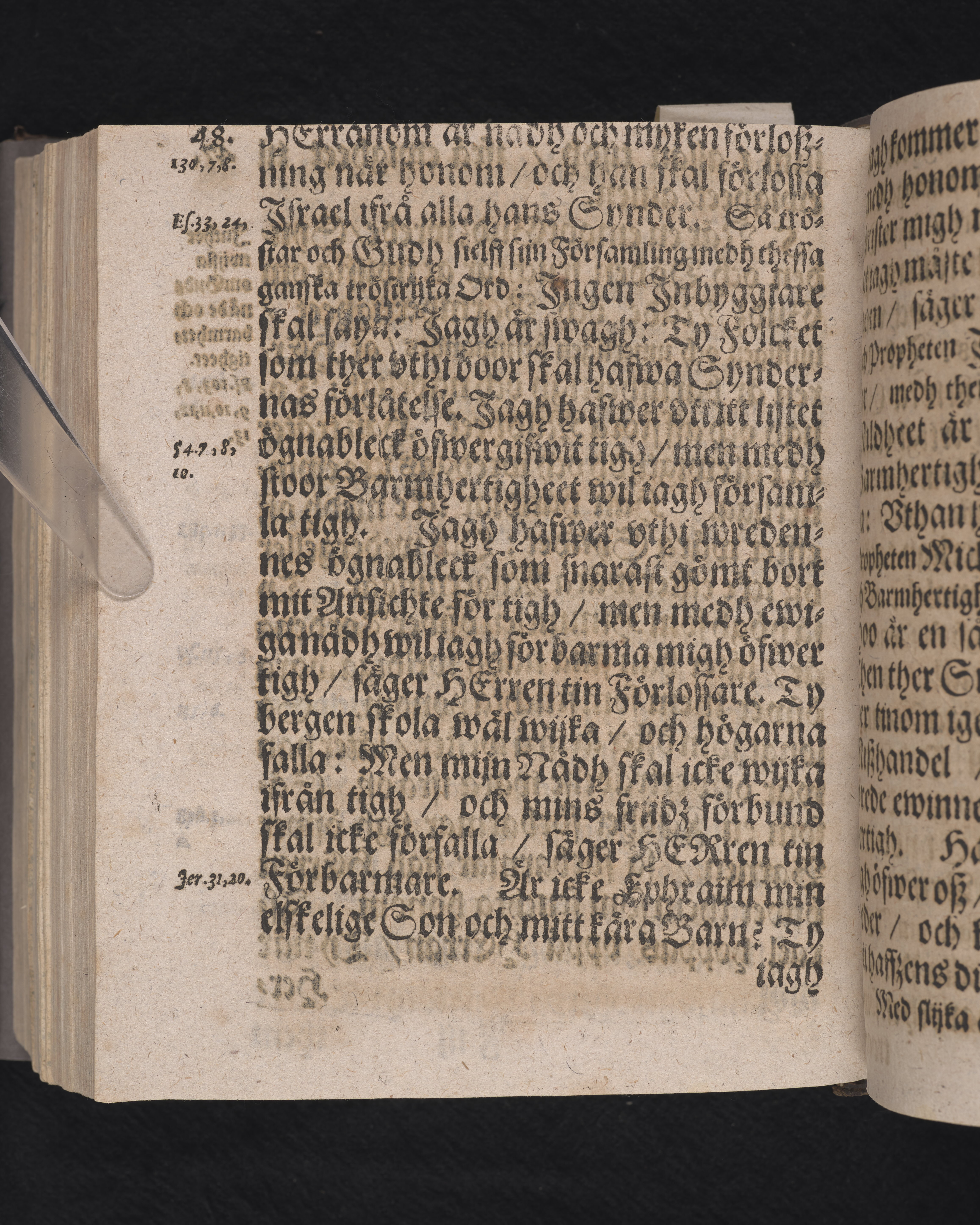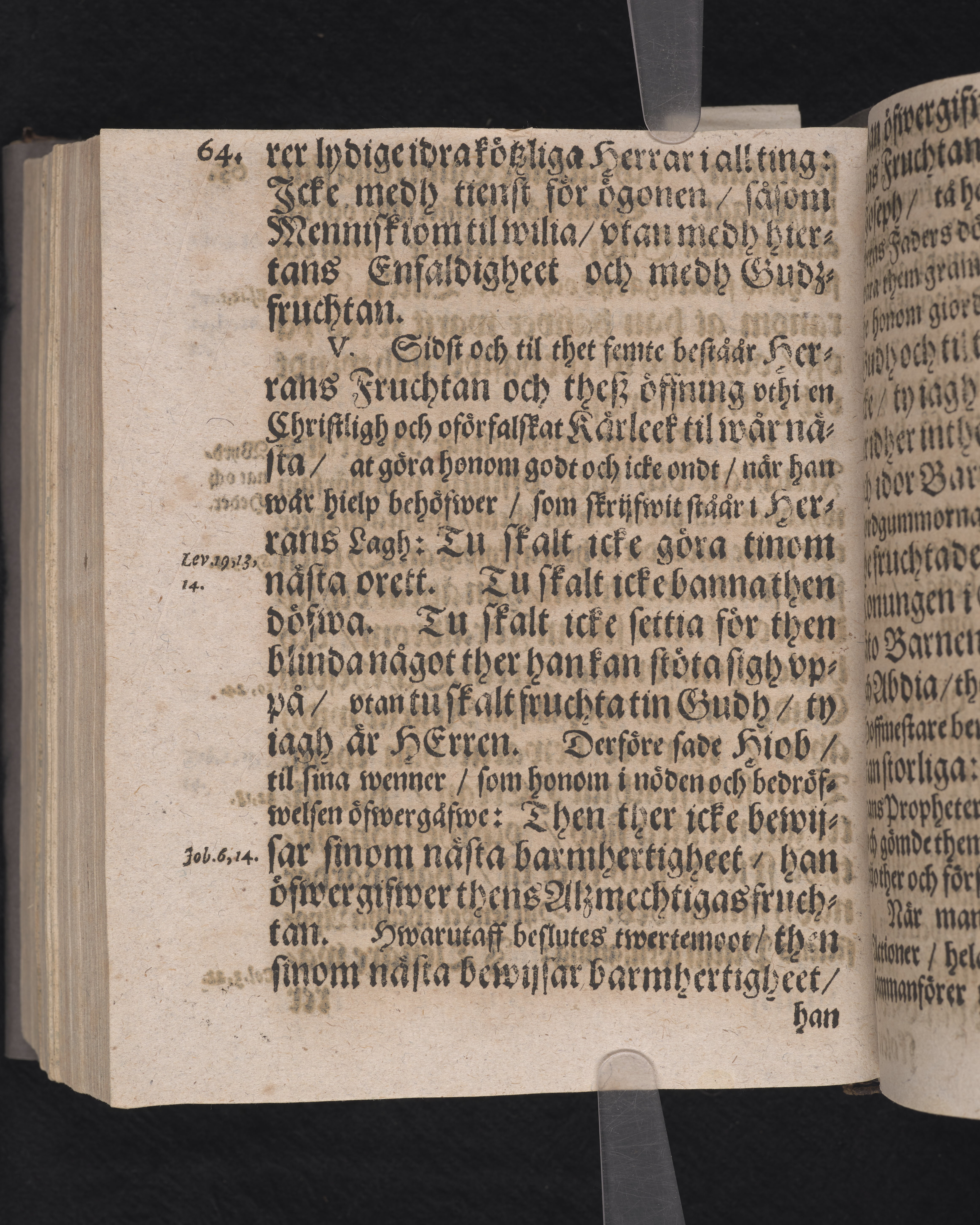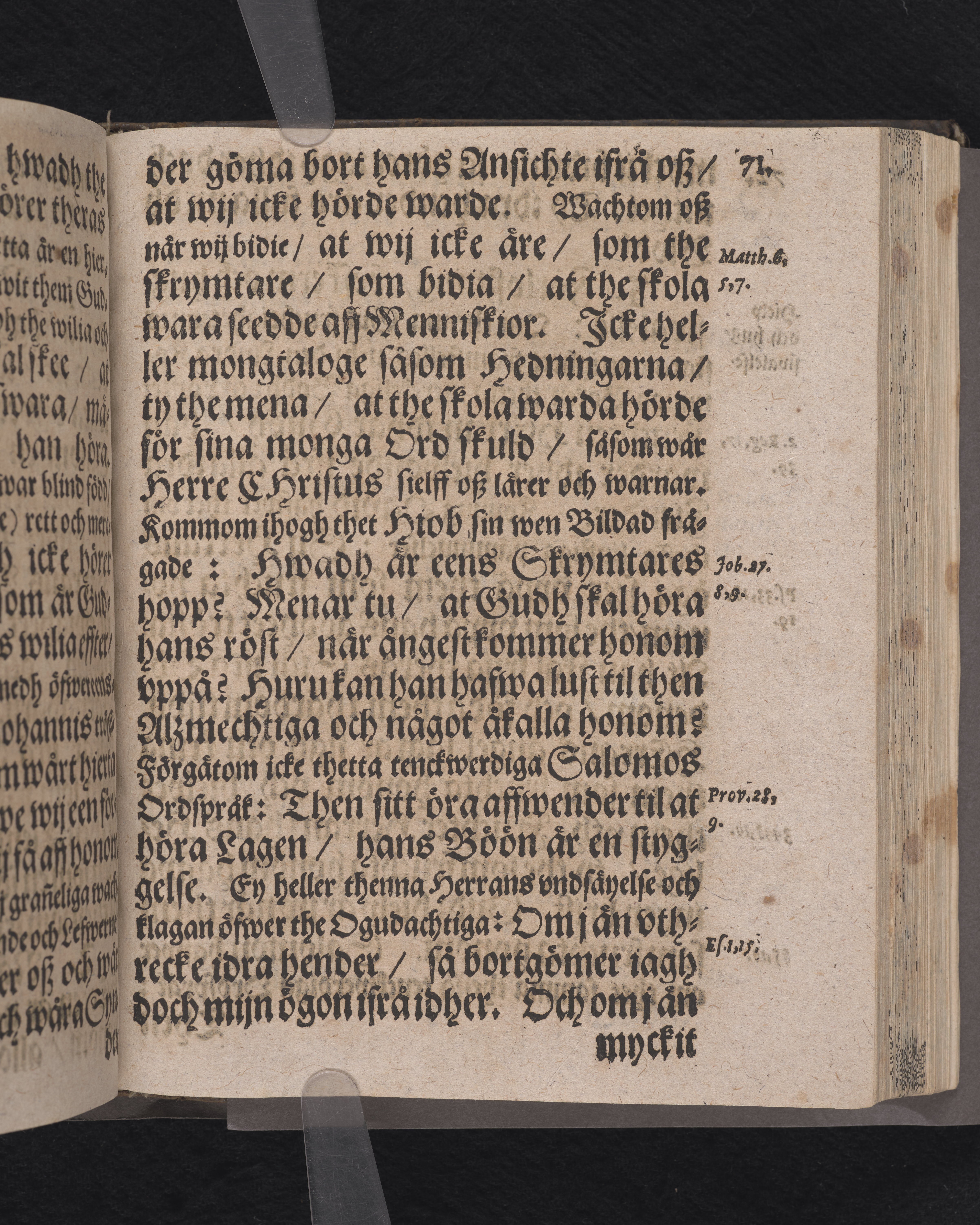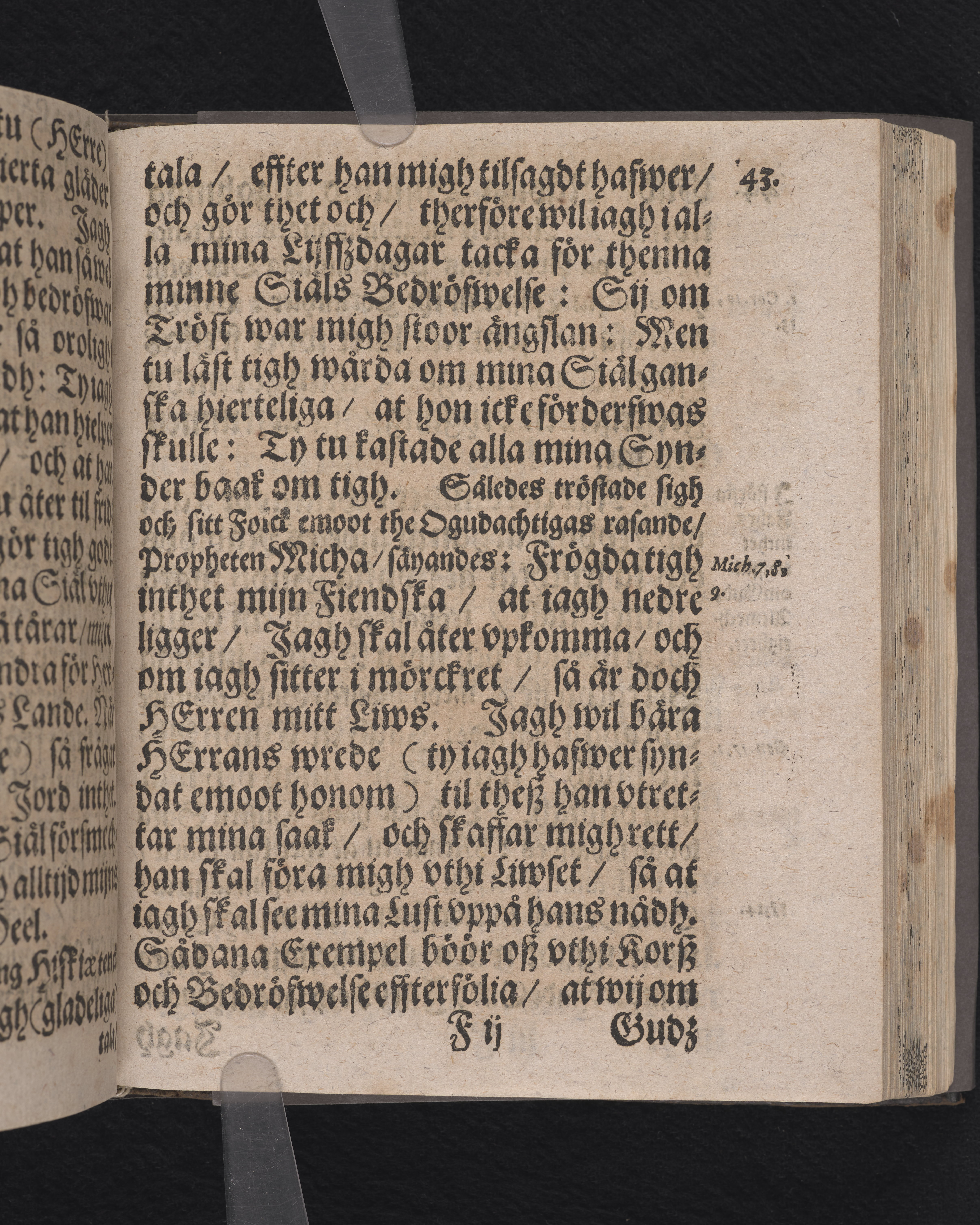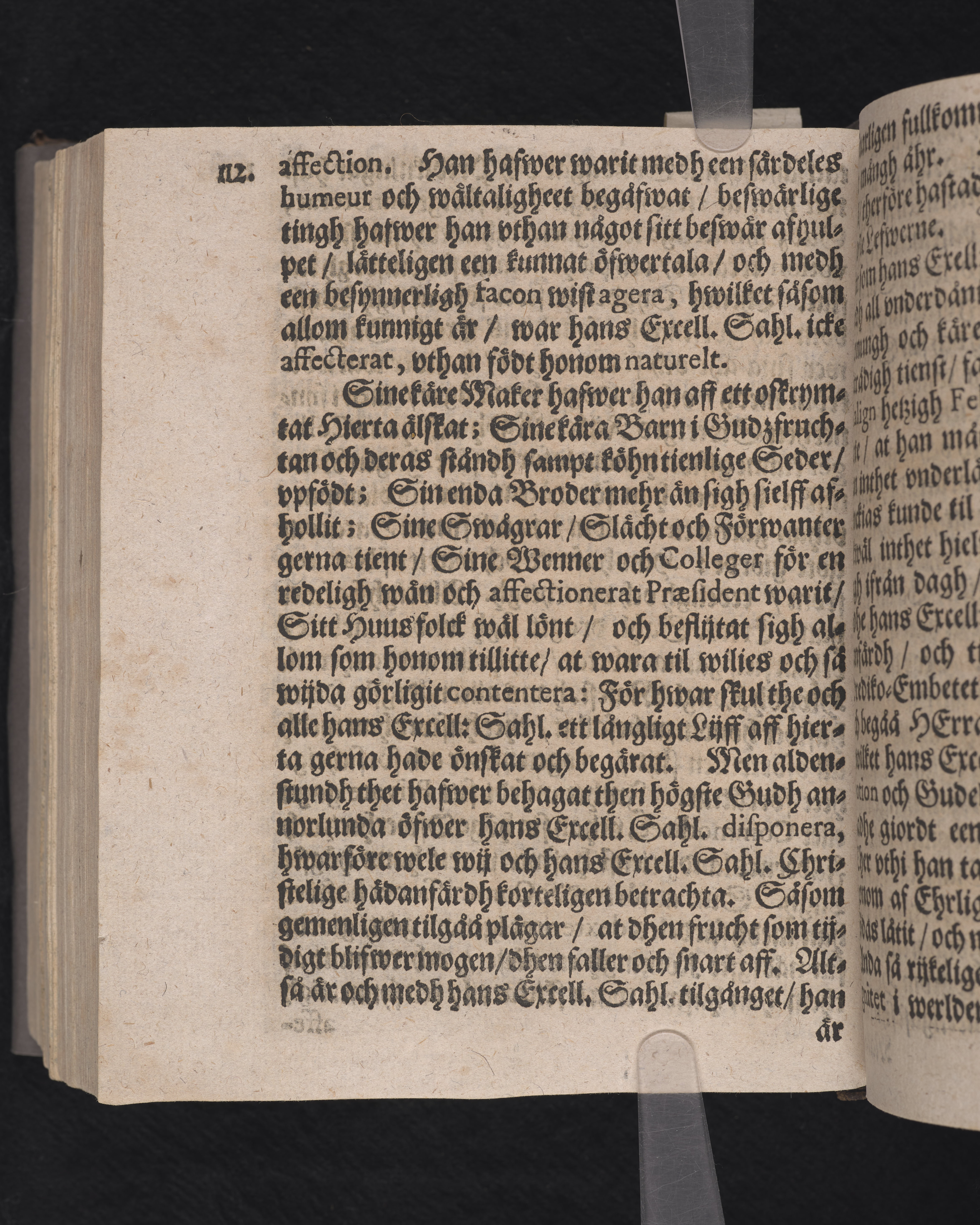 Svart helskinnsband av får, fast rygg. Stickade kapitäl. Snitten skurna, stänkfärgade i blått.