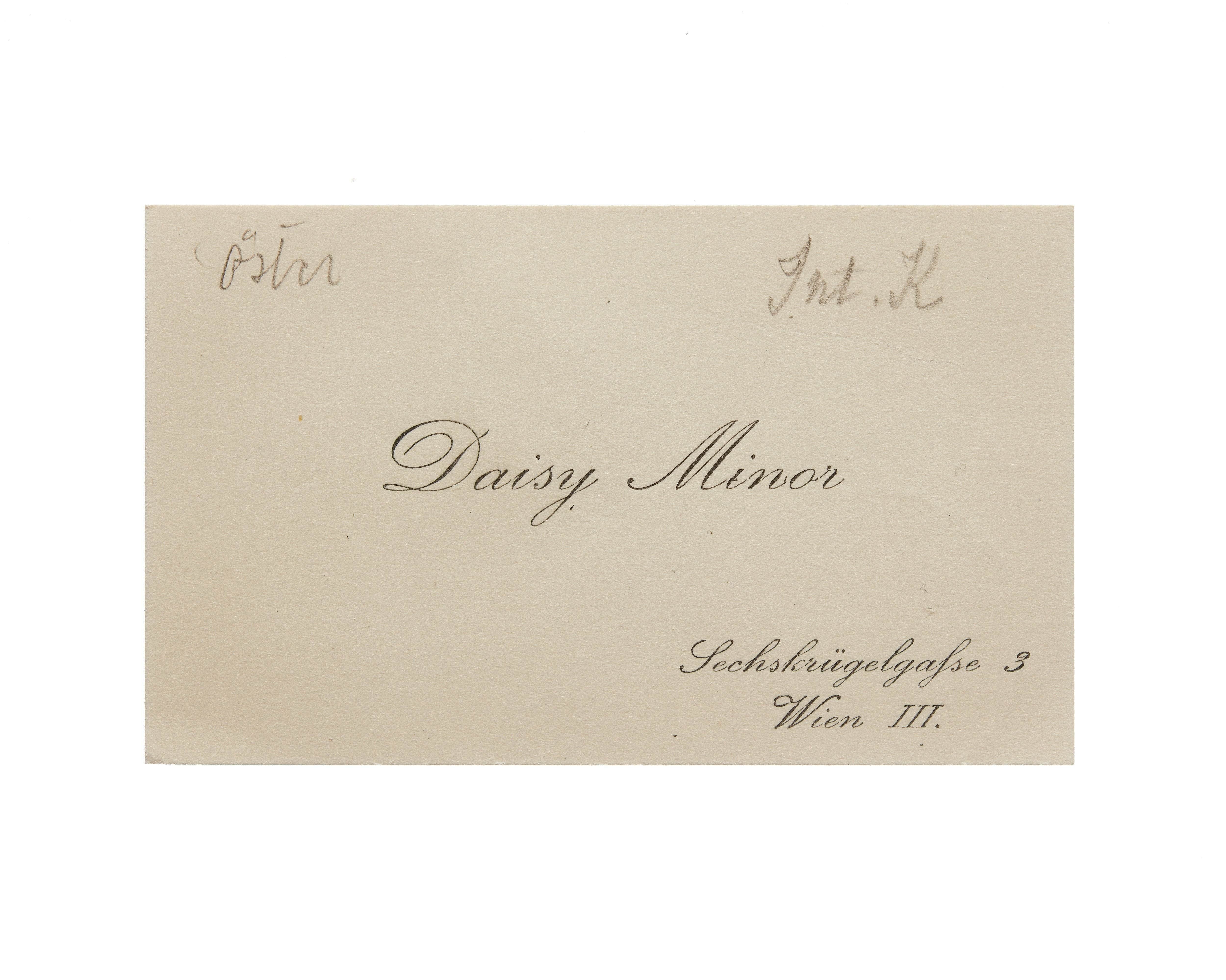 Ett visitkort från Daisy Minor, daterat 1911. Adress (nedre högra hörnet) Sechskrügelgafse 3, Wien III. Överlämnat i samband med Internationella kvinnoförbundets kongress i Stockholm 1911.