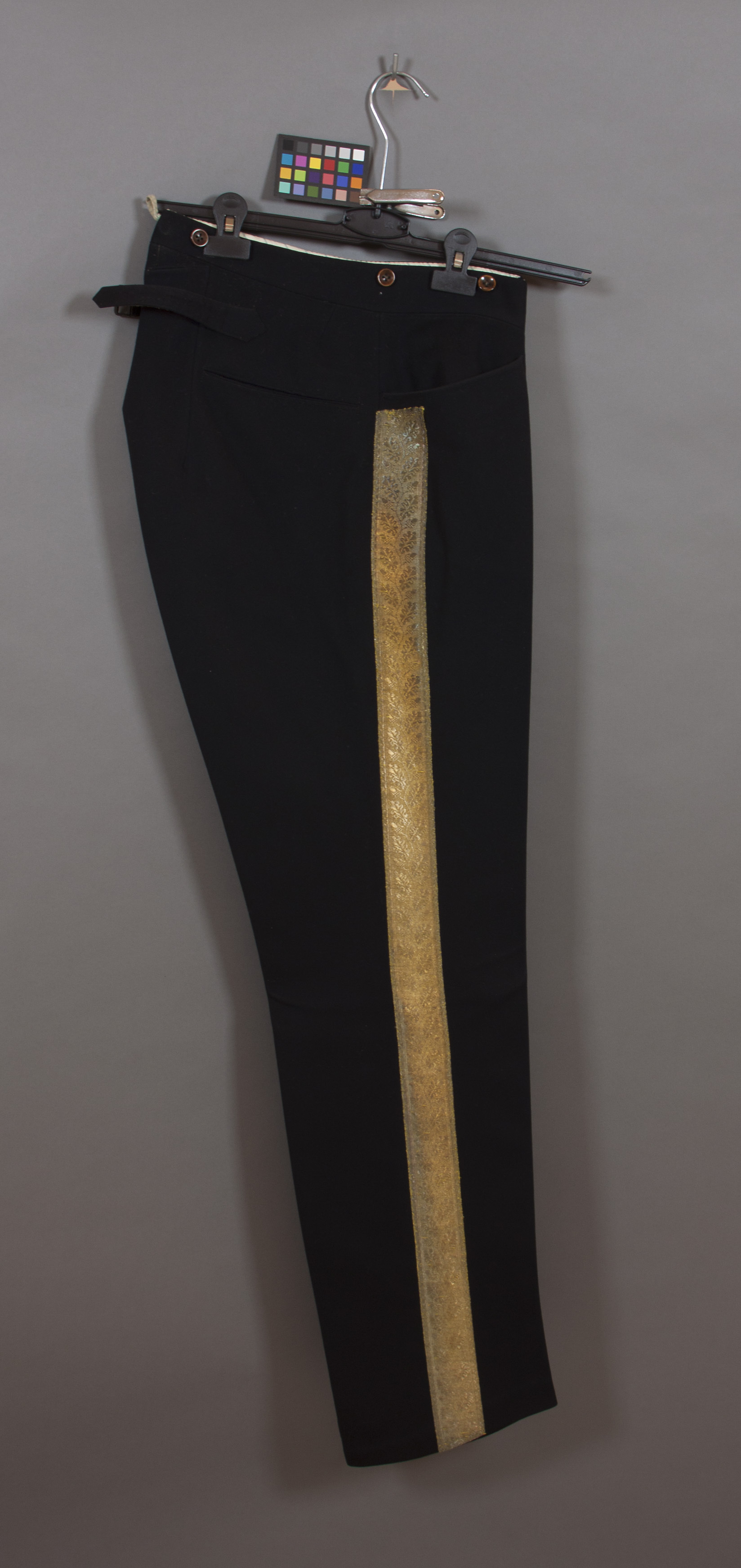 Långbyxor av mörkblått kläde, knäppta med gylf med sex små knappar av brunt trä. I linningen åtta knappar av samma sort men något större. Två horisontella fickor fram samt två bakfickor. Utmed sidsömmen bred guld galon. Mitt bak vid linningen spänntampar med svart sölja märkt: "FWfS". Foder i linningen av blårandig bomullsatin. Framfickor av brun bomull. Bakfickor av vit bomull.