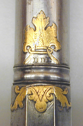 Rund, slätborrad pipa av damaskerat stål, åttsidig kammare, trumf, svarvad ring vid övergången. Vid pipbasen trofégrupp av påslaget guld, på båda sidor om ringen påslagna guldblad, i utsparning i det främre bladet inslaget med silver: B D L. Rektangulärt, svagt böjt svansskruvblad. Inslagen gulddekor i form av kantlinjer och blad. På kammarens undersida en otydlig stämpel samt inslaget med silver L och därbakom 1. Dubbelt, guldfodrat fänghål. Riktmedel: Vid pipbasen inlaxat ståndsikte av förgylld mässing. Spolformigt korn av förgylld mässing, omgivet av inslagna bladornament i ovalt fält. Fästning: Pipan fäst med krysskruv underifrån, iskruvad under avtryckarblecket, främre låsskruven i hak genom svanskskruvplattan samt två skruvar i laddstocksrännan. Flintlås av damaskerat stål. Plant låsbleck med fasade kanter, bakspetsen kanter avtrappade och slutar i bladformig spets. Dito hane med välvt hanskruvhuvud med korsformig skåra. Runda käkar, lös överkäke, hangren med ryggås, käkskruv med päronformigt huvud. Fasetterad fängpanna med fals, låg krutskärm avslutad med vulst. Fasetterat batteri, eldstålsfot med c-formig häl, eldstålsfjäder med dekorerade kanter. Invändiga låsdelar ej damaskerade. Nöt med yttre springkil. Fästning: Två låsskruvar med välvda huvuden, korsformiga skåror. Avtryckare med upprullad ände. Avtryckarbleck av stål, avtryckaren fäst med skruv från låsurtaget. Helstock av valnötsrot (?) med snidad dekor runt svansskruvblad, varbygel och spetsrörka. Näsband av horn med skuren bladdekor, övriga beslag av stål. Kolvkappa med kantlist, långa flikar på kolvsidorna. Oval centrumplatta av förgylld mässing med människoansikte i relief, omgivet av bladkrans. På kappan däromkring graverad ring med sicksackdekor. Slätt konturerat sidbleck med oval mittplatta, däromkring graverad dekor, bladrankor och odjurshuvuden mot punkterad bakgrund. Två runda, profilerade rörkor, slät, konturerad spets. Varbygel med kort, åttaformig främre arm, avslutad med flikigt, liljeformigt löv, bygel med kantlister, lång, slät, välvd bakre arm. Varbygeln fäst med skruv genom platta vid framstolpen samt hake på bakarmen i beslag på stocken. På kolvens h. sida hertig Karls (XIII) rustkammarmärke. Tillbehör: Laddstock av trä, l: 360 mm, i framänden framtill skålad hornskoning, l: 27 mm.