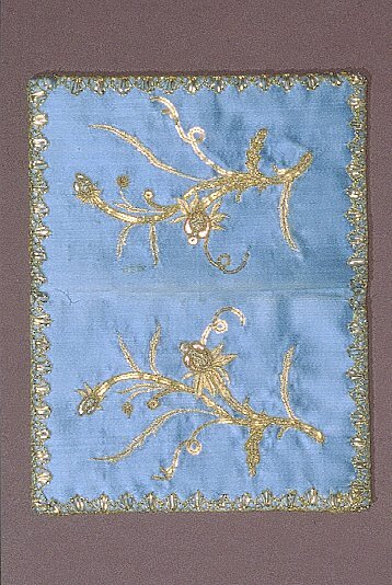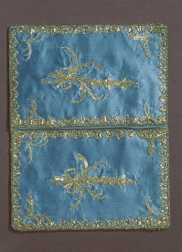 Plånbok av blått sidentyg med ett guldbroderi med blomstermotiv med blommor av ljusblå och ljusröda foliebitar och kantiljer samt paljetter i stjälkarna. Insida med två fickor som är fodrade med blått siden. Plånboken är kantad med knypplad guldspets.