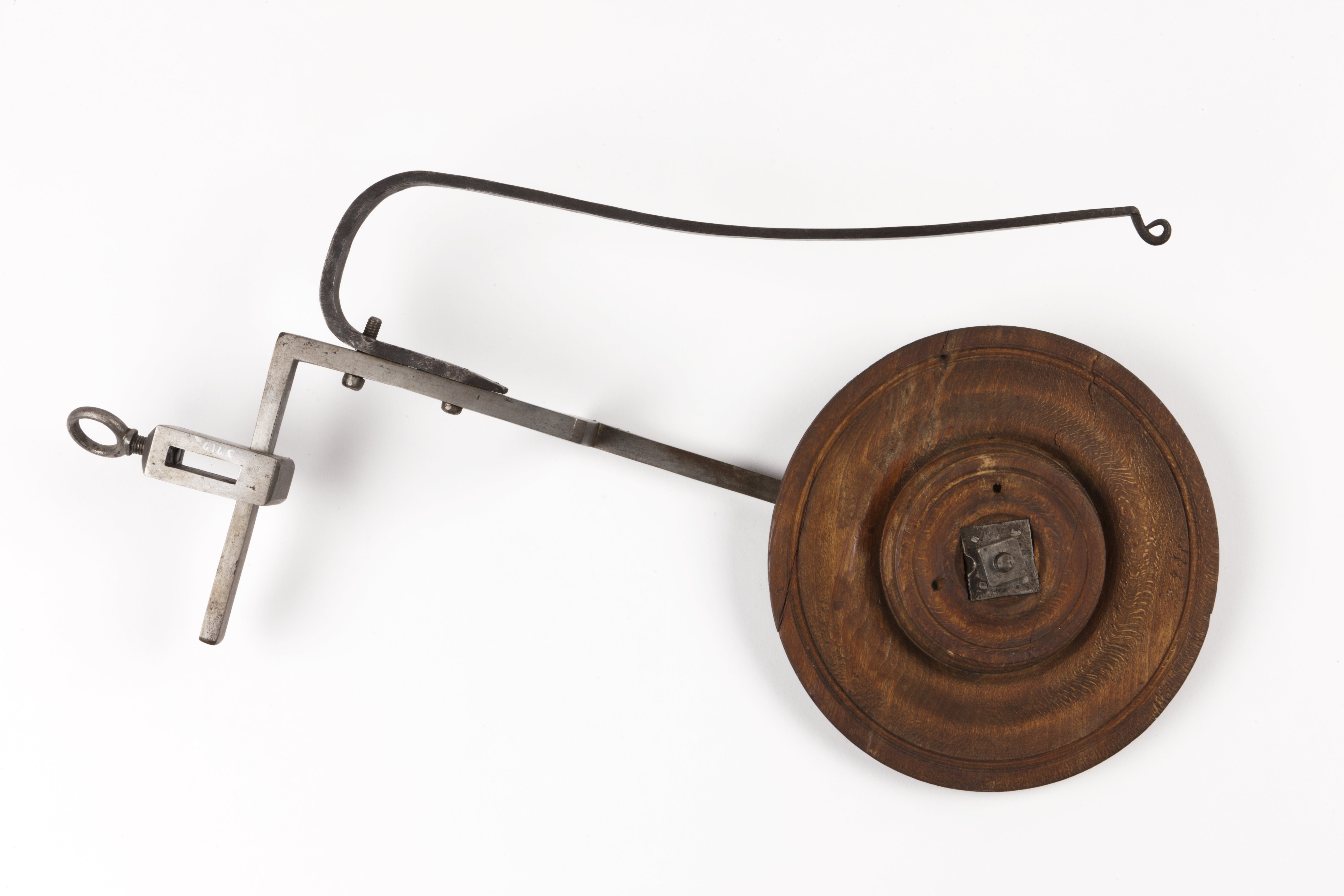 Stång med rektangulär genomskärning, fasthålles av två fästen med vingbultar, ringformade vingar. Två dockor med gängade dubbar. Den vänstra docken fast, den högra rörlig. En support. Trissa med två storlekar, svarvad i ett stycke bok och fastsatt vid en ställbar, vinkelböjd ståndare, vid rörligt fäste på stången. På ståndaren finns en böjd fjäder, anordning för drivning med trampa. Dockor och hållare fästade med vingbultar med ringformade vingar.