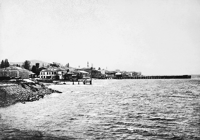 Fotografi. Hamnen i Bursa, utsikt från Mudanya. Fotografierna LXVI:O.01.-54. kommer från resan till Turkiet och Mindre Asien som Wilhelmina och Walther von Hallwyl gjorde den 27 april - 20 juni 1901. De lämnade Sverige den 5 november 1900 för Egypten, där de stannade till den 28 mars 1901, då de fortsatte till Palestina. Den 27 april fortsatte de till Turkiet och Mindre Asien. Med på resan var Wilhelminas sällskapsdam, fröken Ida Uhse. I Konstantinopel (Istanbul) anslöt sig Wilhelminas mor Johanna Kempe och kusindottern Elma Hök. Fotografierna är inköpta av Wilhelmina i Konstantinopel (Istanbul) och Brussa. Alla uppgifter kommer från Ida Uhses reseanteckningar.