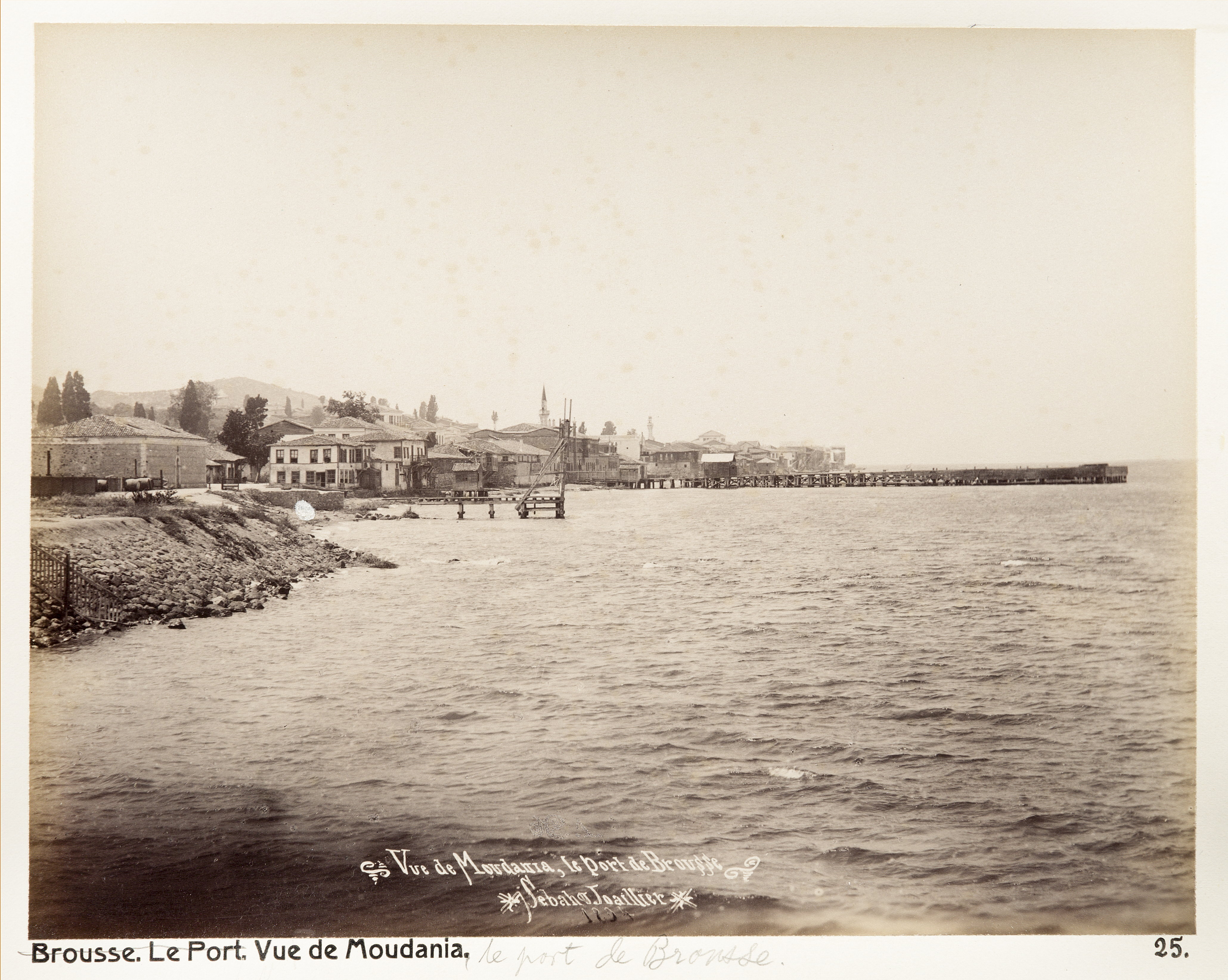 Hamnen i Bursa, utsikt från Mudanya. Text på originalet: "Vue de Moudania, le port de Brousse." Inköpta af Wilhelmina von Hallwyl, f. Kempe, i Constantinopel och Brussa vid hennes vistelse i nämnda städer tilllsammans med sin make, Walther von Hallwyl, sin mor, Johanna Kempe, f. Wallis, kusindottern Elma Hök samt fröken Ida Uhse under deras resa genom Mindre Asien och Turkiet samt hem öfver Schweiz 27 April - 20 Juni 1901. Förestående uppgifter lämnade med ledning af fröken Ida Uhses Reseanteckningar.