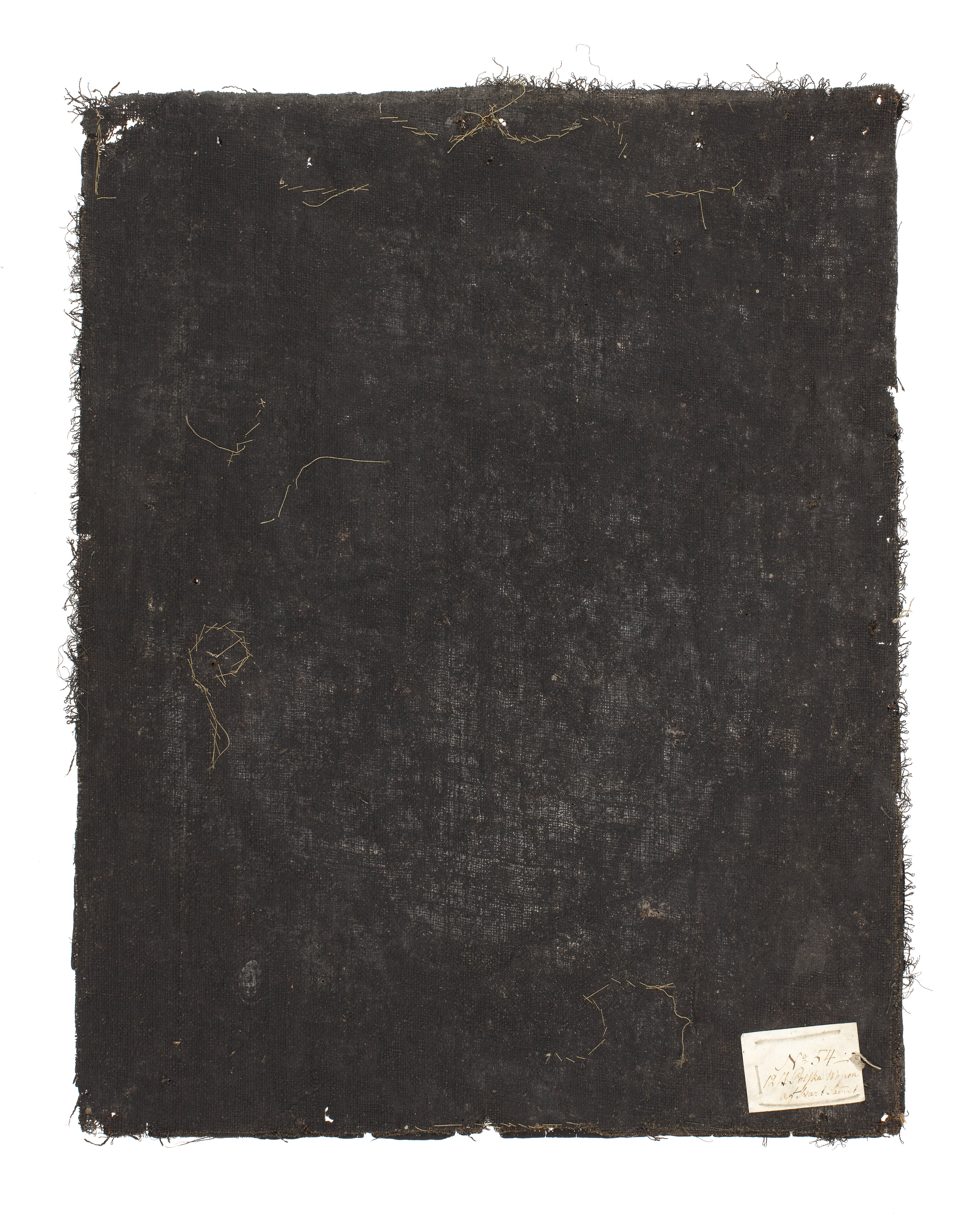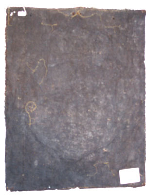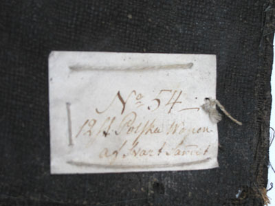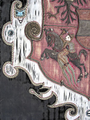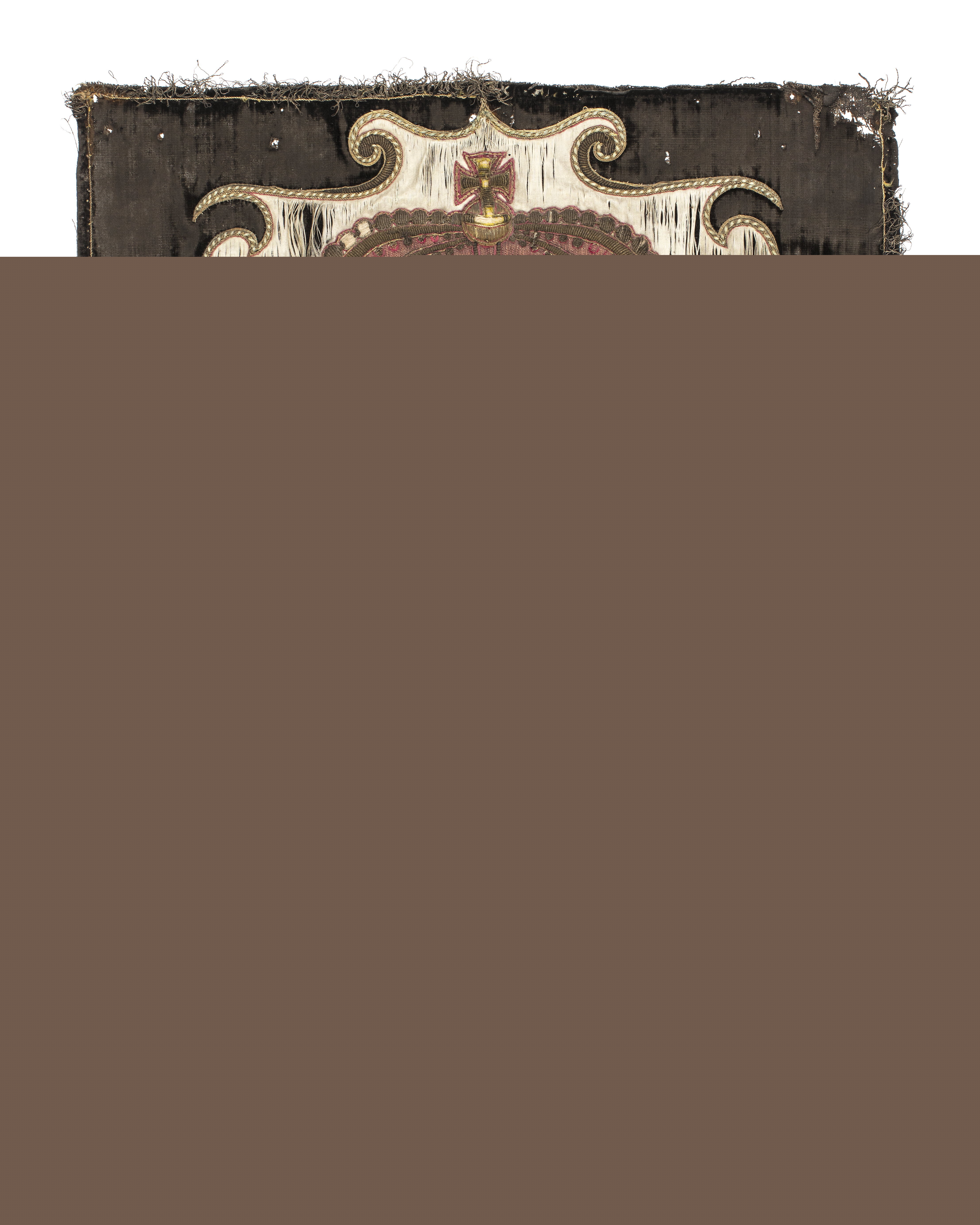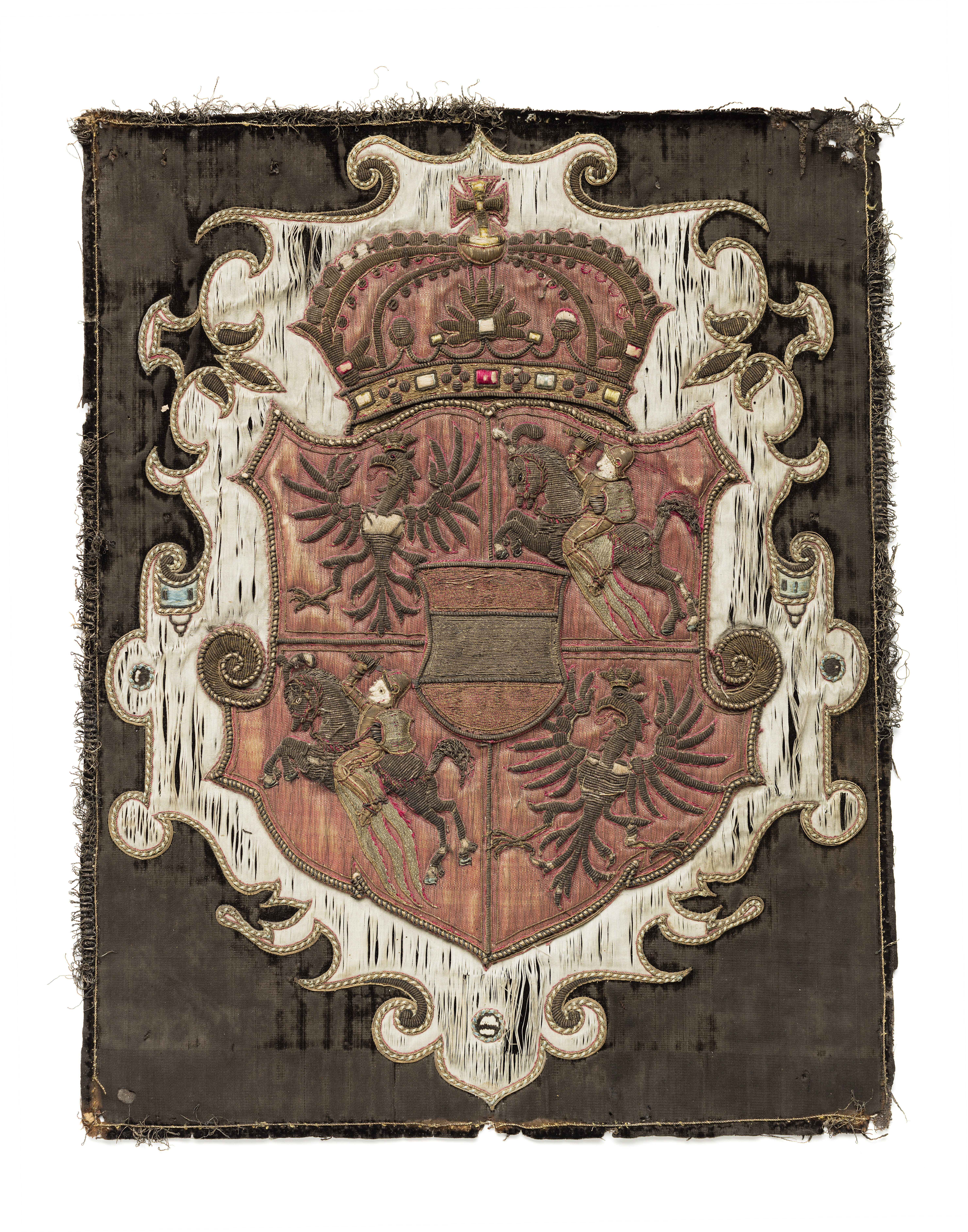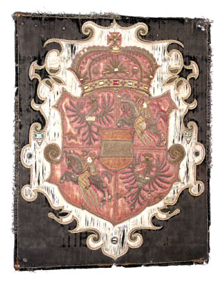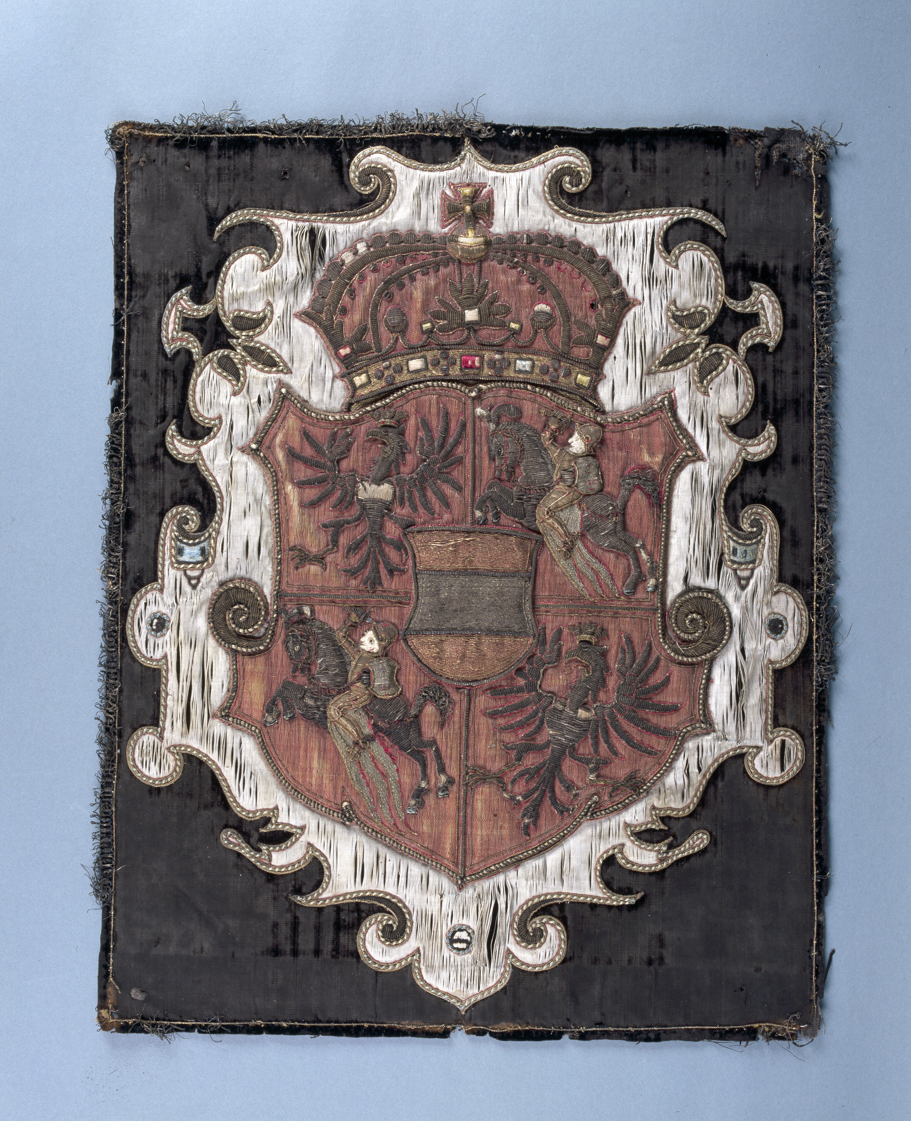 Stående rektangulärt platta av svart, mycket sliten sammet, floret nästan helt borta. Därpå applicerat en symmetrisk rullverkskartusch av vitt siden med kanter och detaljer broderad med guldtråd, kantiljer och ljusblått silke. På kartuschen fäst en förhöjd vapensköld med samma kantning, bottentyget i fälten av grövre tuskafts-siden (?). Kvarderad vapensköld krönt med kunglig krona, alla fälten röda. Fält 1 och 4 Polen, en krönt örn av silver. Fält 2 och 3 Litauen, en ryttare med lyft svärd, sköld på v arm (korset saknas) Runt alla kanter en smal frans av guldtråd. Baksidan helt täckt med grov, svart vaxduk med synliga stygn från applikationen. I nedre h hörnet fastsytt en pappersetikett med bläckpåskrift: "N:o 54 // 12 st: Polska Wapen // af Swart Sammet".