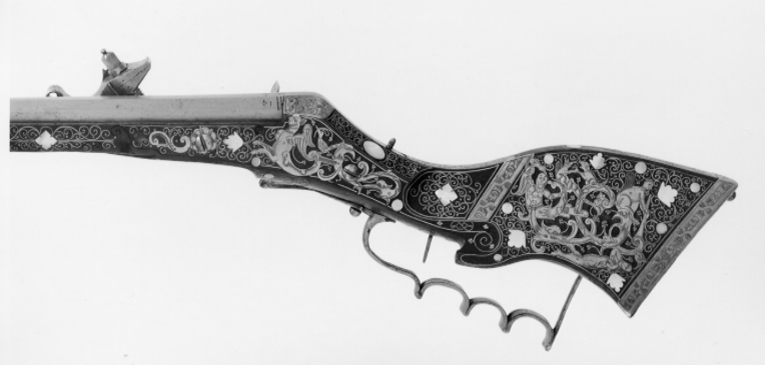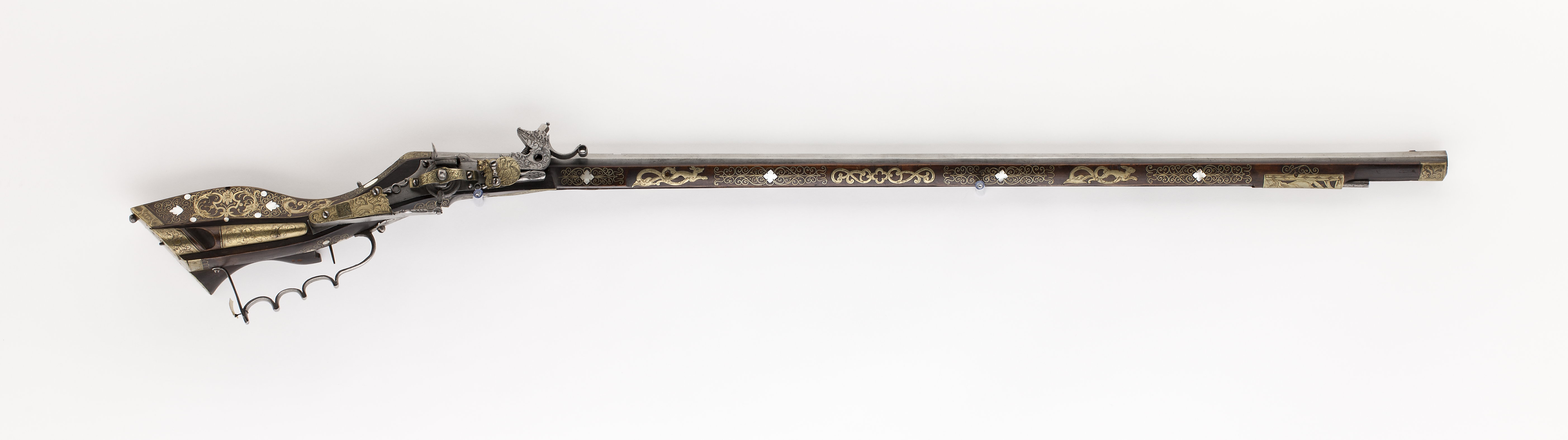 Pipa med trumf, femsidig översida, 6 räfflor. På kammaren graverade band, bukett, H med två stjärnor samt I 4. Riktmedel: Inlaxat stolpkorn av koppar, siktet saknas. Fästning: Pipan fäst med krysskruv underifrån samt ett halvt (urspr. tre) pipstift av ben. Hjullås av teschitztyp med utanpåliggande hjul och slagfjäder. Låsbleck, l: 190 mm. Svarvat hjul med hjulbryggan täckt av en blomgraverad mässingsplåt. Rektangulär, rak, något bakåtböjd skärm och fängpannelock med spirallinjer, rörlig arm. Hane med lös överkäke, graverad som odjurshuvud. På hanhalsen manshuvud och runt hål. C-formigt fingergrepp med cylindrisk ände. Hanfjäderbleck av mässing med rankor, fågel och mansprofil. Balusterformig studel av stål. Två tryckknappar, den främre med gjutet huvud av mässing med lejonmask, den bakre kvadratisk av stål och täckt med mässingsplatta med graverad blomdekor. Över slagfjädern ett mässingsbleck med rankor och två hundar. Avtryckarknapp klädd med mässing på huvudet, graverad fyrbladig blomma. Fästning: Två låsskruvar. Rak avtryckare. Brun helstock av teschitztyp, näsband av mässing med bladrankor. Slät bakplåt av stål med stödkula. Kolvlådelock med utskuret tumgrepp och två mässingsplåtar med blomornament. Inläggningar av pärlemor och mässing, plåtar och tråd i form av graverad bladslingor med djurhuvuden och harar, omväxlande med symmetriska slingornament kring pärlemorblommor, cirklar och ovaler. Under framstocken en rektangulär, genombruten mässingsplåt med en graverad kvinnofigur. Varbygel av stål med tre fingerlägen, två skruvar. Tillbehör: Laddstock av ljust trä, l: 932 mm, skoning av stål, l: 169 mm. I kolvlådan en papperslapp med påskrift i sepia: No 263.