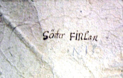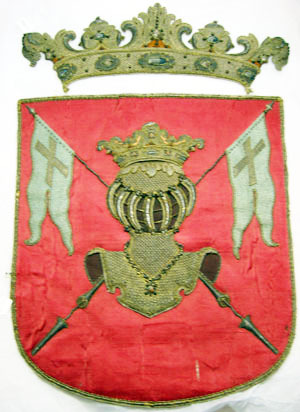 Skölden är av röd sidenatlas, kantad av en tjockare och en smalare snodd av silverlan, gul silkestråd och förgylld tråd virad runtom en silkeskärna. Ytterst kantas skölden av ett silverlan och en gul silkestråd trädd genom små öglor av silvertråd. Mitt på skölden ett applikationsbroderi i relief föreställande en stiliserad riddarjhälm och en halskrage av förgylld silvertråd i läggsöm som sytts ned med gul silkestråd. Halskragen kantas av en bård med fyra snoddar av silvertråd och förgylld tråd runtom en silkeskärna. Ytterst är lagt ett silverlan samt en gul silkestråd trädd genom små öglor. Runtom halsen är broderat en kraftig kedja av kantiljer av silvertråd. Från kedjan hänger en medalj av förgyllda silverlan kantad av ett band av skruvad silverlan samt små kärnor av kantiljer av silvertråd. Hjälmens visir består av sju galler av silverlan kantade med smala snoddar av silvertråd och gul silkestråd samt med små öglor av silvertråd. I ändarna av vardera galler är broderat små blommor av kantiljer av silvertråd. Bakom gallren är broderat två rader med vardera två smala snoddar av silvertråd och gul silkestråd. Överdelen av hjälmen är broderad av förgylld silvertråd. Övre kanten dekoreras av blad av silvertråd kantade med en smal snodd av silvertråd och gul silkestråd. Taften är svartmålad bakom visiret och vid ärmurtagen. Hjälmen kröns av en öppen adelskrona med tre spetsar föreställande stiliserade blad vars ändar avslutas i voluter. På kronringen är broderat tre stora blommor och två stenimiterande romber föreställande stenar. De är av förgylld silvertråd med silverlan i mitten omvirade av röd respektive blå silkestråd. På vardera spets är broderat en romb av silvertråd med silverlan omvirade av röd och blå silkestråd. Romberna kantas av tvinnade lan och små prickar av kantiljer av silvertråd. Spetsarna kantas av en smal snodd av gul silkestråd och silvertråd. Bakom hjälmen och halskragen är broderat två korslagda fanor föreställande svenska flaggan. Dukarna är broderade av ljust blå silkestråd med kors i mitten av silvertråd som ursprungligen varit förgylld. Korsen kantas av en smal snodd av gul silkestråd. Dukarna kantas av smala snoddar av gul silkestråd, silvertråd och små öglor av silvertråd. Fanstängerna är långa och smala, av en tjock snodd av silvertråd virad runtom en silkeskärna och nedtill formar silvertråd koniska handtag. Spetsen är av silverlan. Skölden kröns av en öppen adelskrona med spetsar av stiliserade blad med volutavslutande ändar. Mitt på vardera blad sitter en liten stenimiterande oval eller romb av silverlan omvirade med röd respektive blå silkestråd, kantade av kantiljer av silvertråd och med små prickar av kantiljer av silvertråd. På den mittersta kronspetsen är broderat en rad av sex små prickar av kantiljer och de yttersta kronspetsarna kantas av sju små prickar av kantiljer. Mellanrummen mellan kronspetsarna är utfyllt med rödbrunt silkesgarn. Kronringen är 40 mm bred och kantas av en snodd av silvertråd och gul silkestråd virad runtom silkeskärna samt av ett smalt silverlan och små öglor av silvertråd. På kronringen är broderat fem stenimiterande blommor. De är broderade med silvertråd och siklverlan kring vilka virats röd respektive blå silkestråd. Mellan vardera blomma sitter två små prickar av kantiljer av silvertråd, sammanlagt åtta i antalet. Vapnet är fodrat med beigefärgad linnelärft täckt av pålimmat, gulnat papper. I övre kanten av skölden är skrivet med svart bläck: "Söder Finlan" och därunder med blyerts: "No II". Pappret på kronans baksida täcks av tryckta, oläsliga texter i frakturstil i svart och rött.