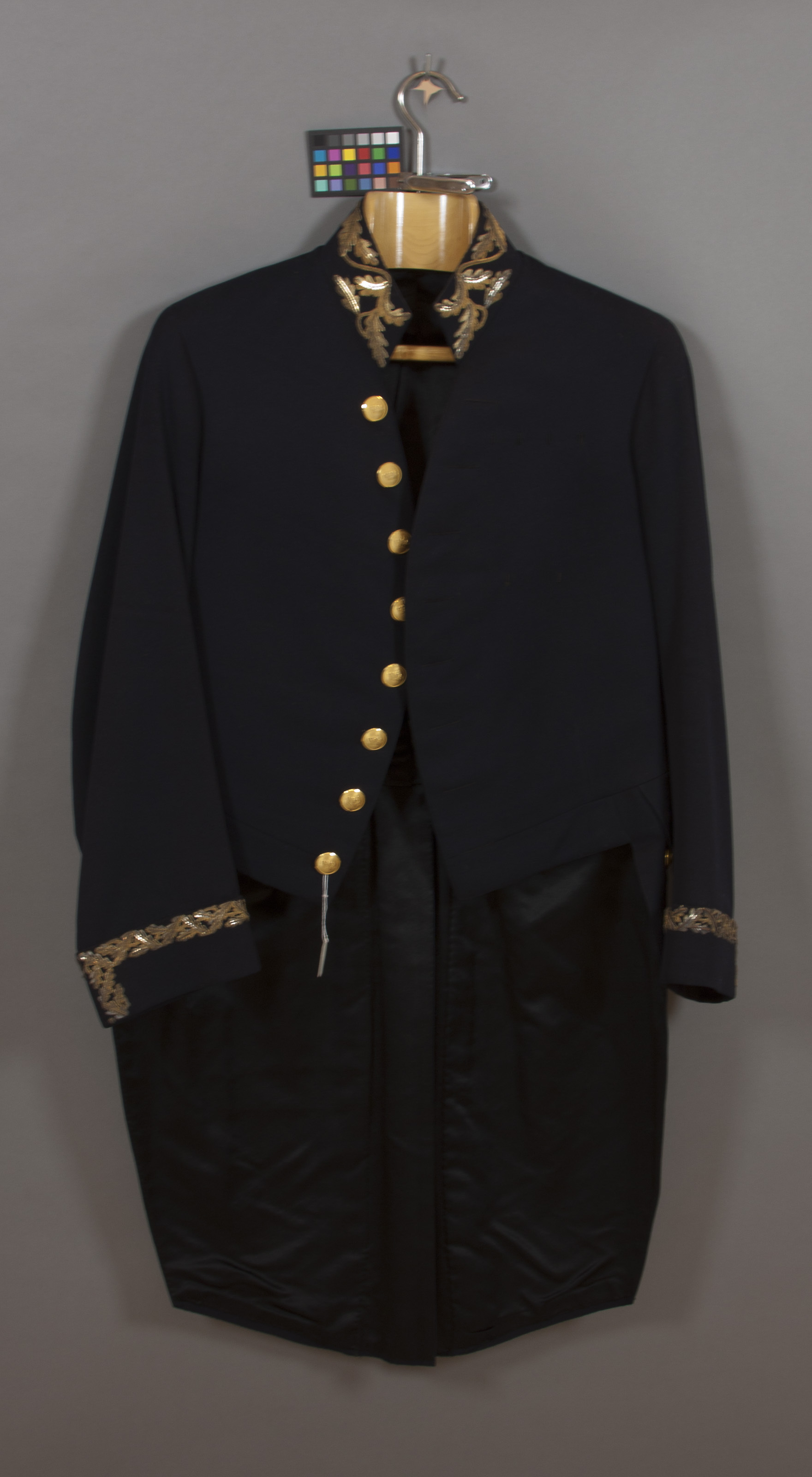 Frack av mörkblått kläde, tillskuren med livsöm och mittsöm bak. Falsk enkelknäppning, ihophäktning med två svartmålade hyskor och hakar av stål, en av vardera på varje sida. Åtta förgyllda kronknappar, d: 22 mm från Sporrong & Co, Stockholm. Påsydda knapphål i form av svarta silkestränsar. Öppen och snedskuren ståndkrage med guldbroderi av kantiljer och paljetter, eklövsranka. Ärmar med fasta uppslag, b: 68 mm, broderad kantbård, eklövsranka av guldpaljetter och -kantiljer, b: ca 20mm. På skörtet bak sprund över hela längden. 70 mm från sprundet veck, på livsömmen vid vecken två kronknappar. Ca 65 mm från fastsytt i livsömmen falska fickklaffar, l: 185 mm, b: 72 mm, nederkanten tre spetsar, under klaffen vid spetsarna tre kronknappar. Foder av svart satäng, matelasserat i överdelen, i ärmarna vit satäng. Bröstfickor på båda sidor, iv. fickan fastsytt MEA-etikett med påskrift: "5.1 17 // Hofkamrer // Th. Lingmark". Har tillhört hovkamrerare Th. Lingmark och hovintendenten Karl August Löfström (1881-1964), gåva av änkefru S.E. Löfström, Stockholm.