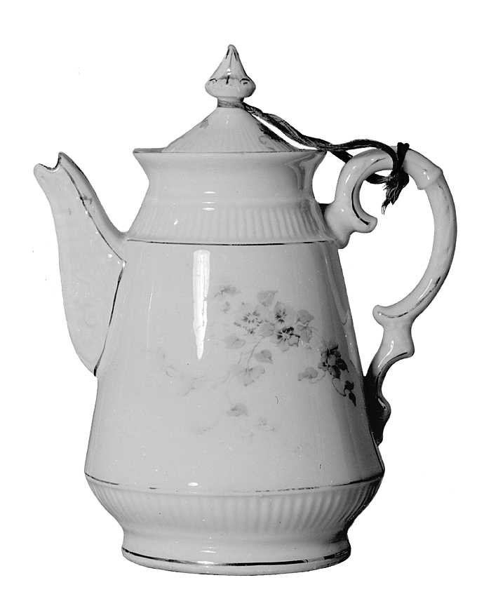 KAFFEKANNA med lock Av porslin. Konisk, med i två avdelningar kälformigt indragen skuldra, den nedre indragningen tvärräfflad, samt utsvängd mynningskant, tvärräfflad, vulstigt indragen fotkant samt med pip och hänkel. Pip snett uppstående, med tresidigt tvärsnitt, avsmalnande uppåt samt med bladornament i relief. Hänkel ovalstavig, i form av två sammanhängande bågar, den övre större och utsvängd, den nedre insvängd. Dekor i färger och guld på glasyren. På vardera av kannans sidor en blomranka med blommor i blekt ljusblått och blad i ljusgrönt; kring mynningen, nedtill kring skuldran, kring indragningen nedtill och kring fotkanten samt kring pipen och längs hänkelns utsidor en guldrand. H: 17,9; D: 12,9 cm. Lock: Högt, starkt koniskt, radiellt räfflat samt med toppig hjässknopp; på locket en blomranka som på kannans sidor. Kring nedre kanten en guldrand samt på knoppen dekor i guld. H: 5,3; D: 5,9 cm. Locket fäst vid kannan med band.