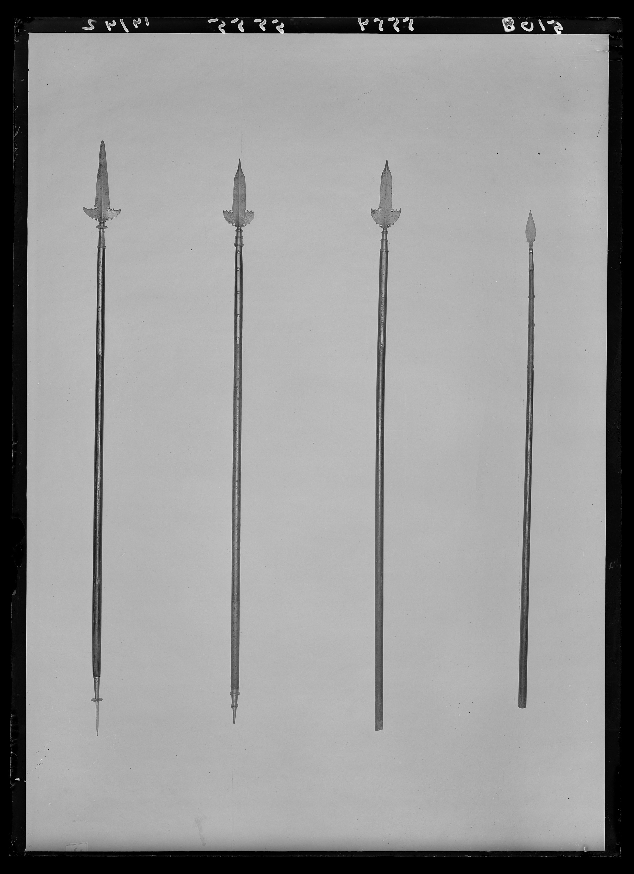 Klinga av stål med antydd ryggås, lancettformig med två små utskott, ett på vardera sidan på klingans nederdel. Punsad dekor av volutmönster. Åttkantig kulformig hals L: 15 mm. Åttkantig uppåt avsmalnande holk, L: 57 mm. Hals och holk med samma dekor som klingan. Fäst vid skaftet med stålskenor, L: 328 mm, fästade med mässingsnitar. Skaft av betsat trä (furu). Avsågat nedtill. Något smalnande uppåt.