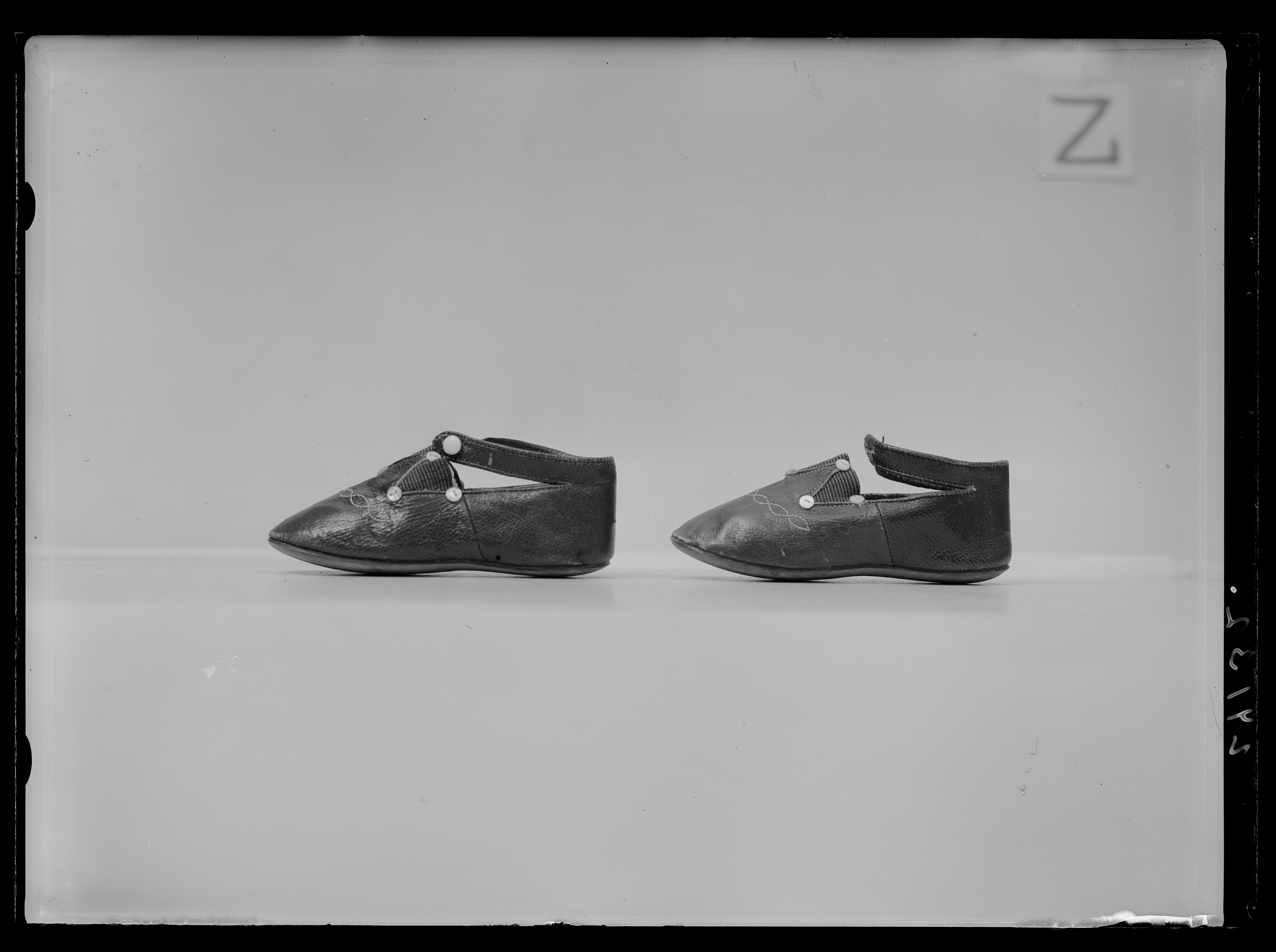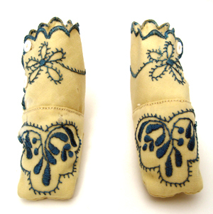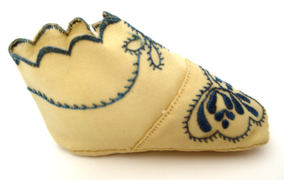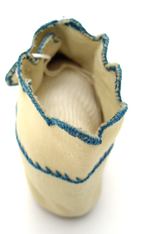 Sockan skuren i ett ovanläder, ett skaft och en sula som är vändsydd. Ovanlädret och skaftet förenas med en söm över vristen. Sockan har ett helfoder av benvitt linne. Ovanlädret är vadderat. Skaftets högra del går omlott över vristen och avslutas i uddiga utstkärningar. Sockan knäpps på vänster sida över vristen med ett par små, vita plastknappar. Upptill avslutas sockan med uddiga utskärningar. Sockan är framtill över tåpartiet dekorerad med ett blått silkesbroderi i plattsöm. Runt sockans öppning och längs med knäppningen har dekorerats med blått silke i plattsöm. På skaftet vid knäppningen löper en smal broderad stjälk i blått silke som övergår mitt fram i en blomma.