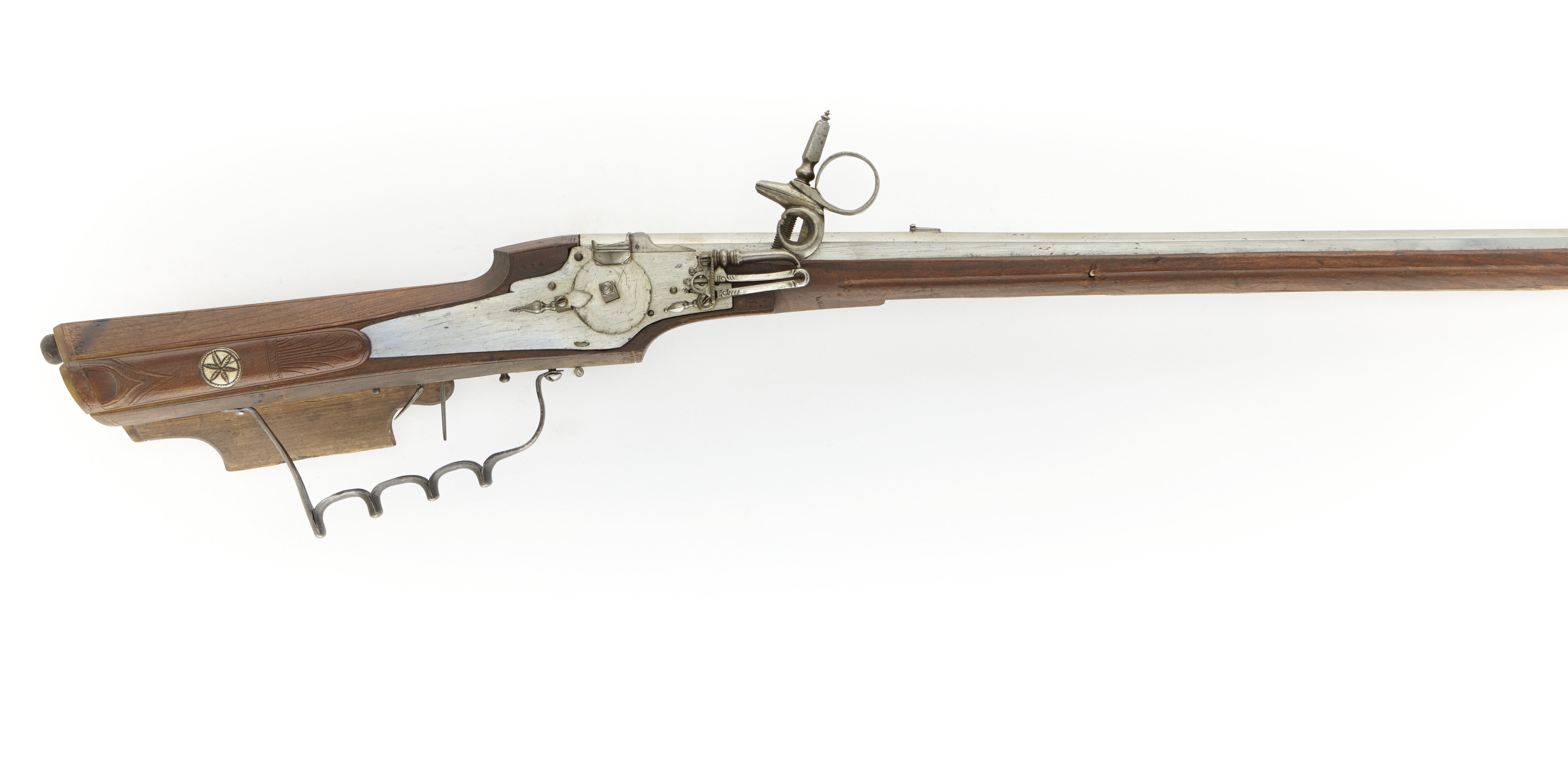 Åttkantig pipa av stål, åtta räfflor. Kort siktskåra över kammaren. Lågt ståndsikte av stål och stolpkorn av mässing. På kammarens undersida finns en stämpel: IB. (se Stöckel 3214). Hjullås med plant låsbleck av tysk typ - bakåt avsmalnande genom två fall. Hjulet är fasthållet av en pilformig krampa kl. 9. Låg krutskärm. Hane med lös överkäke med cirkelformat fingergrepp och ringformad hanhals. Brun helstock av trä med smal kolv av tysk typ. Bakplåt och stödkula är av horn. Kolvlåda med lock av trä med rund, graverad benplatta. Rund, graverad benplatta även på anslaget. Två runda låsbrickor av graverat ben. Framstocken har en längsgående profilering. Näsband och rörka av graverat ben. Avtryckare med snällare. Varbygel av stål med tre fingerlägen. Tillbehör: Laddstock av trä med gängad stålskoning. Fem förladdningar av skinn. Märkt: 436 ovanför låsblecket, stanstyp 5376. 23 med stora bläcksiffror på anslaget. 36 med blyerts på anslaget. Enligt 1710 års inventarium p. 13, rum II: "50-436-1 Lång Reflebyssa D:o med lod Forma till -8-".