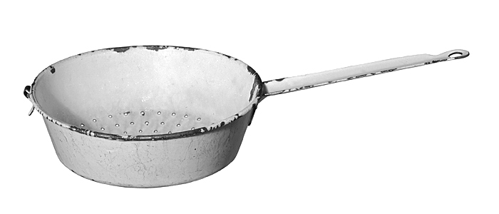DURKSLAG Av vitemaljerad stålplåt. Runt, med snett uppstående hög kant, skålig botten och nästan rakt utstående skaft. Bottnen genombruten med runda hål i koncentriska ringar; kring brädden en utstående stav; skaft av platt skena, nästan jämnbrett och rännformigt, yttre änden med insvängda kanter, i denna ett ovalt hål; inre änden nedböjd i en rundad flik och fäst med tre nitar; på motsatta sidan en utåt omböjd S-formad hake av platt skena, fäst med två nitar. Höjd: 7,6 cm.; diameter: 20,8 cm. Skaft, längd: 18,5 cm.