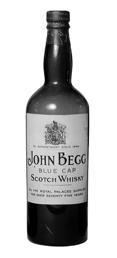 "BLUE CAP", John Begg, tolv helbuteljer Av grönt glas. Cylindriska, med kupigt indragen skuldra och spolformig hals med en bred och en smal stärkring; bottnen insänkt. Etikett vit, på denna text i svart och blått, dessutom upptill i färger Storbritanniens riksvapen (firman hovleverantör sedan 1848). Kapsylfragment av förtent bly, mörkblåfärgat, med text i förgylld relief. Höjd: 29,4 cm.; diameter: 8,3 cm.