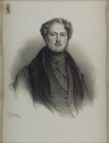 Litografi föreställande Charles Auguste Morny (1811-1865) greve, fransk minister. Midjebild , sittande fas höger. Frack och väst. Lindhalsduk. I övre vänstra hörnet vapensköld med furstekrona och stående krönt lejon på stripad botten. Signerad : "Joh. Cordon 1838". På baksidan lapp med namnuppgift: "Torde vara: fransyske Ministern Gref: Mornay" samt "(accetionen 1846 s 220)".