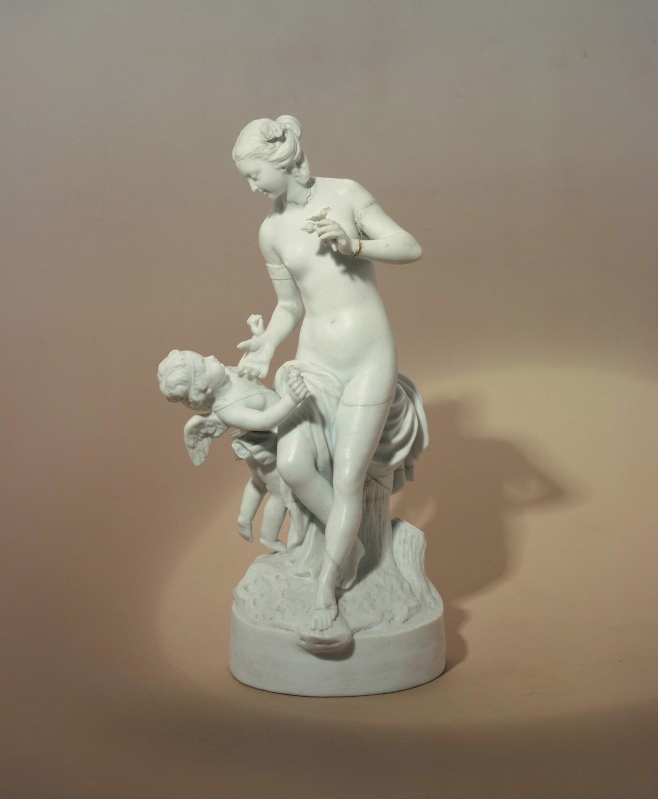 FIGURGRUPP. Grupp i biskiv på fotplatta med Venus naken sittande på en stubbe och Amor vid hennes högra sida.