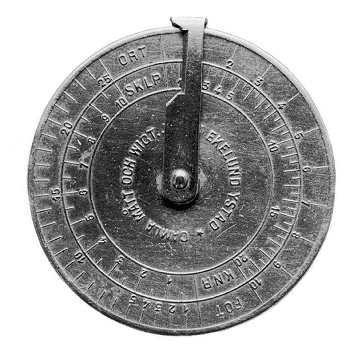 Rund förvandlingsskiva av mässing med två bårder med skalor och ord (ORT, SKLP (Skålpund) FOT, KNR (Kannor) GRAM, KILO, METER, LITER. I bårderna för övrigt siffror och siffertal vid respektive streck. Inom bårderna på vardera sidan i cirkel GAMLA MÅTT OCH VIGT. JOHAN EKELUND YSTAD., på den sistnämnda sidan: NYA MÅTT OCH VIGT PATENT 22/6 1880. På skivan finns en rörlig visare och då förvandling från ena systemet till det andra skall göras ställs visaren vid vederbörande siffertal på ena sidan varvid visaren på brickans andra sida anger det motsvarande måttet. Tillhört inventarierna i Wilhelm H. Kempes privata kontorsrum inrymt i Schinkelska huset, dåvarande adress Kornhamnstorg 2 (nuvarande Kornhamnstorg 4) i Stockholm.