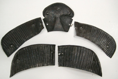 Av driven tunn stålplåt med vertikal räffling. A: Plåt till sadelknappen. L 220 B 210 mm Vikt 161 g.. Något skålad plåt med rundad invikt övre kant. Sidorna raka och svagt nedåt avsmalnande. Ett hål upptill i mitten och nertill i var sida. B: Plåt till frambom, höger. L 325 B 195 Vikt 170 g. Rektangulär med inre kant rak och yttre rundad. Övre kant invikt. Ett hål i var sida. C: Plåt till frambom, vänster. L 310 B 150 mm Vikt 160 g. Som ovan. D: Plåt till bakbom, höger. L 335 B 150 Vikt 181 g. Avlång svagt välvd plåt. Inre kant rak och yttre sluttande. Övre kant invikt. Ett hål i var sida. E: Plåt till bakbom, vänster. L 335 B 160 Vikt 188. Som ovan.