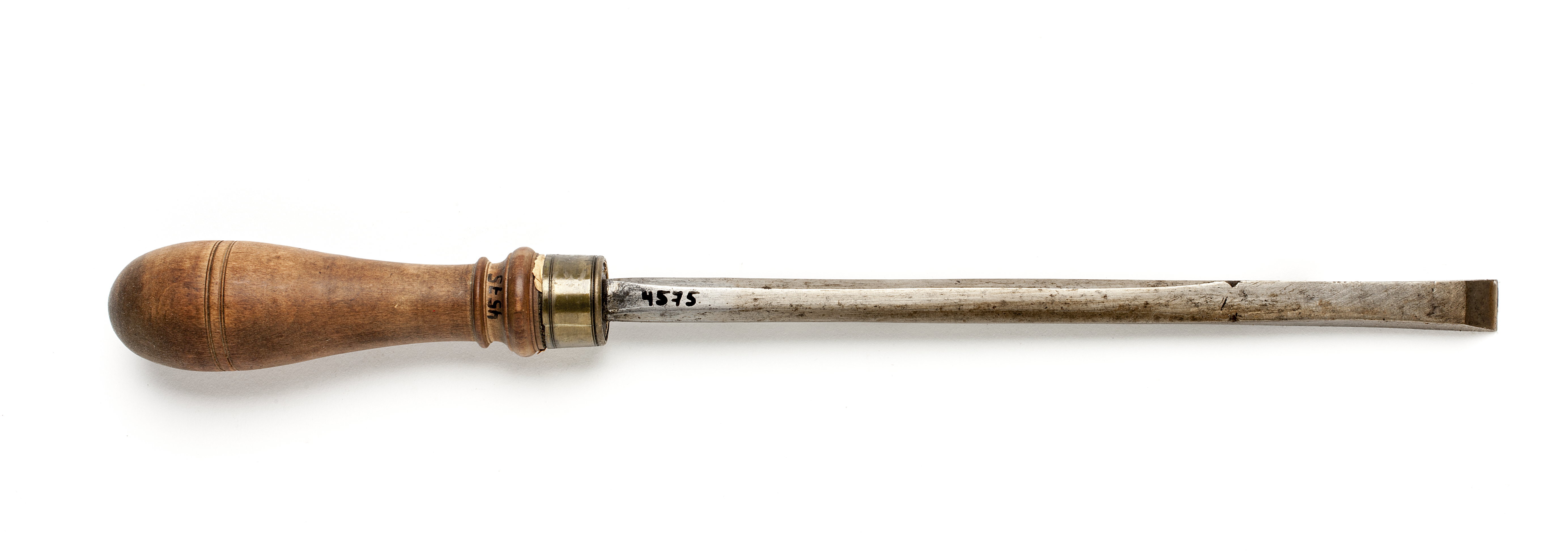 Klinga med åttsidig, i änden rektangulär genomskärning. Stämplat på stålet: venustecken. Svarvat skaft av päronträ, med två vulster nedtill. Mässingsring.