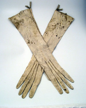 Högerhandske av vitt skinn. Tre sömmar på handryggen. En 5 mm bred sidenkant. Två små sidenband fastsydda på insidan.