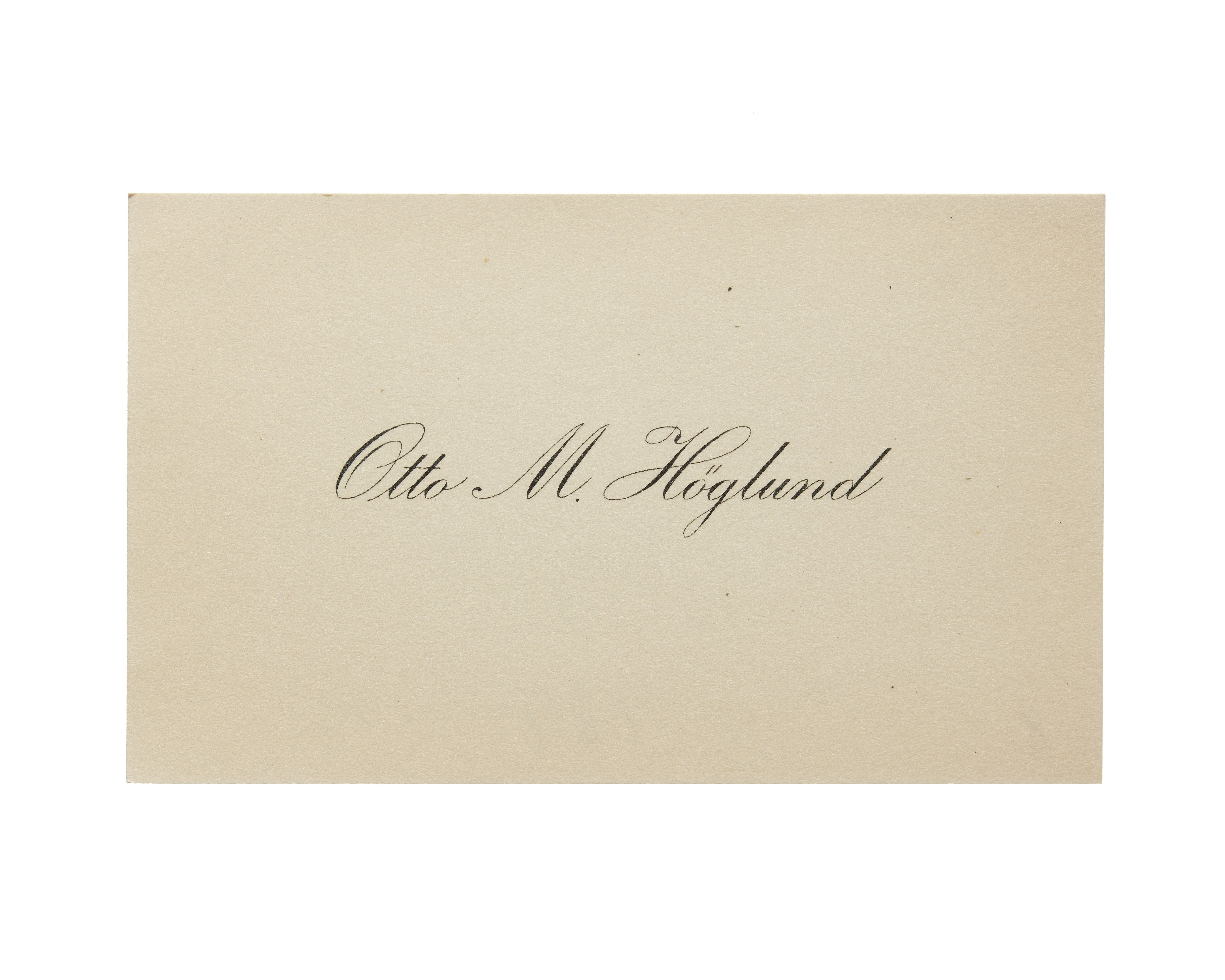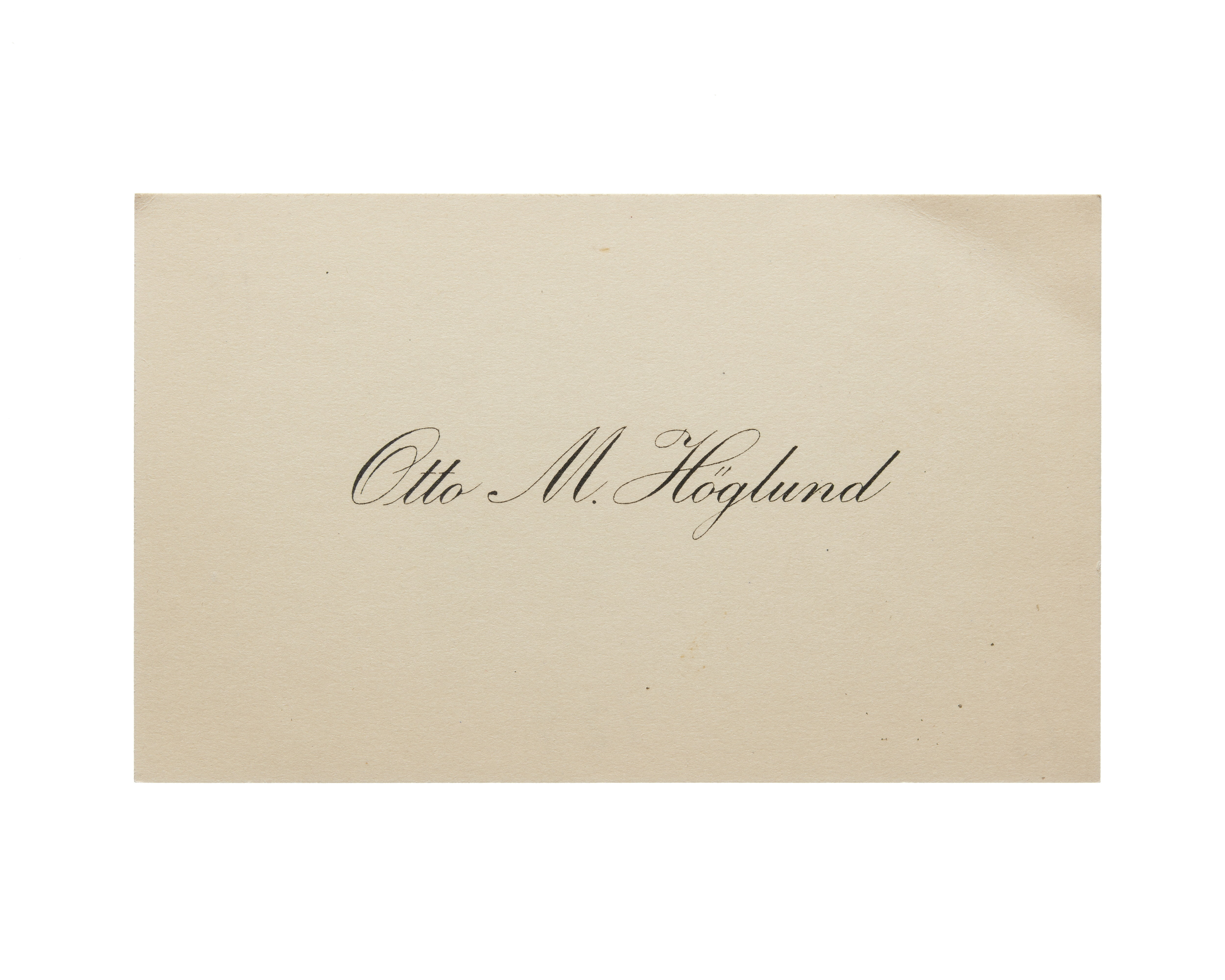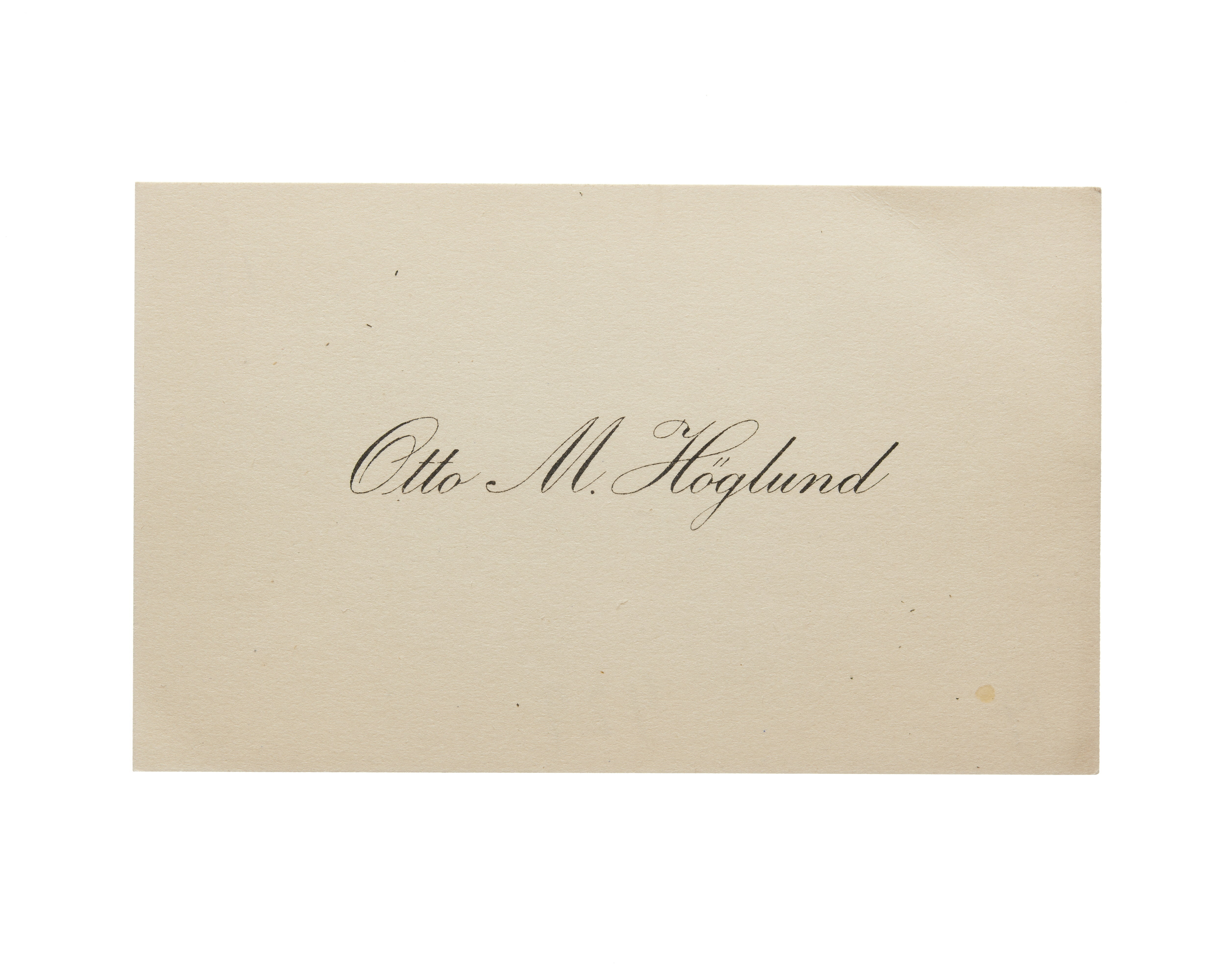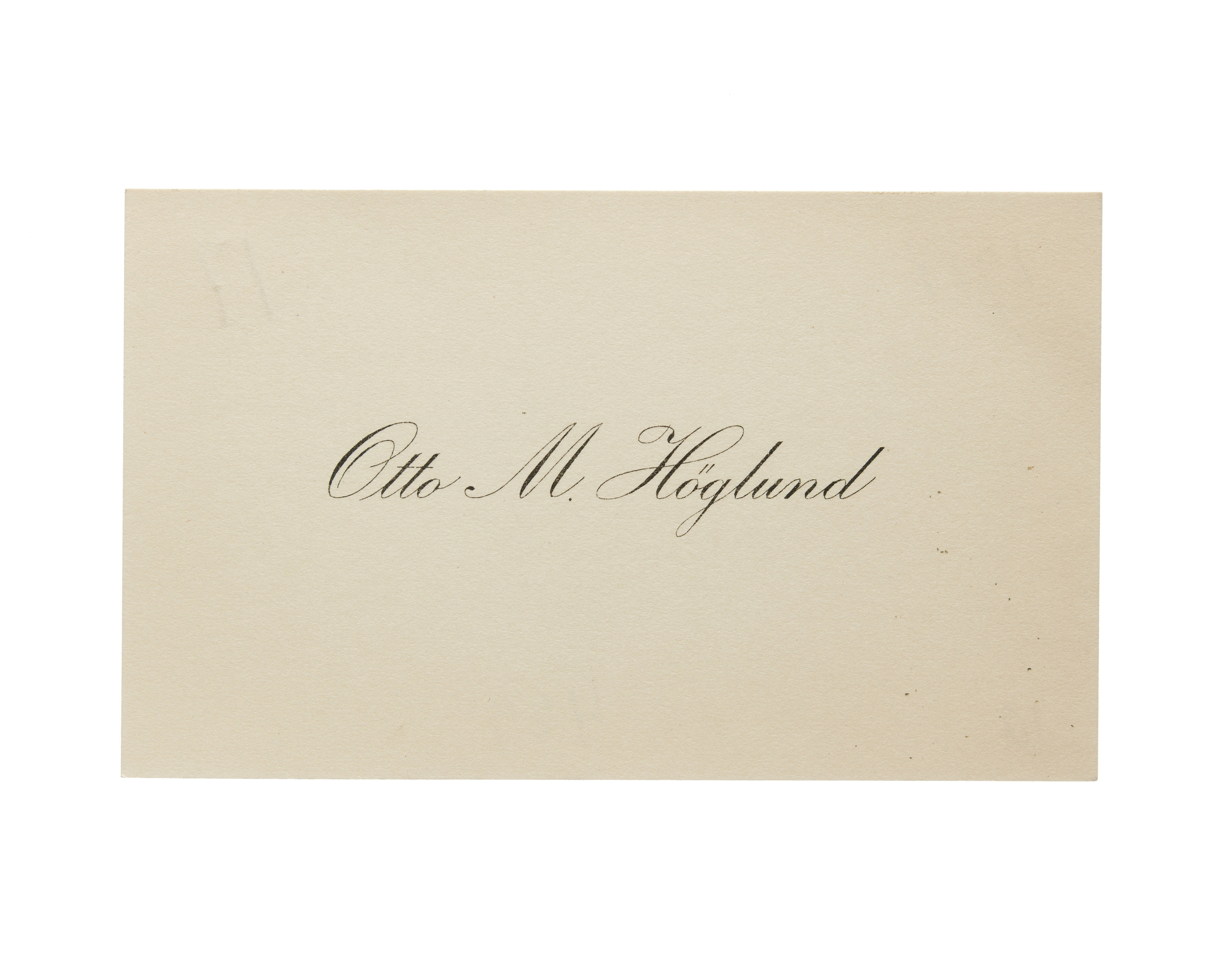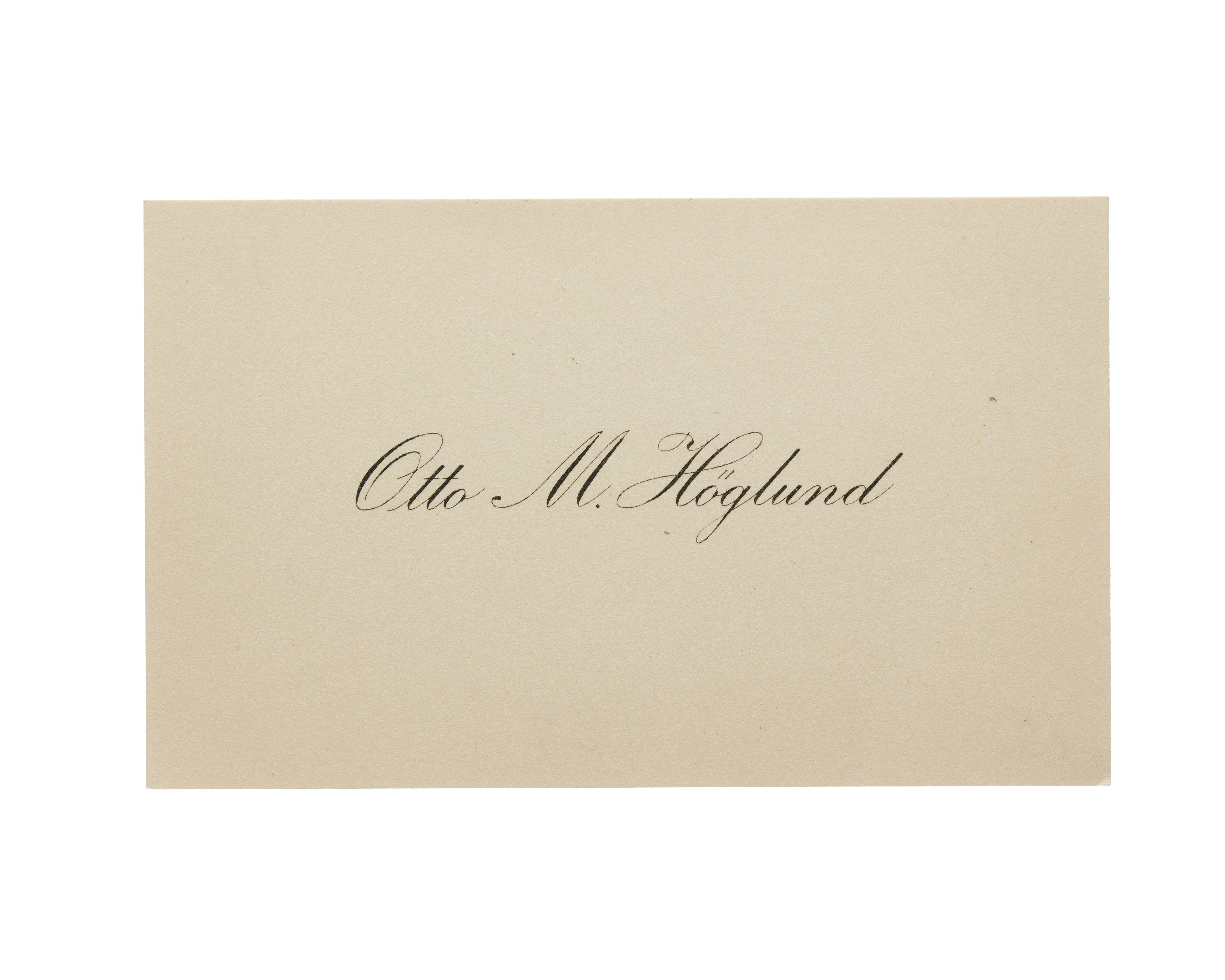 Tjugotre visitkort från Otto M. Höglund. Första kortet är utan datum. Andra kortet är utan datum, vikt i övre vänstra hörnet. Tredje kortet är utan datum. Fjärde kortet är utan datum. Femte kortet är utan datum, vikt i vänstra sidan. Sjätte kortet daterat 26.01.1914. Överlämnat i samband med Walther von Hallwyls 75-årsdag, 26 Januari 1914. Sjunde kortet daterat 1916. Åttonde kortet daterat 1916. Nionde kortet daterat 1917. Tionde kortet daterat 1917. Elfte kortet daterat 1917. Tolfte kortet daterat 1917. Trettonde kortet daterat 1918, vikt i övre högra hörnet. Fjortonde kortet daterat 1918, vikt i övre högra hörnet. Femtonde kortet daterat 1918. Sextonde kortet daterat 1919. Sjuttonde kortet daterat 1919. Artonde kortet daterat 1919. Nionde kortet daterat 1919. Tjugonde kortet daterat 1919. Tjugoförsta kortet daterat 1920. Tjugoandra kortet daterat 1921. Tjugotredje kortet daterat 1922.