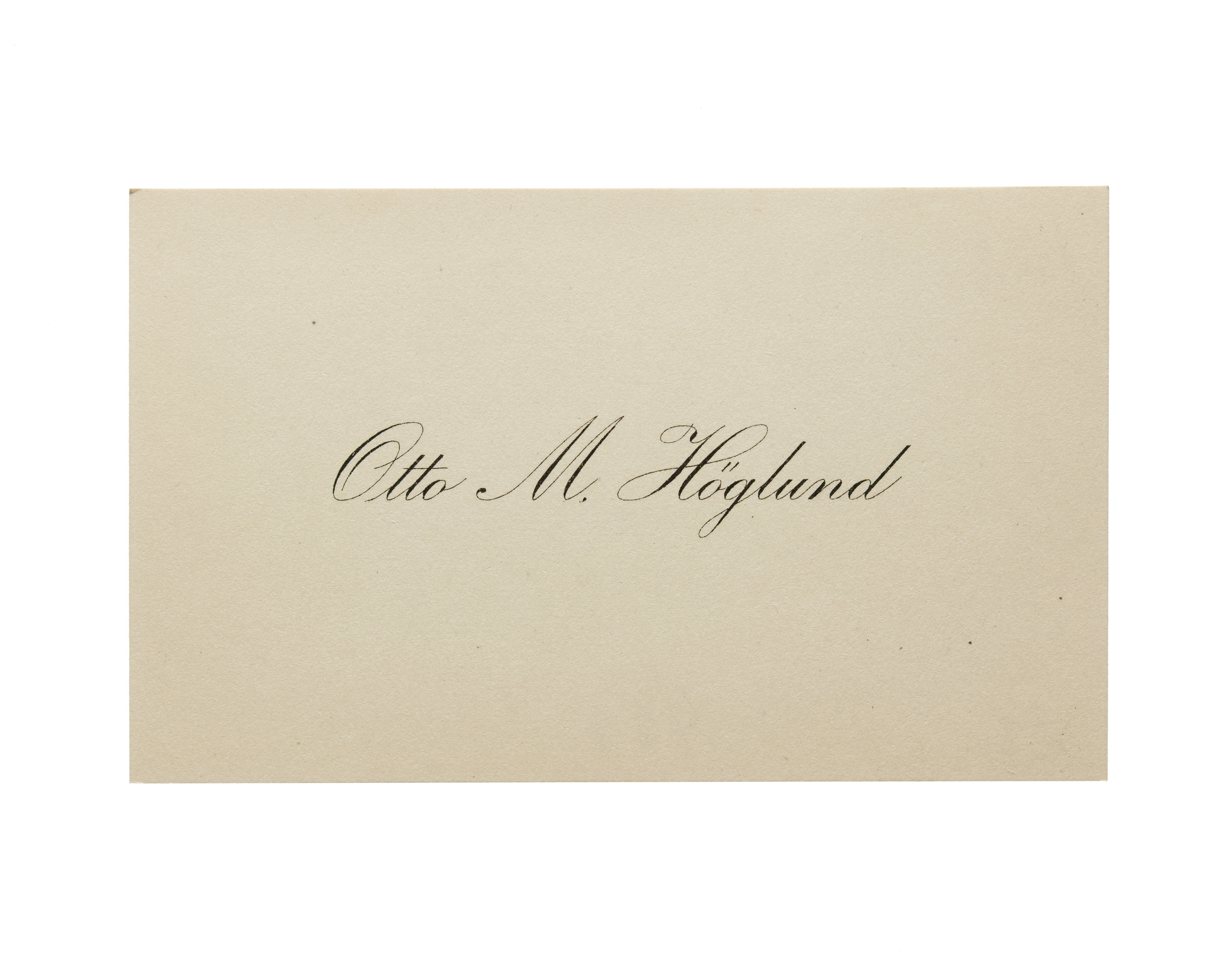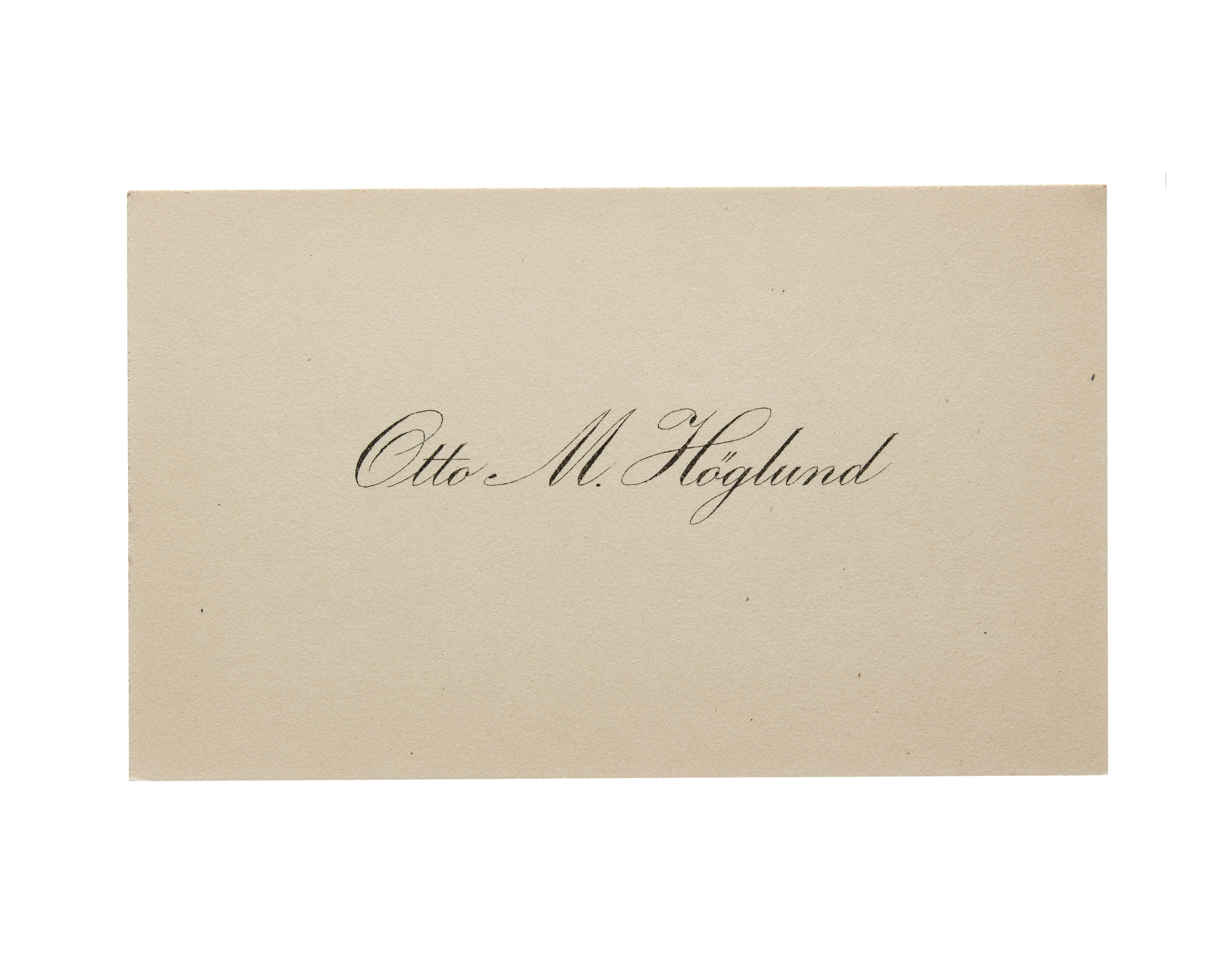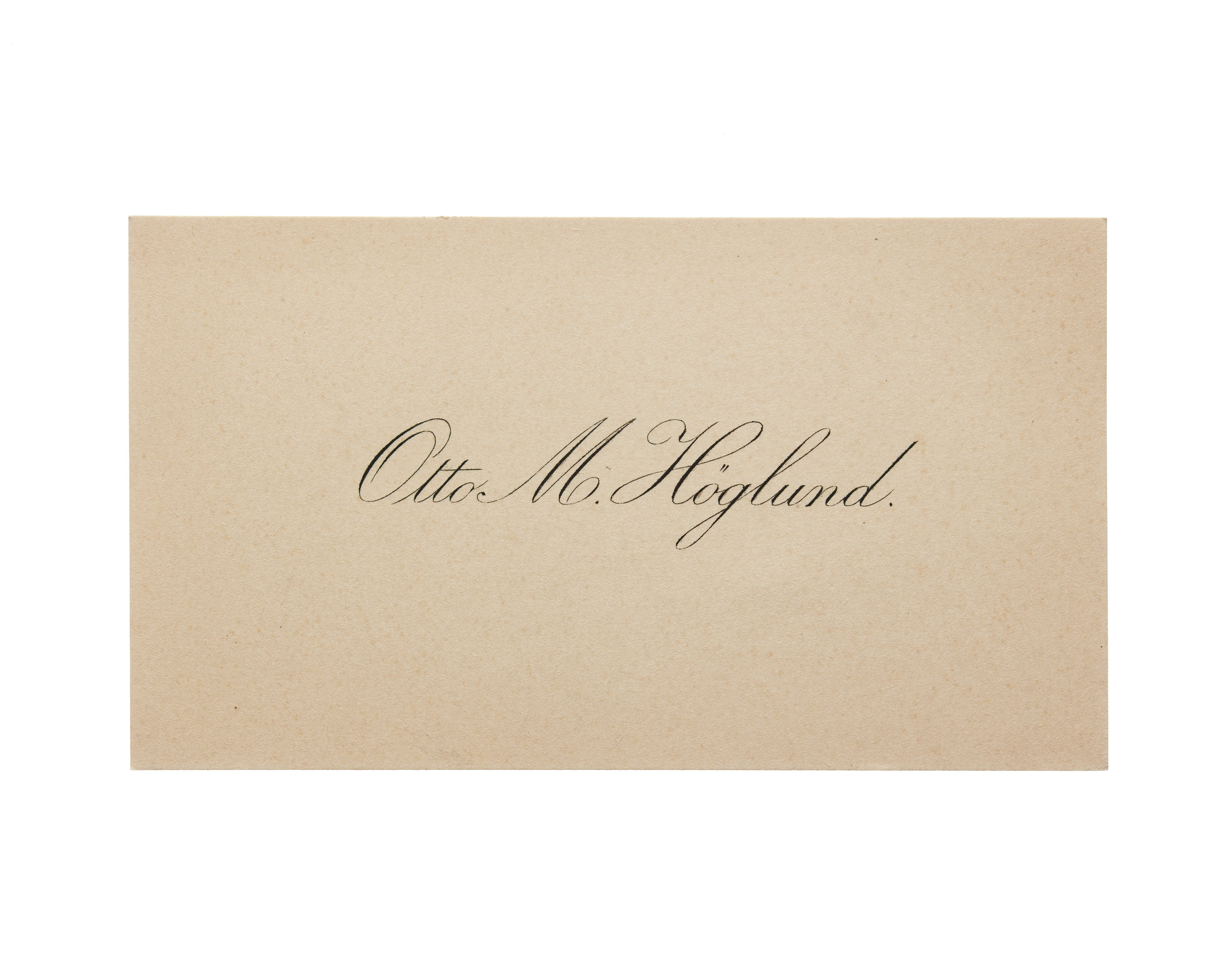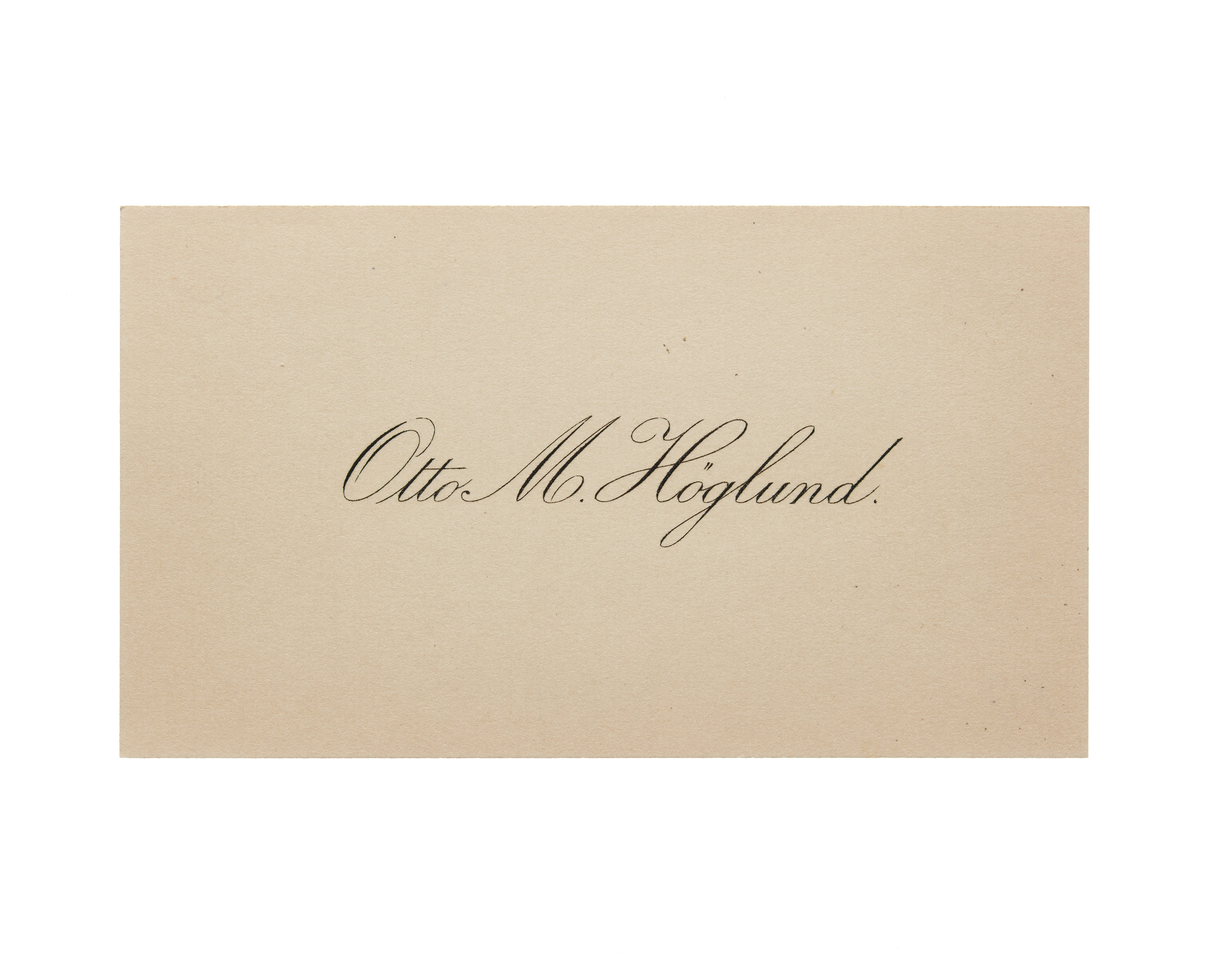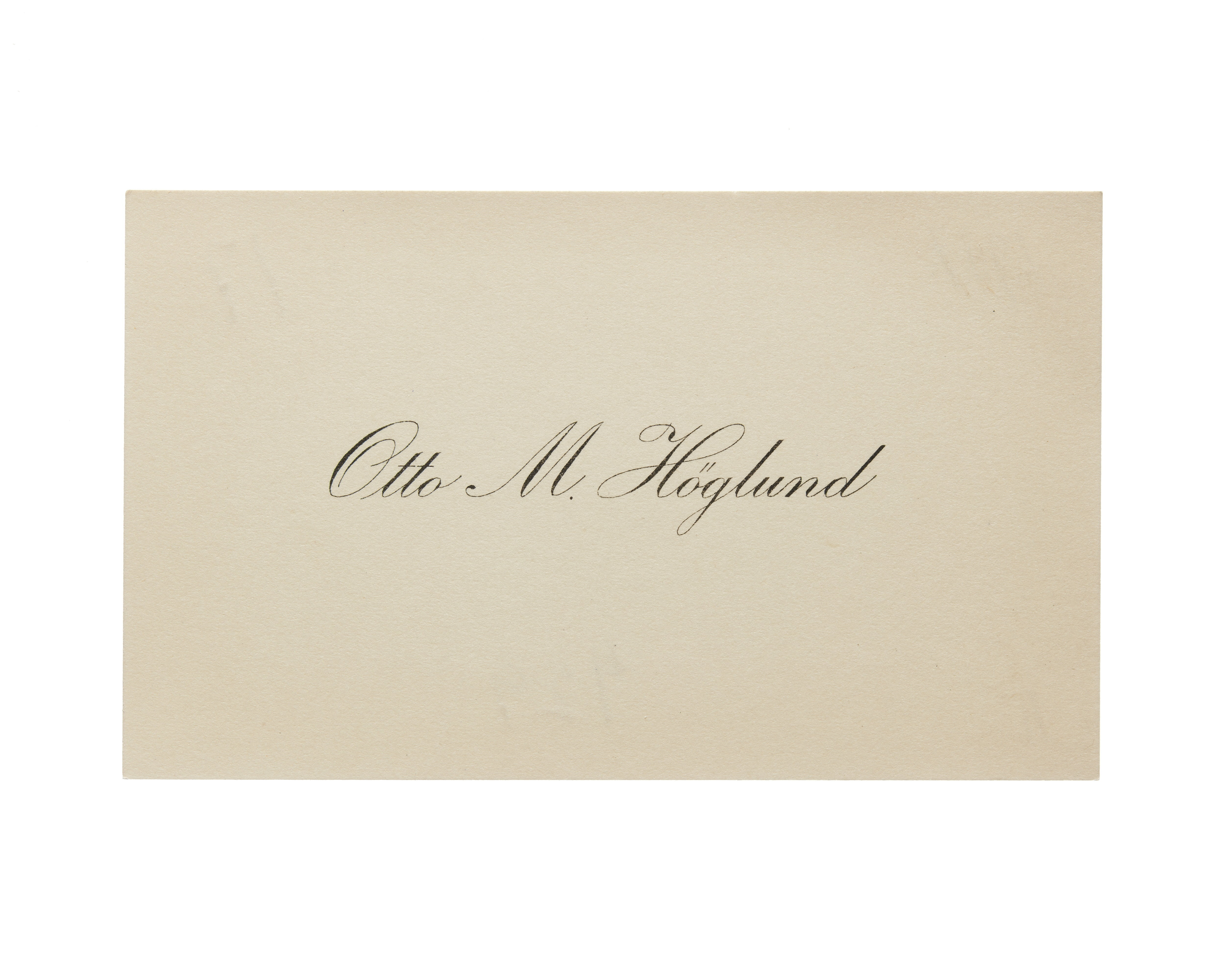 Tjugotre visitkort från Otto M. Höglund. Första kortet är utan datum. Andra kortet är utan datum, vikt i övre vänstra hörnet. Tredje kortet är utan datum. Fjärde kortet är utan datum. Femte kortet är utan datum, vikt i vänstra sidan. Sjätte kortet daterat 26.01.1914. Överlämnat i samband med Walther von Hallwyls 75-årsdag, 26 Januari 1914. Sjunde kortet daterat 1916. Åttonde kortet daterat 1916. Nionde kortet daterat 1917. Tionde kortet daterat 1917. Elfte kortet daterat 1917. Tolfte kortet daterat 1917. Trettonde kortet daterat 1918, vikt i övre högra hörnet. Fjortonde kortet daterat 1918, vikt i övre högra hörnet. Femtonde kortet daterat 1918. Sextonde kortet daterat 1919. Sjuttonde kortet daterat 1919. Artonde kortet daterat 1919. Nionde kortet daterat 1919. Tjugonde kortet daterat 1919. Tjugoförsta kortet daterat 1920. Tjugoandra kortet daterat 1921. Tjugotredje kortet daterat 1922.