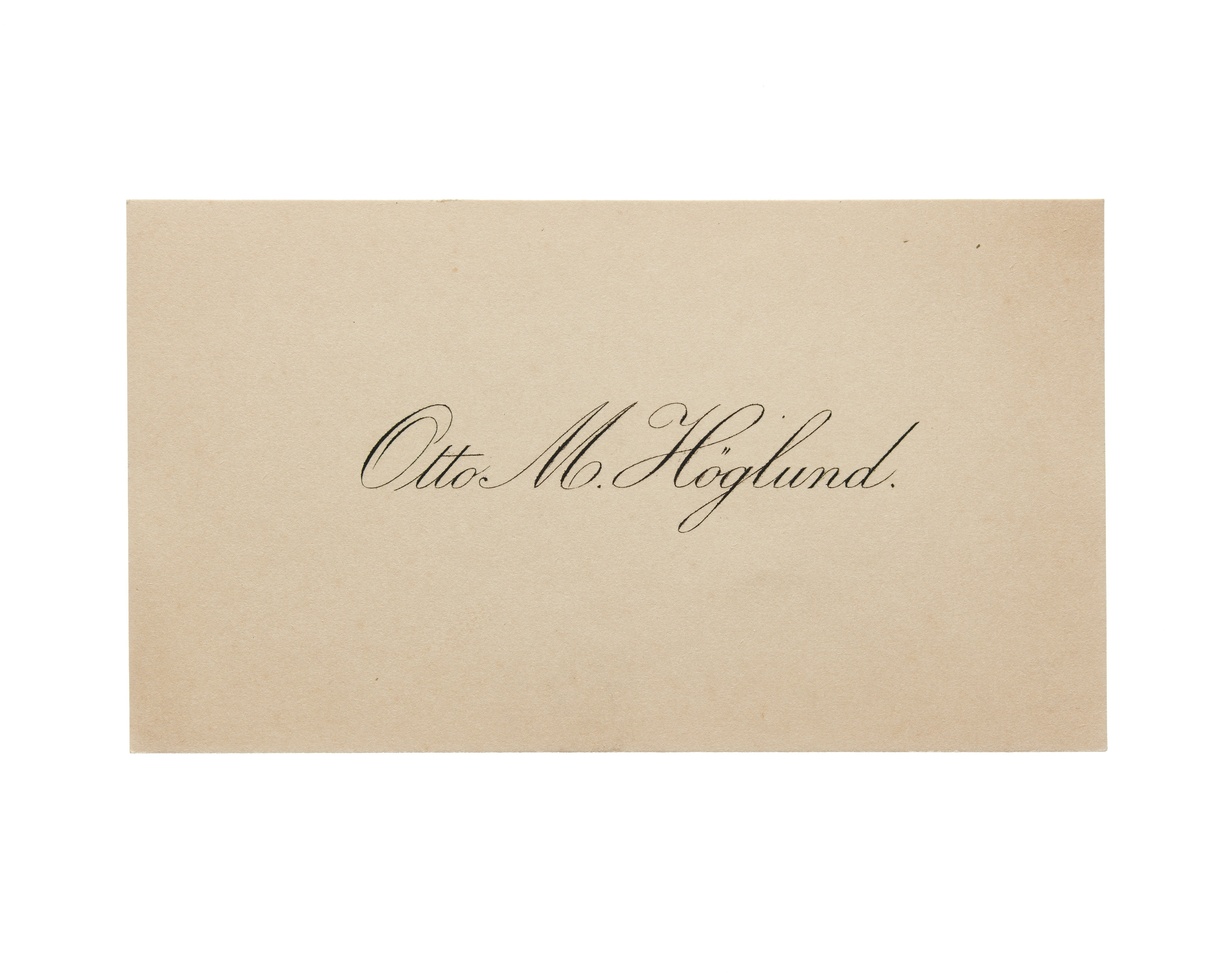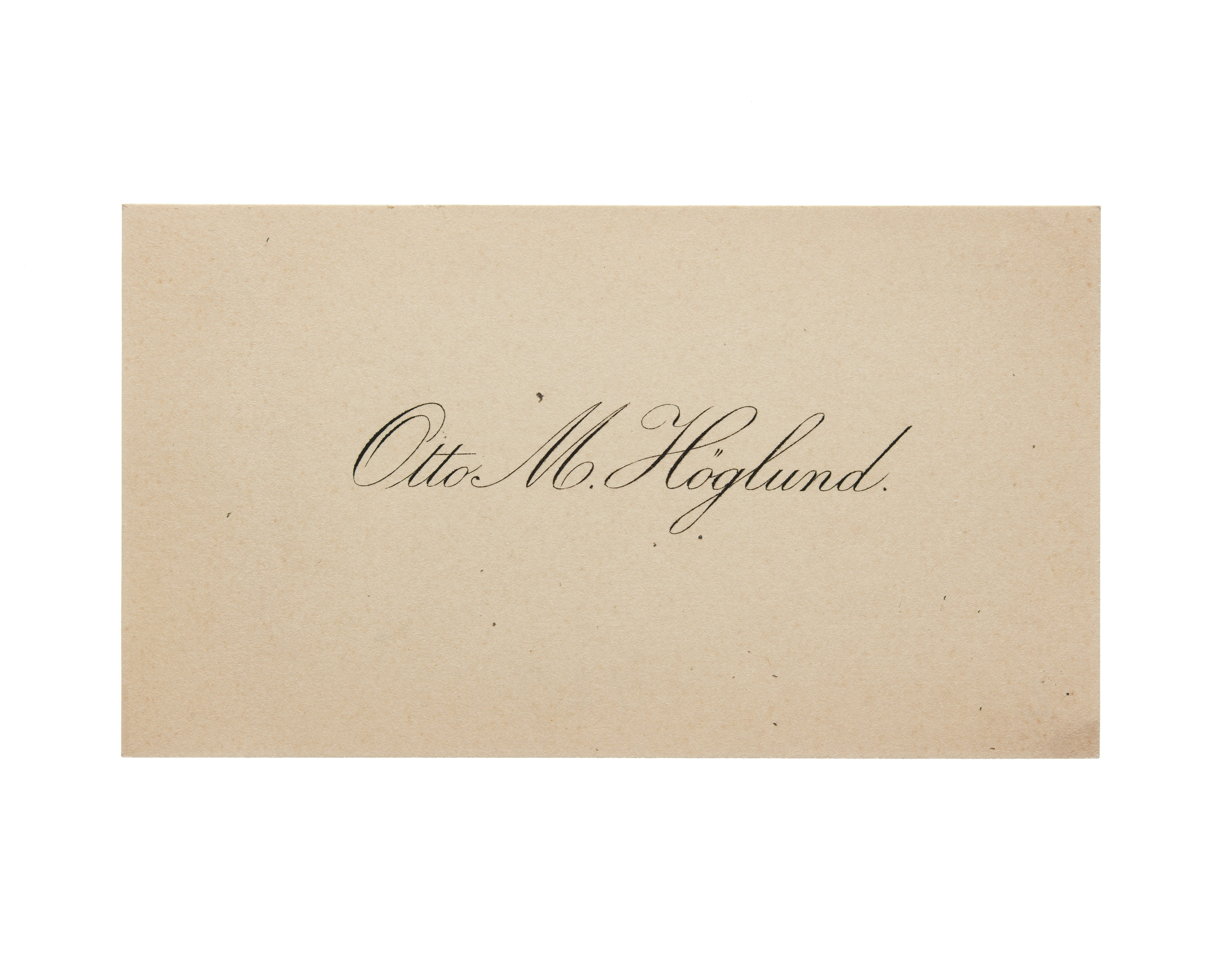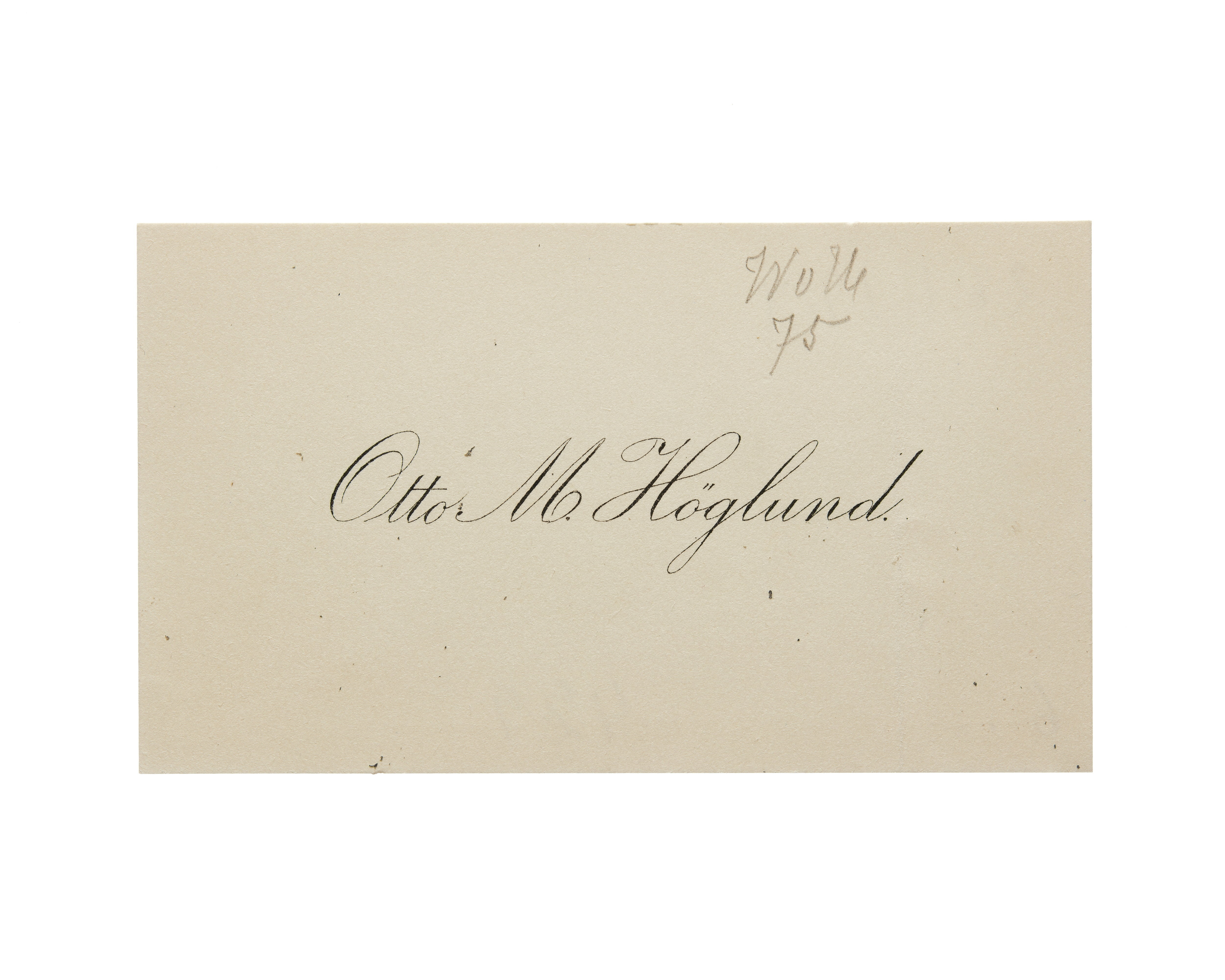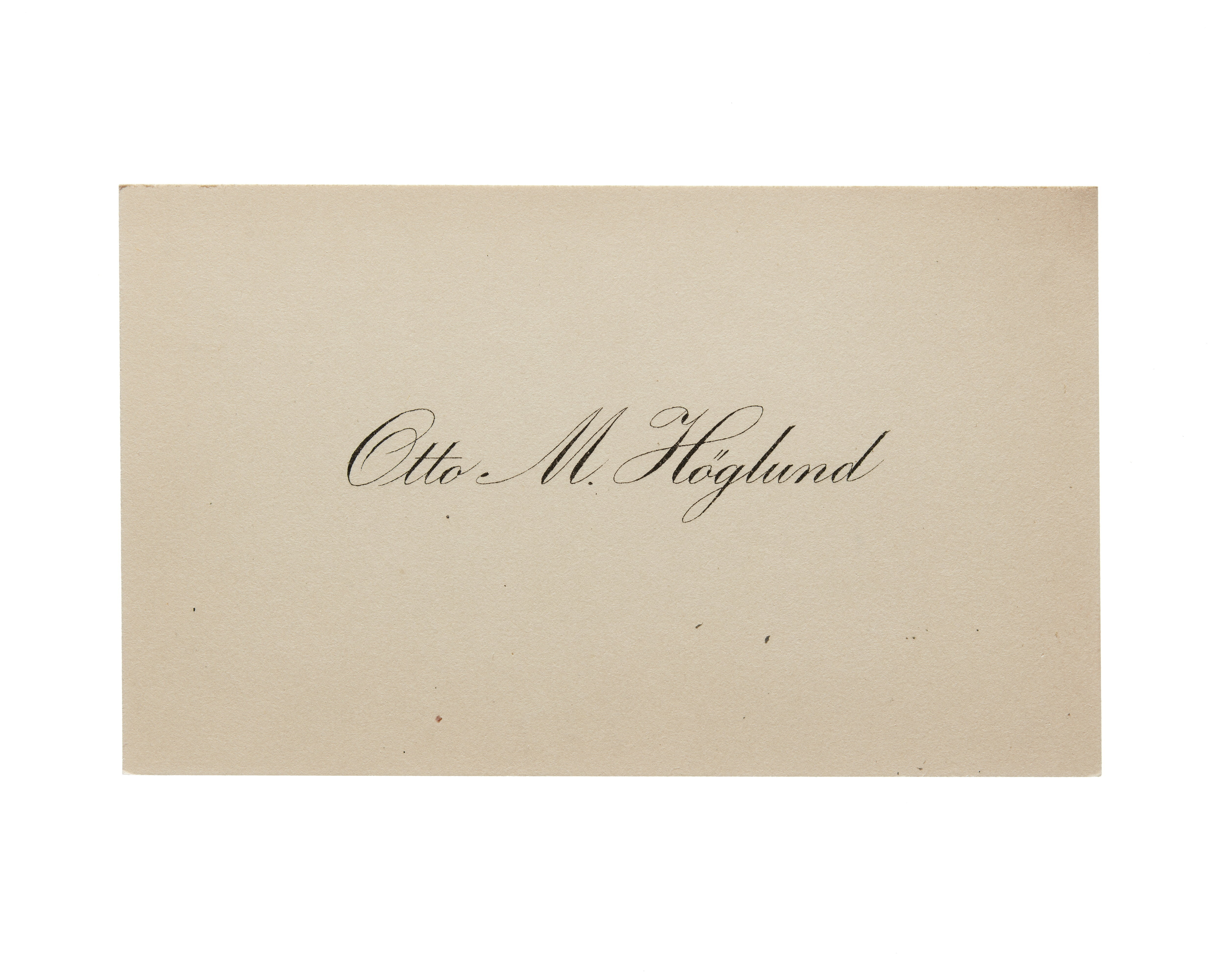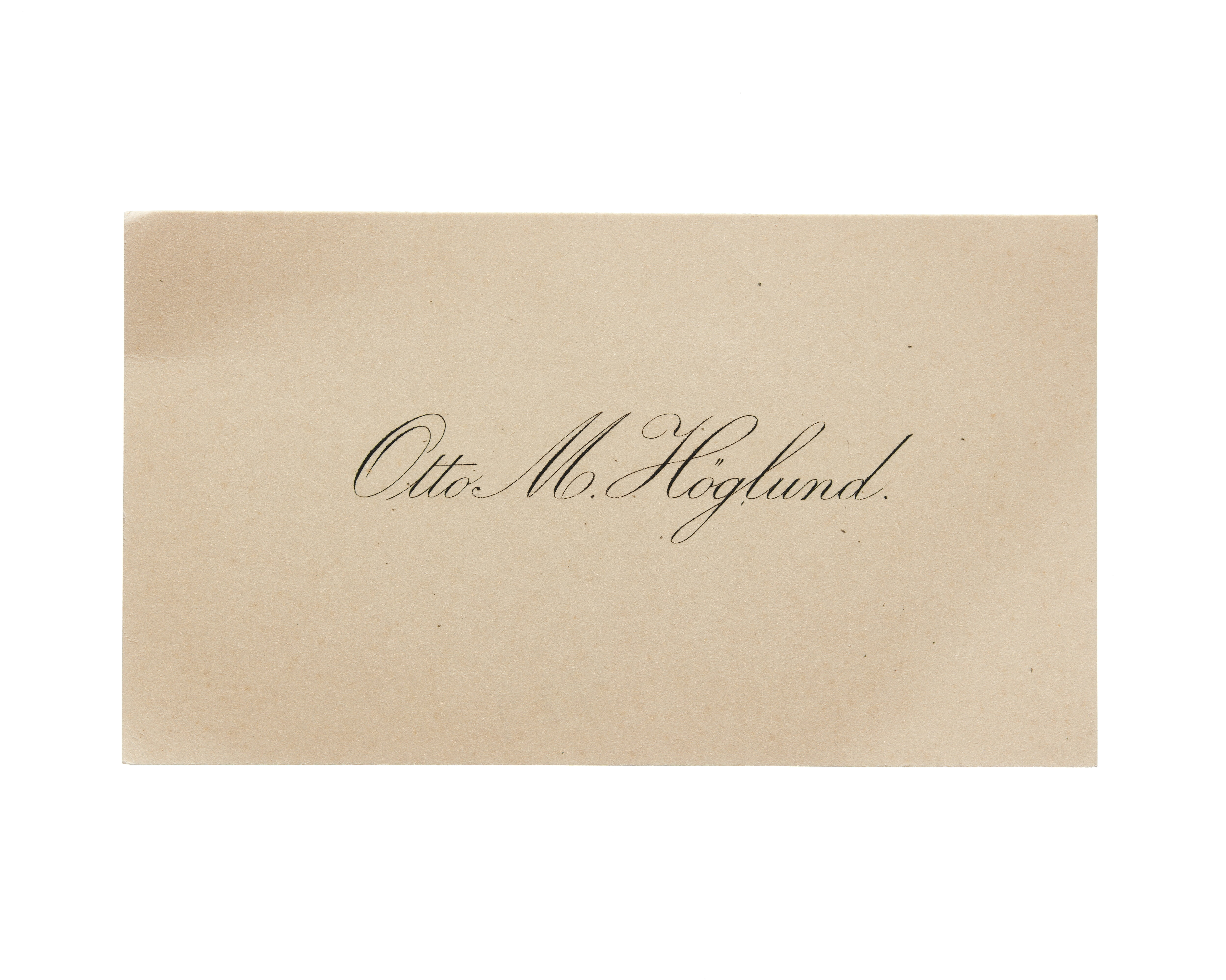 Tjugotre visitkort från Otto M. Höglund. Första kortet är utan datum. Andra kortet är utan datum, vikt i övre vänstra hörnet. Tredje kortet är utan datum. Fjärde kortet är utan datum. Femte kortet är utan datum, vikt i vänstra sidan. Sjätte kortet daterat 26.01.1914. Överlämnat i samband med Walther von Hallwyls 75-årsdag, 26 Januari 1914. Sjunde kortet daterat 1916. Åttonde kortet daterat 1916. Nionde kortet daterat 1917. Tionde kortet daterat 1917. Elfte kortet daterat 1917. Tolfte kortet daterat 1917. Trettonde kortet daterat 1918, vikt i övre högra hörnet. Fjortonde kortet daterat 1918, vikt i övre högra hörnet. Femtonde kortet daterat 1918. Sextonde kortet daterat 1919. Sjuttonde kortet daterat 1919. Artonde kortet daterat 1919. Nionde kortet daterat 1919. Tjugonde kortet daterat 1919. Tjugoförsta kortet daterat 1920. Tjugoandra kortet daterat 1921. Tjugotredje kortet daterat 1922.
