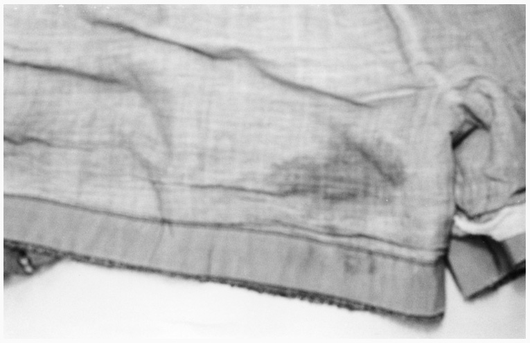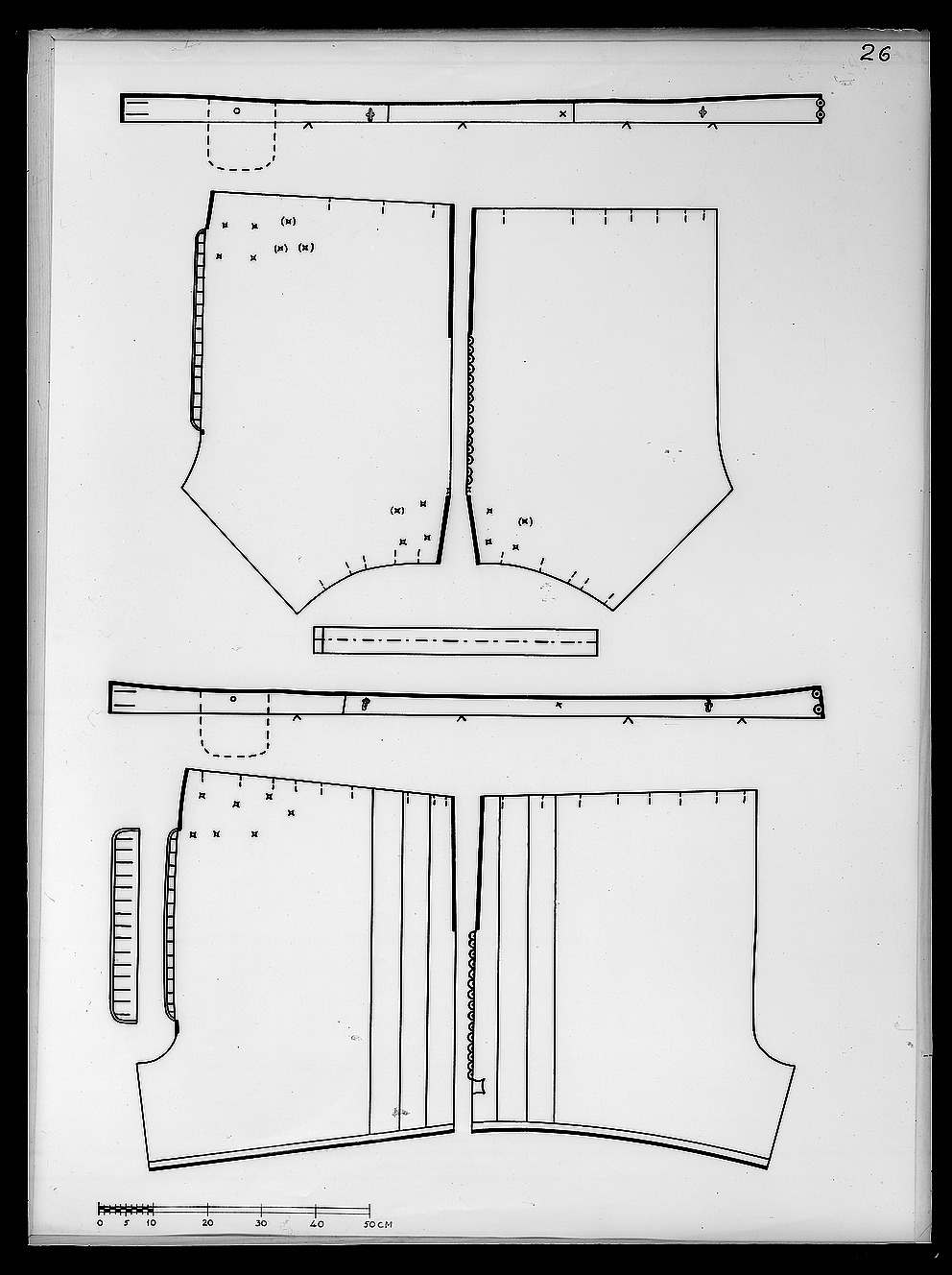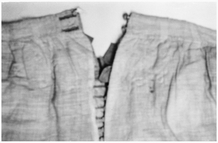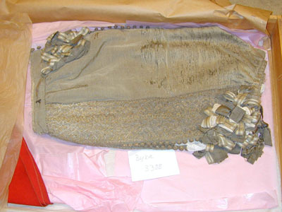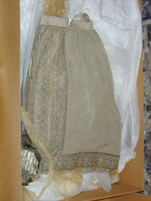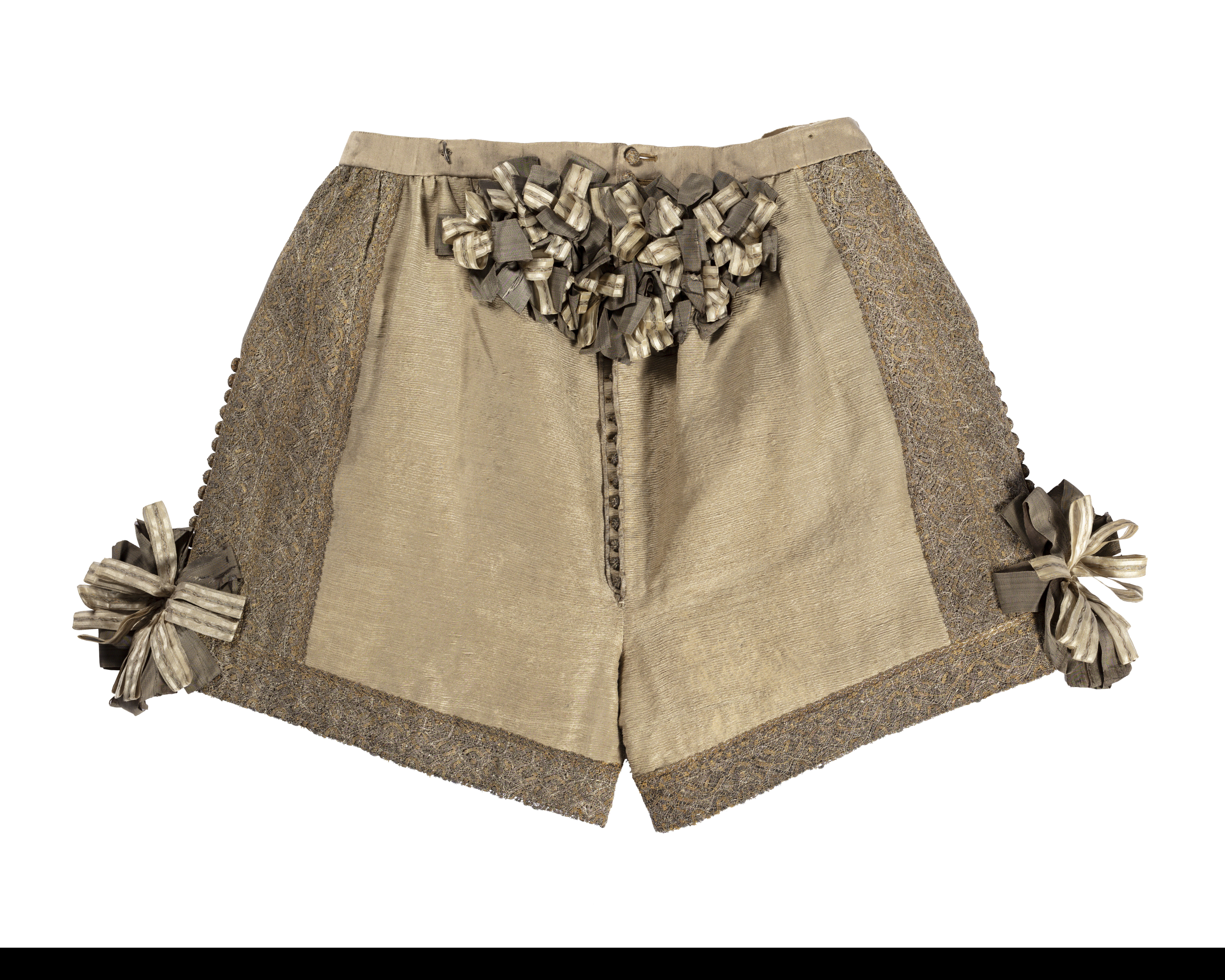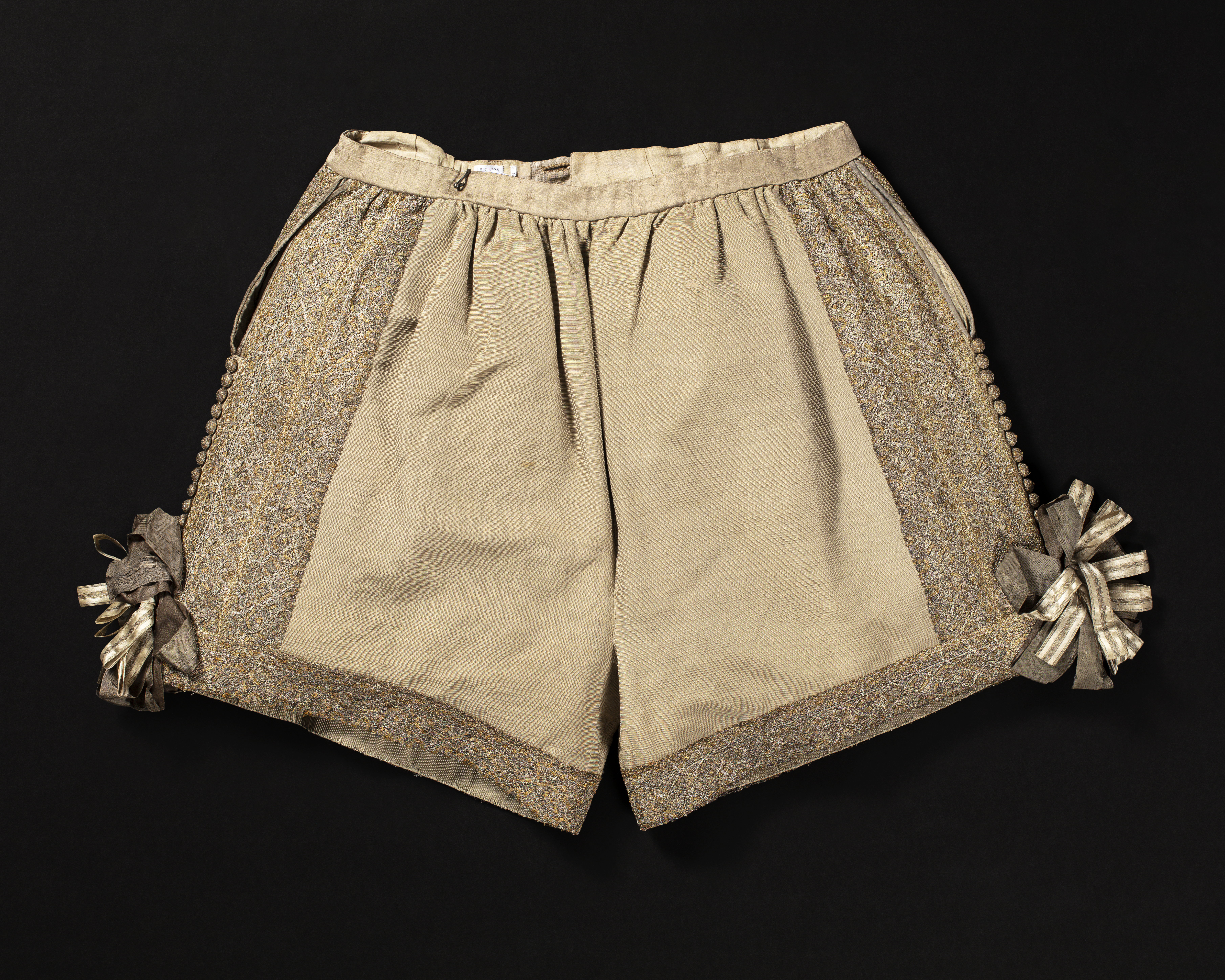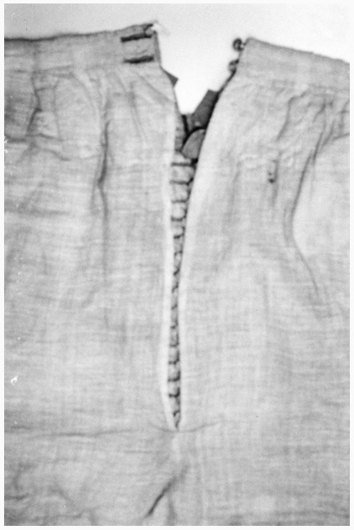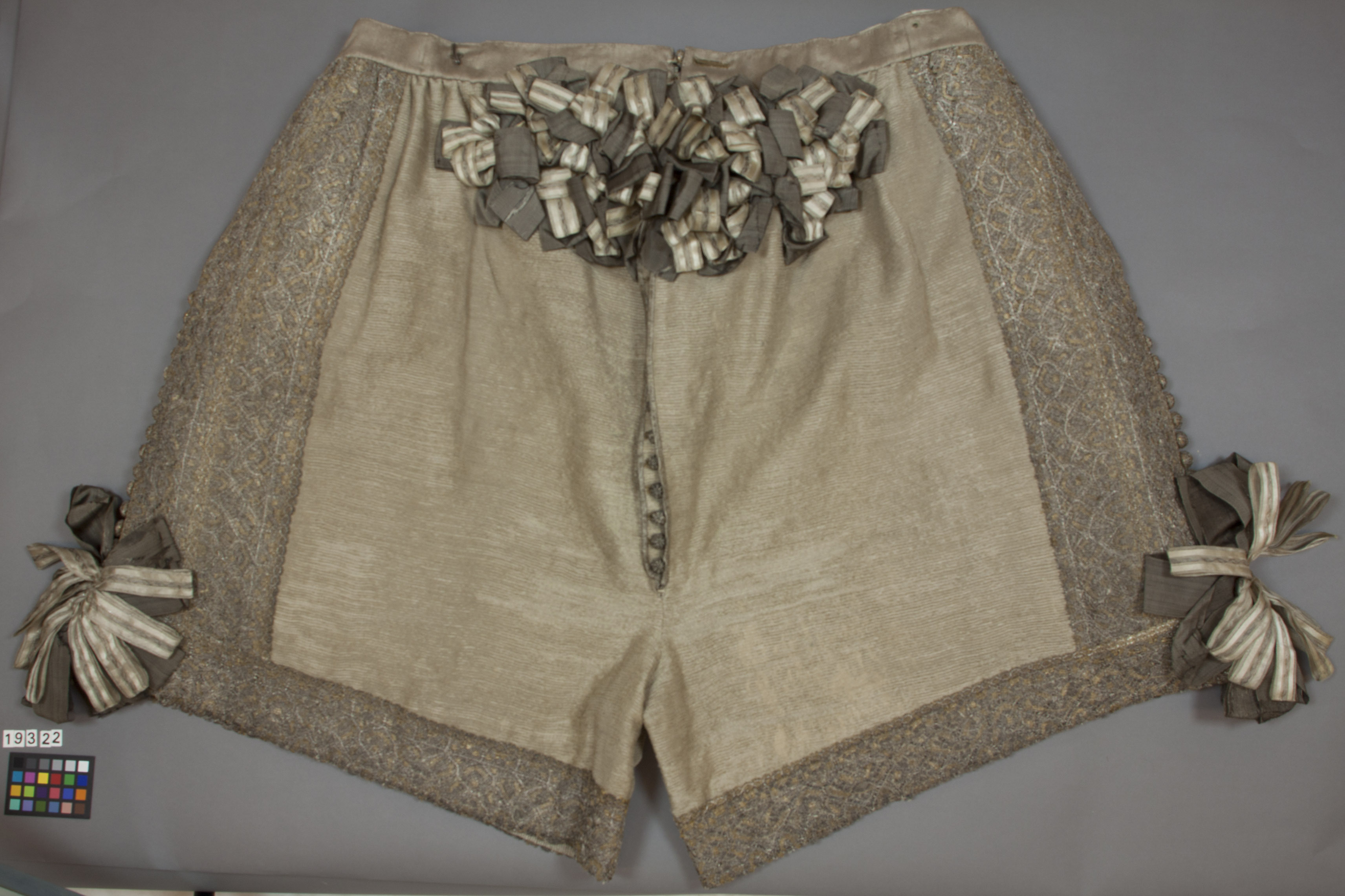 Byxorna är av samma grå rips som jackan. De är av rak, vid modell. Då byxorna har ca 15,5cm breda spetsgarneringar på ömse sidor om sidsömmarna, har man under denna garnering kunnat dölja att man skarvat tyget på följande sätt: det egentliga tyget sträcker sig ca 1cm under den yttersta spetskanten och här tar en 5 respektive 5,5 cm bred remsa vid av rips med svart inslag (av samma sort som bildar kantskoningen). Härefter följer så en 5 resp.5,5 cm bred remsa av det "ordinarie" tyget, som i sin tur skarvats till den yttersta remsan närmast sömmen. Denna är 4,5 resp. 5 cm bred. Alla remsor går på samma led som det egentliga tyget. Man har också dragit in på byxbenens längd en smula under den ca 7 cm breda horisontella spetsgarneringen nedtill och lagt en ca 2 cm bred snedslå under det egentliga tyget, som i sin tur ej avslutats med söm eller fåll. Byxorna består likväl som vanligt av i huvudsak 4 stycken, som sytts samman i sidorna och baktill med raka sömmar, medan framkanterna sneddats obetydligt. Här ligger det nästan 48cm långa sprundet med en 36 cm lång knäpplså, som försetts med 15 knapphål. På högra framkanten saknas endast den översta av knapparna (som är 1,3 cm i diam. och silvertrådsomspunna och sydda med silverlan i sektioner så att de påminner om fröhus). Sidsömmarna har ca 25 cm långa ficksprund. Byxorna är upptill kraftigt rynkade vid den 132,5 cm långa linningen, som sytts av samma tyg men i motsatt riktning och försetts med en skarv. Den har 2 av de relativt små ursprungliga 4 silverhakarna kvar. Framtill sitter 2 större knappar (d: 1,7 cm) av samma slag som jackans. På linningens vänstra framstycke sitter också en liten urficka, som markeras genom sitt tränsade hål. Byxorna har även den ofta förekommande 4:e fickan nämligen under linningen framtill på höger sida. Den har ett 13,5 cm långt, vertikalt sprund och sitter 21 cm från framkanten upptill. Ficksäckarna är av vit linnelärft (27x24 tr/cm2) men stofferade med samma gråmelerade moiréfoder som finns i jackan. Ett grått mönstervävt band bildar skoning vid fickor och knäppslå. Byxorna är på insidan fodrade med ett tunt (nu mycket smutsigt) yllelärftsfoder (27x25 tr/cm2). Mellanfoder utgörs av ett gråbrunt ylletyg i tuskaft (21x16 tr/cm2) troligen med grå tvinnad varptråd och bruna tvinnade inslagstrådar). Mellan ripsen och yllefodret sitter dessutom underspetsarna en ytterligare förstärkning av grövre ljus linnelärft. Nedtill på insidan är byxbenen skodda med samma rips med svart inslag, som finns i dräkten nr 3411 och byxorna nr 3388. Byxorna garneras med en rad knappar av samma slag som jackans. De löper från ficksprunden och till ca 10 cm från nederkanten, eller till den stora sidorosetten och är till antalet 15 i varje sida. Förutom de väldiga bandrosetterna här nere finns alltjämt den övre bandgarneringen kvar upptill. Den utgörs av rosetter av gråsvart (ca 4,5 cm brett) sidenband (med grå varp och svart inslag, 52x24 tr/cm2) och (2,5 cm brett) vitt atlasband (mönstervävt med guld- och silvertrådar ca 17 inslagstr/cm) och rader av silverlan utåtkanterna. Framtill sitter 7 små rosetter nedanför linningen på varje stycke, 4 i en övre horisontell rad och 3 i en undre. De består av 4 breda och 4 smala öglor om ca 13,5 cm längd. De stora knärosetterna bildas av 10 öglor av det breda bandet och det smalare har 12 öglor på höger och 11 på vänster ben. Spetsgarneringen, som ju dolde skarvarna i sidorna, är sammansatt på följande sätt, utefter sidsömmarna är 2 st (7 cm breda) och 2 st (1 cm breda) spetsband sammanfogade med söm, smal banspets, bredare spets, band, bredare spets tillsammans utgörande en ca 16 cm bred garnering. Nertill runt benet går en spetsgarnering av en bandrad ovanför den bredare uddspetsen, som når litet utanför byxkanten. (Spetsen är av samma slag som på jackan). Byxorna har i linningen bak på fodret märkts med bläck: N 61(= nr i 1789-90 års inv.).