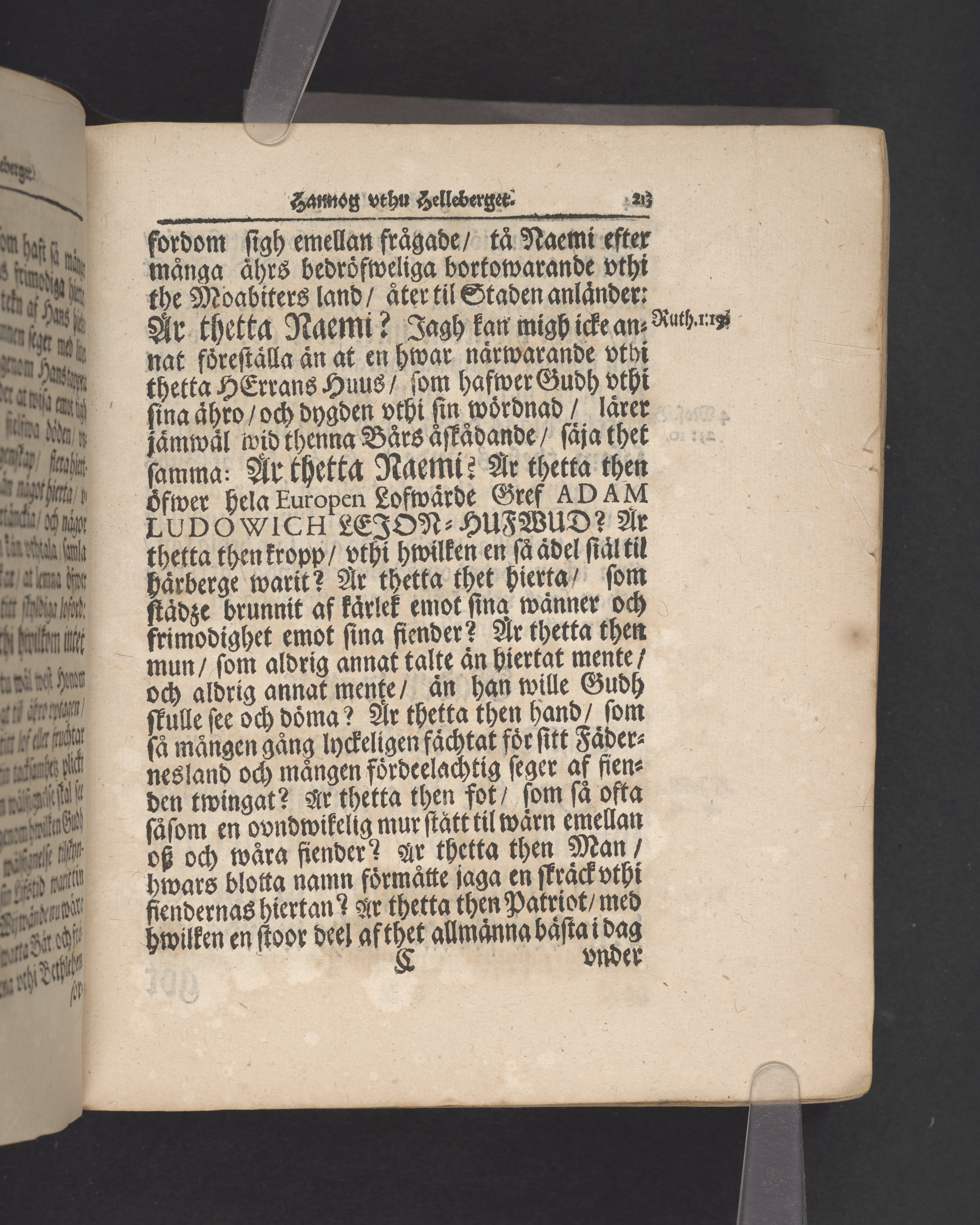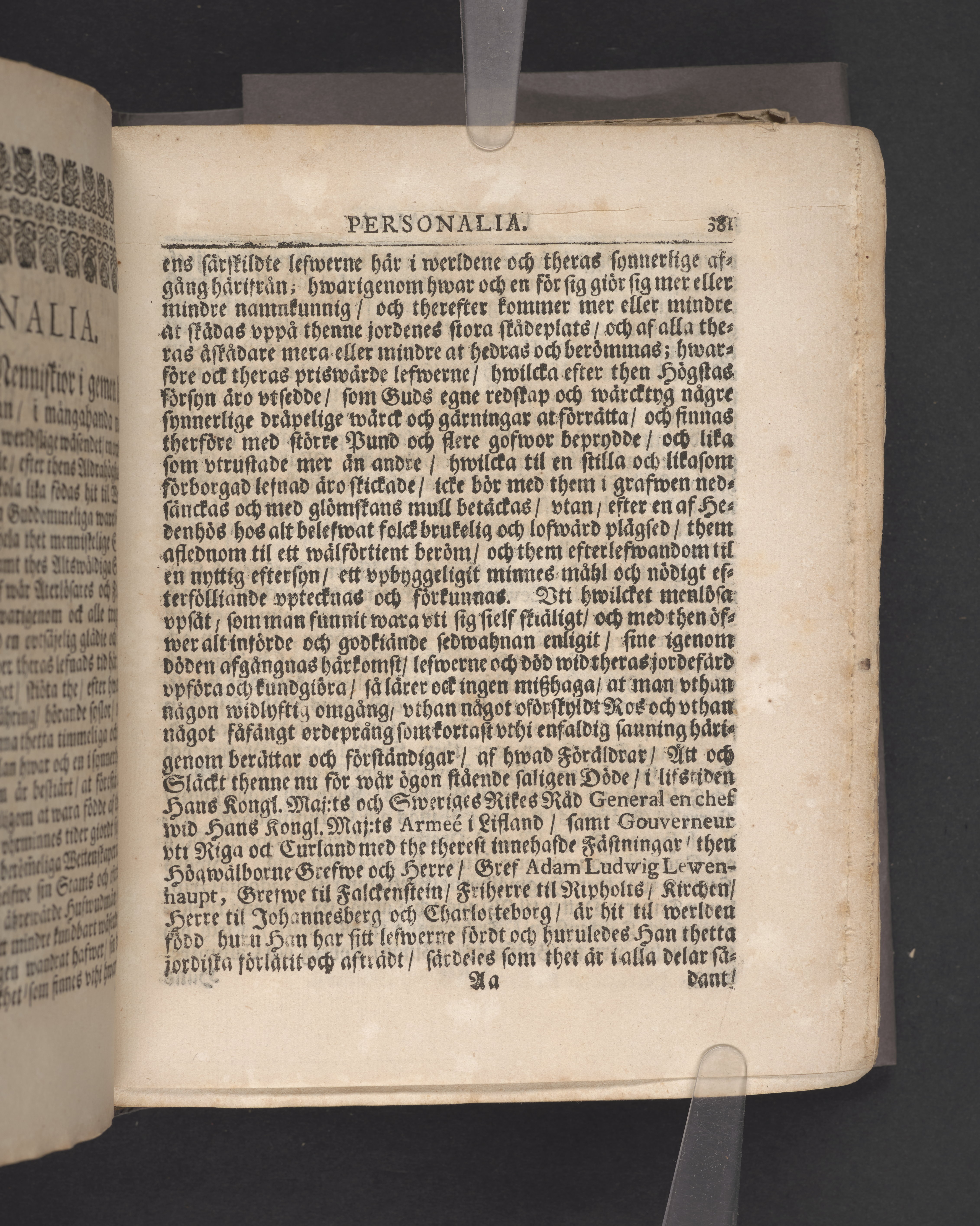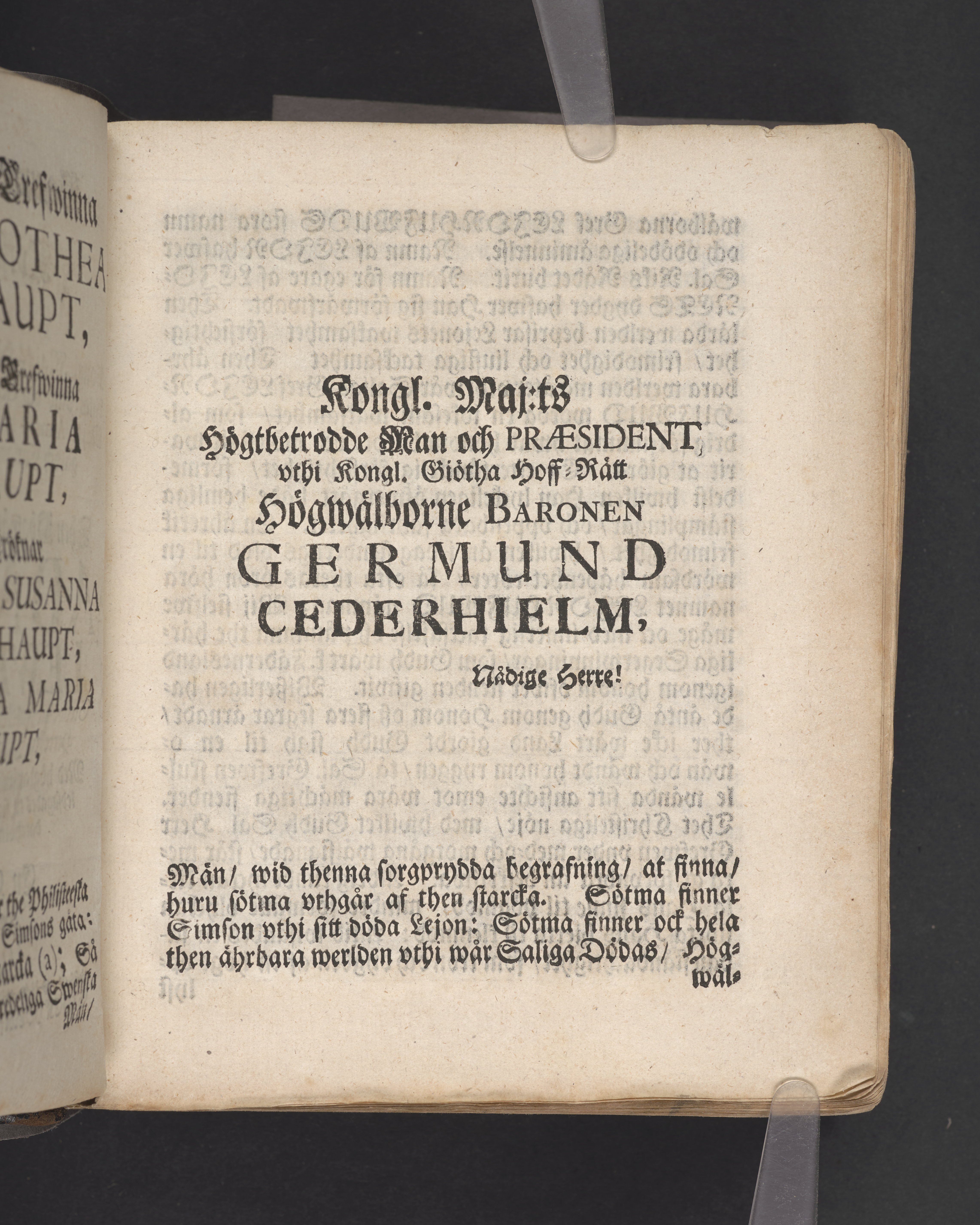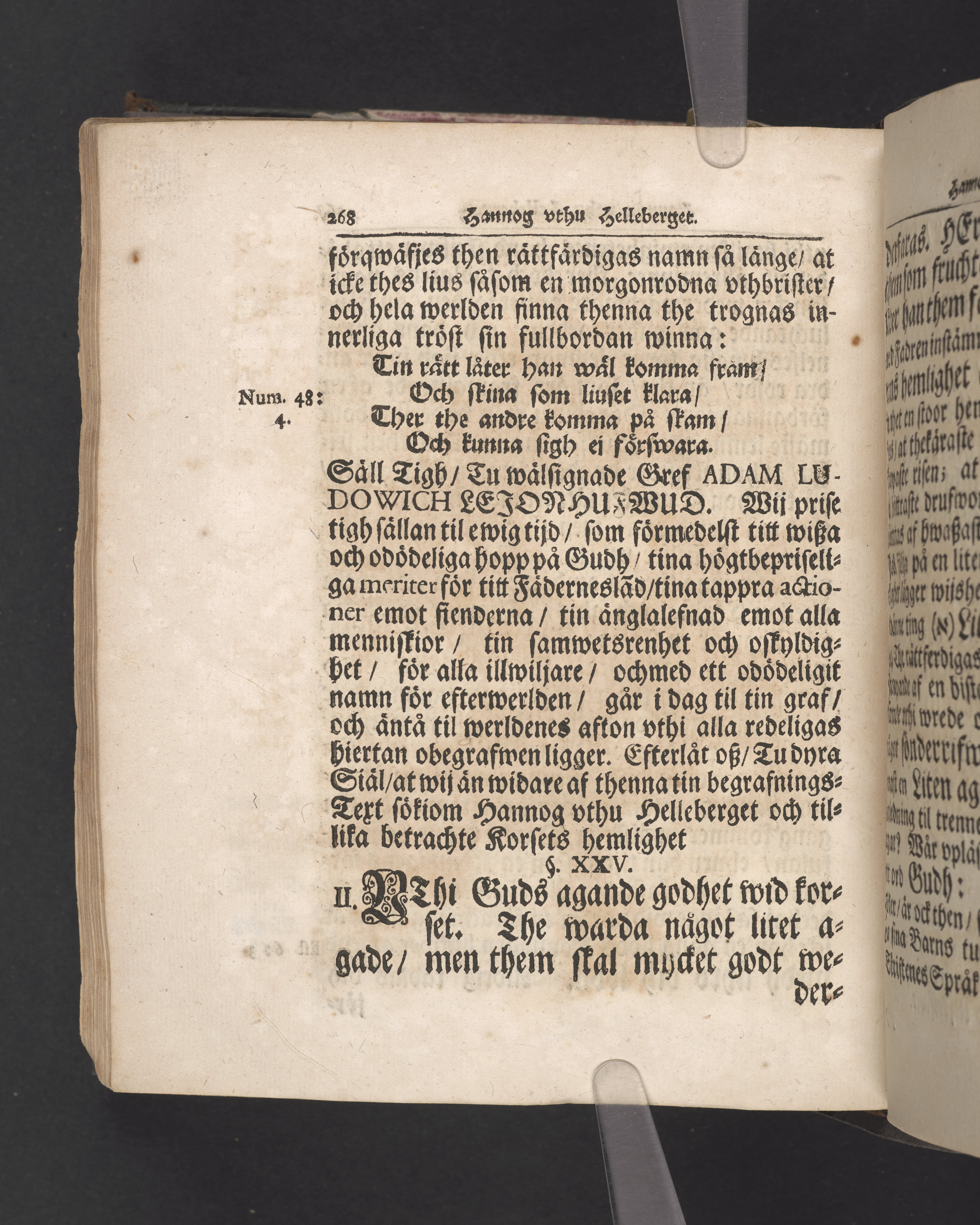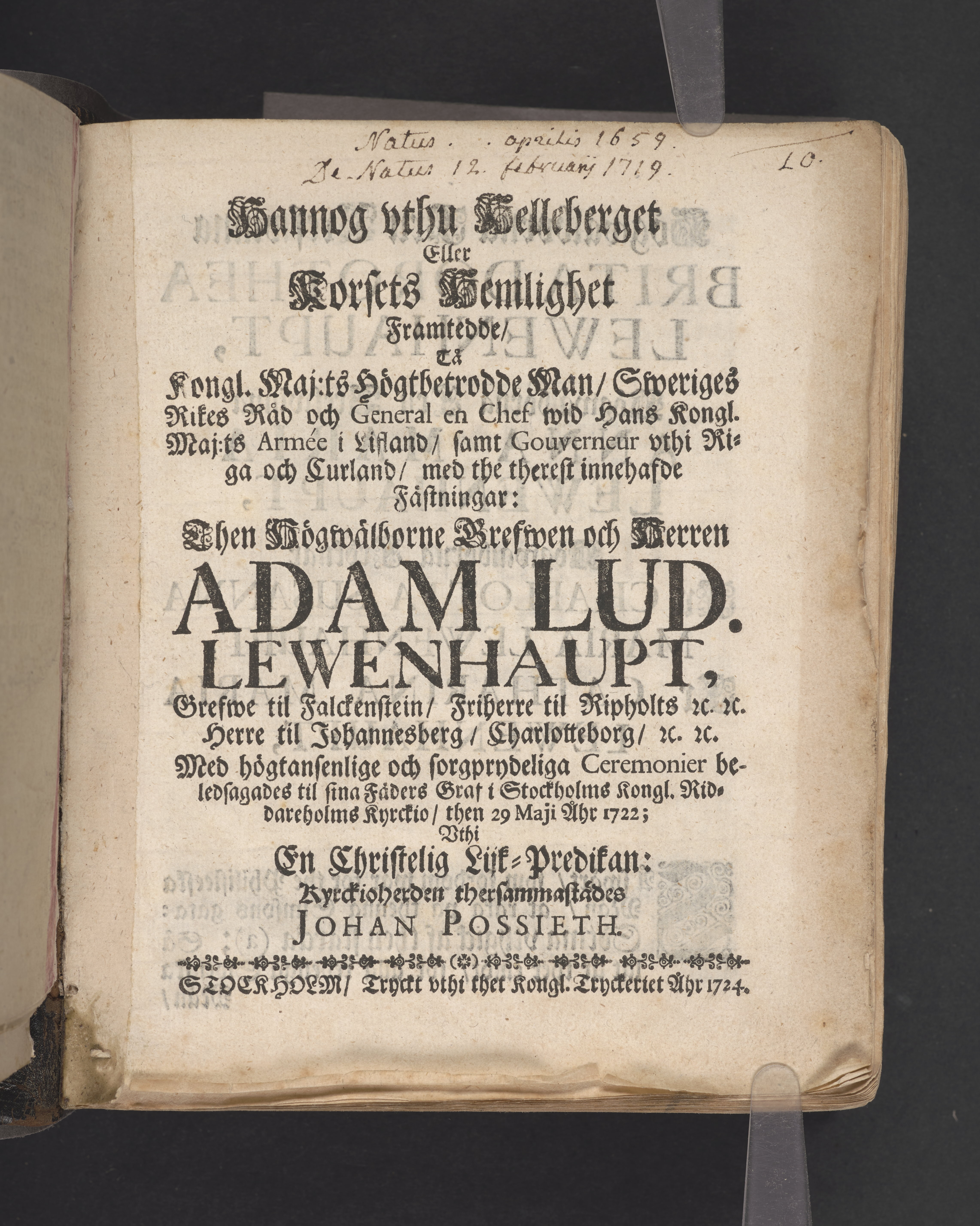 Hannog vthu helleberget eller korsets hemlighet framtedde, tå kongl. maj:ts högtbetrodde man, Sweriges rikes råd och general en chef wid hans kongl. maj:ts armée i Lifland, samt gouverneur vthi Riga och Curland, med the therest innehafde fästningar ... Adam Lud. Lewenhaupt ... Med högtansenlige och sorgprydeliga ceremonier beledsagades til sina fäders graf i Stockholms kongl. Riddareholms kyrckio, then 29 maji åhr 1722; vthi en christelig lijk-predikan ... Johan Possieth. Stockholm, tryckt vthi thet kongl. tryckeriet åhr 1724.