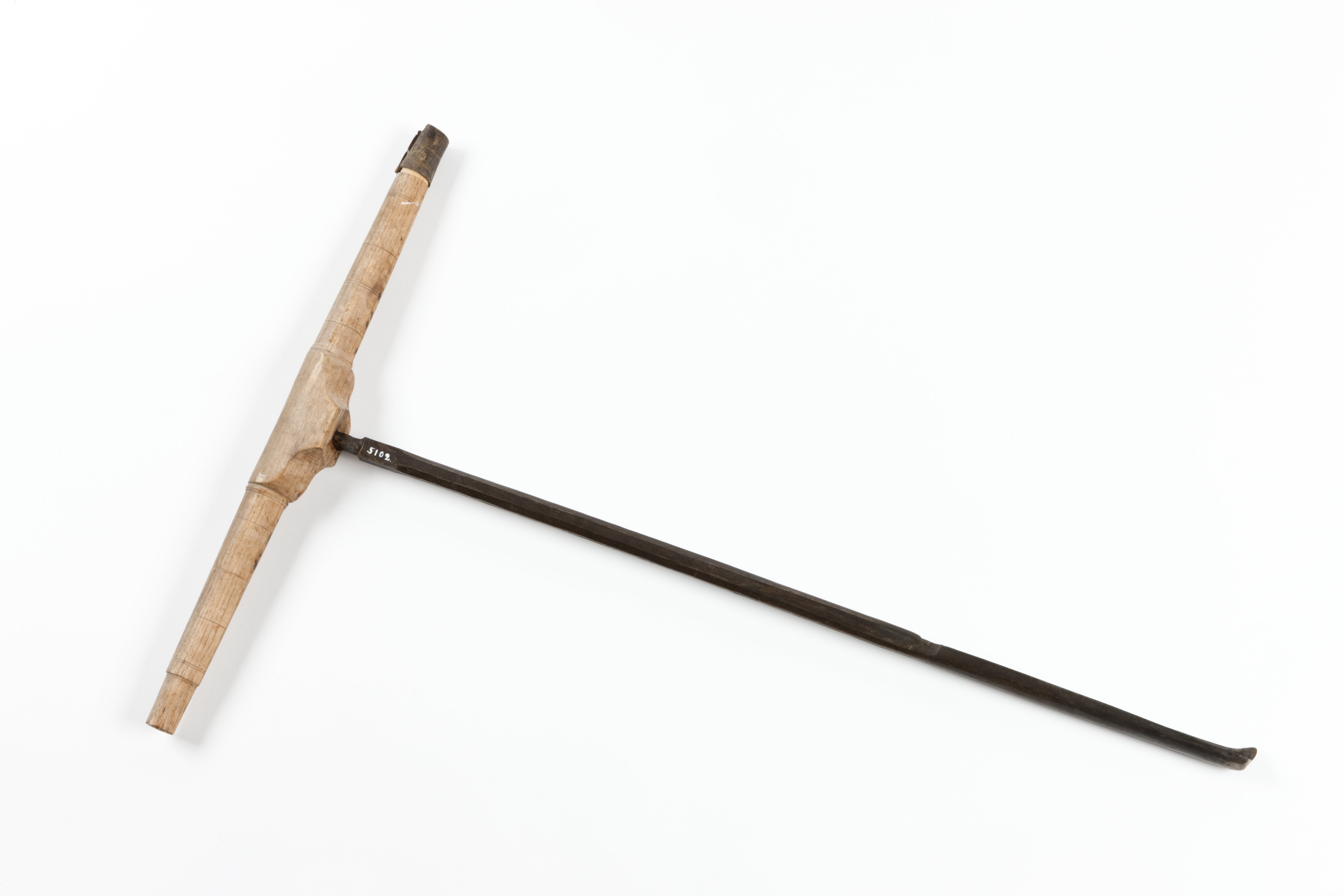 Fyrsidigt stål med avfasade kanter och skålad borr. Svartsmide. Stämpel: "I" på två ställen. Svarvat, profilerat handtag av ask? med benringar i ändarna.