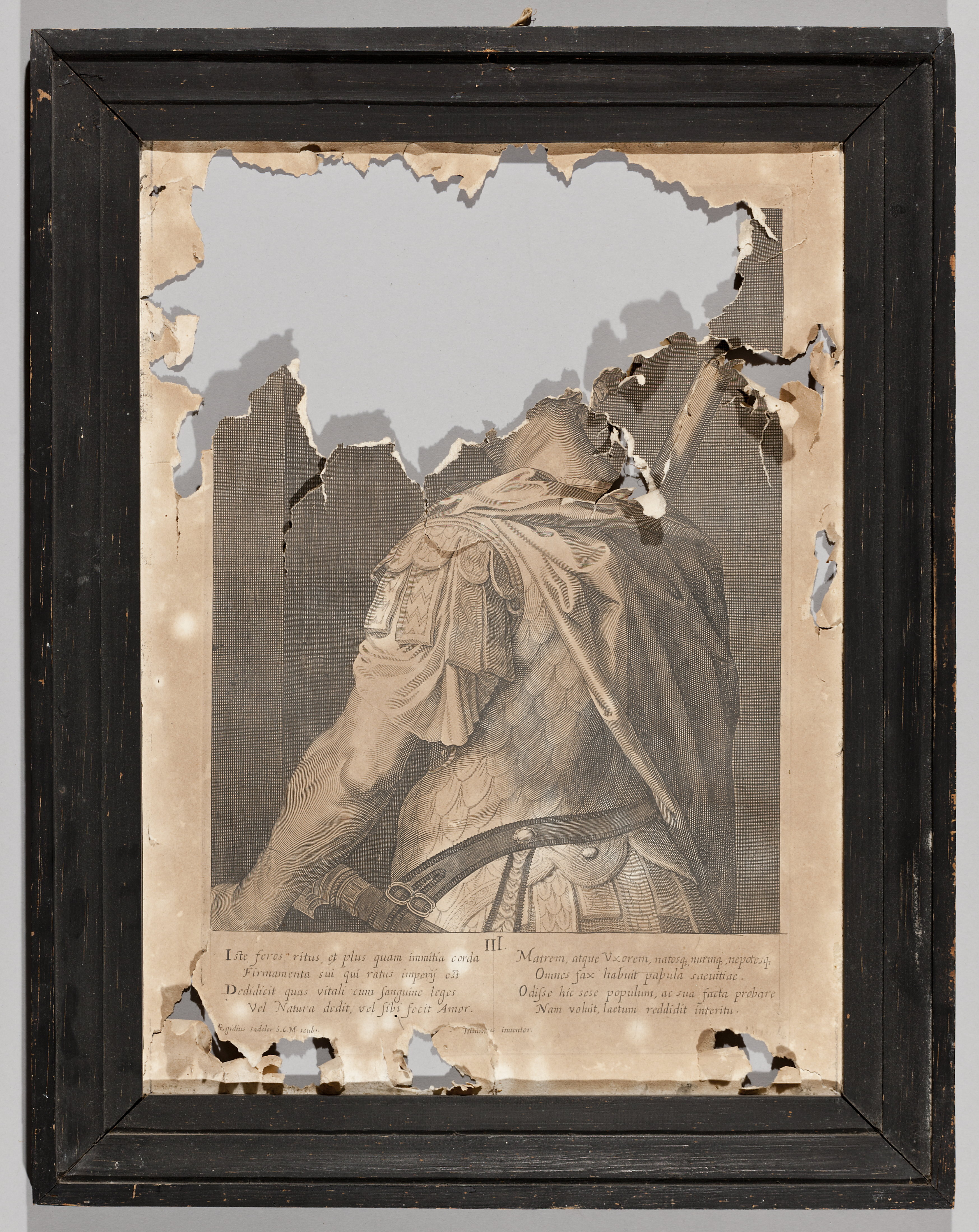 Rustning, mantel. Inskift under bilden: "III. Iste feros ritus, . . . . . laetum reddidit interitu." Klistrat på svart, profilerad ram. Ramlistens bredd 46 mm. Signatur: "AEgidius Sadeler S.C.M. sculp.", "Titianus inuentor". AE. Sadeler 1575-1629.