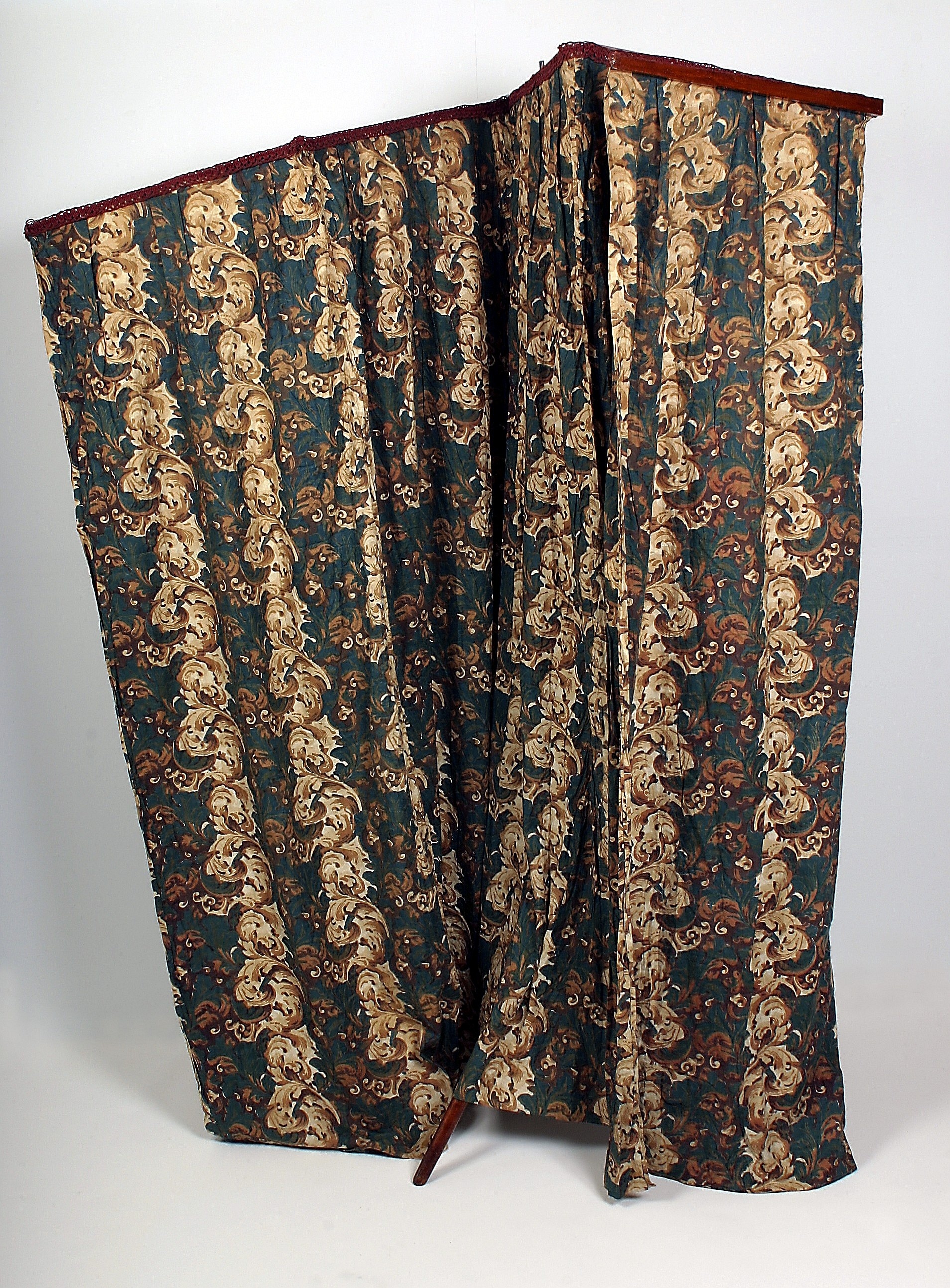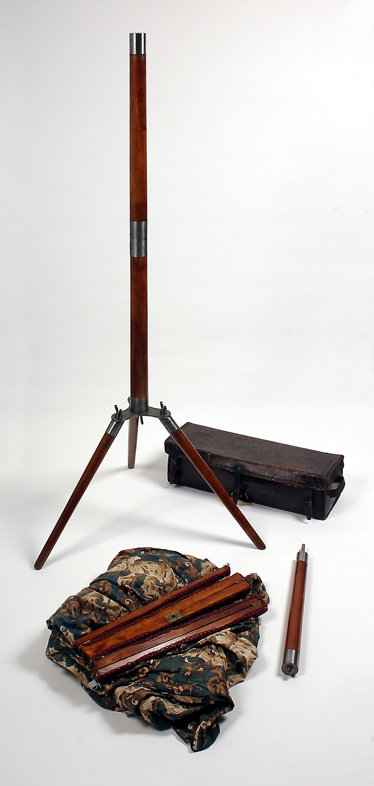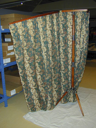 Består av en tredelad stång i brunpolerad trä. Varje del med metallbeslag i bägge ändar, övre skruvmutter borta. Ihopsatt är stången 210 cm. Även tre kortare stänger, 54 cm, som tillsammans bildar en trefot. Tältduken i grönt och brunt bladmönstrat bomullstyg i fem våder, fästad i en femdelad fyrkantig stång av brunpolerat trä, som hålls samman av gångjärn i metall. Stången dekorerad med vinrött band.