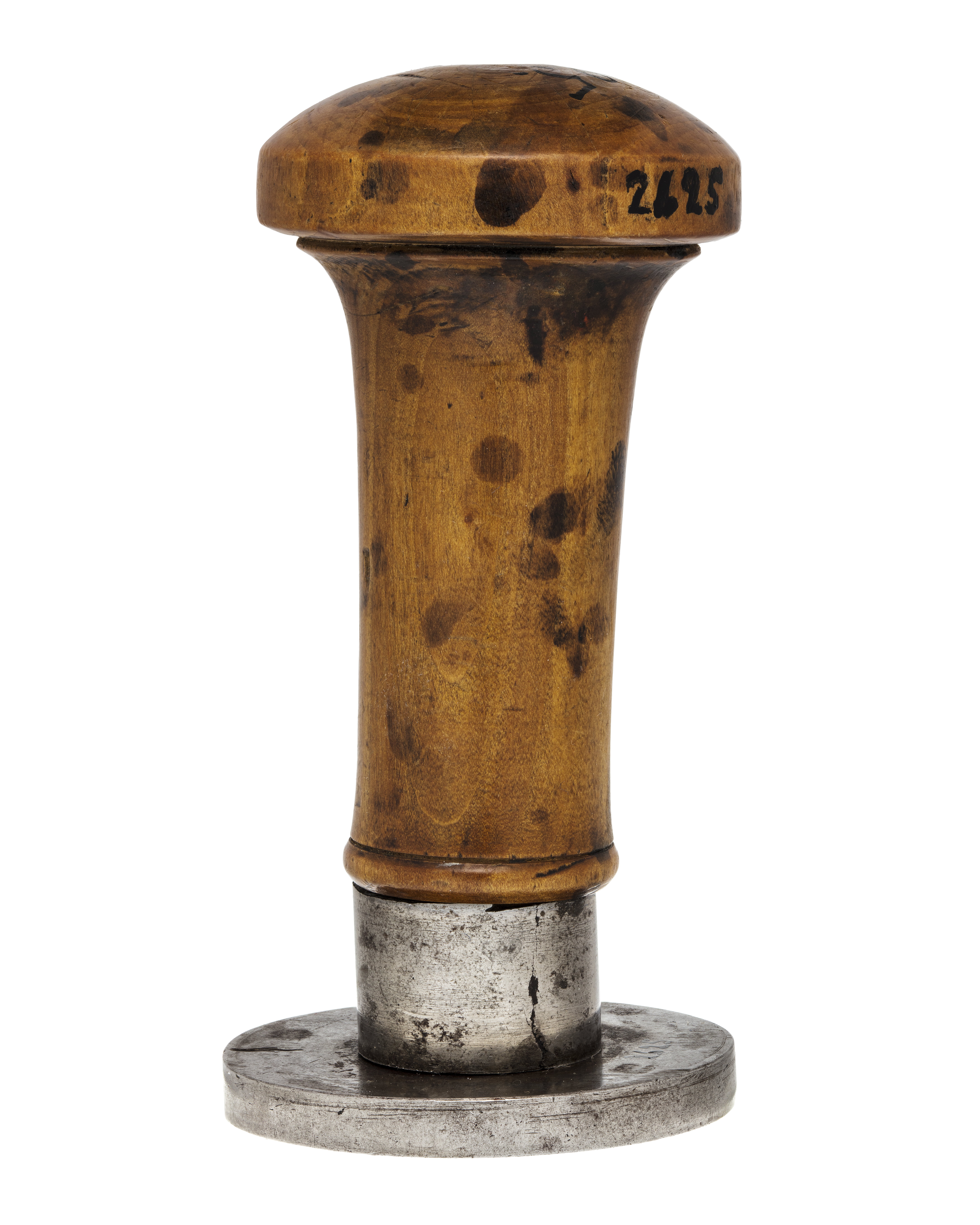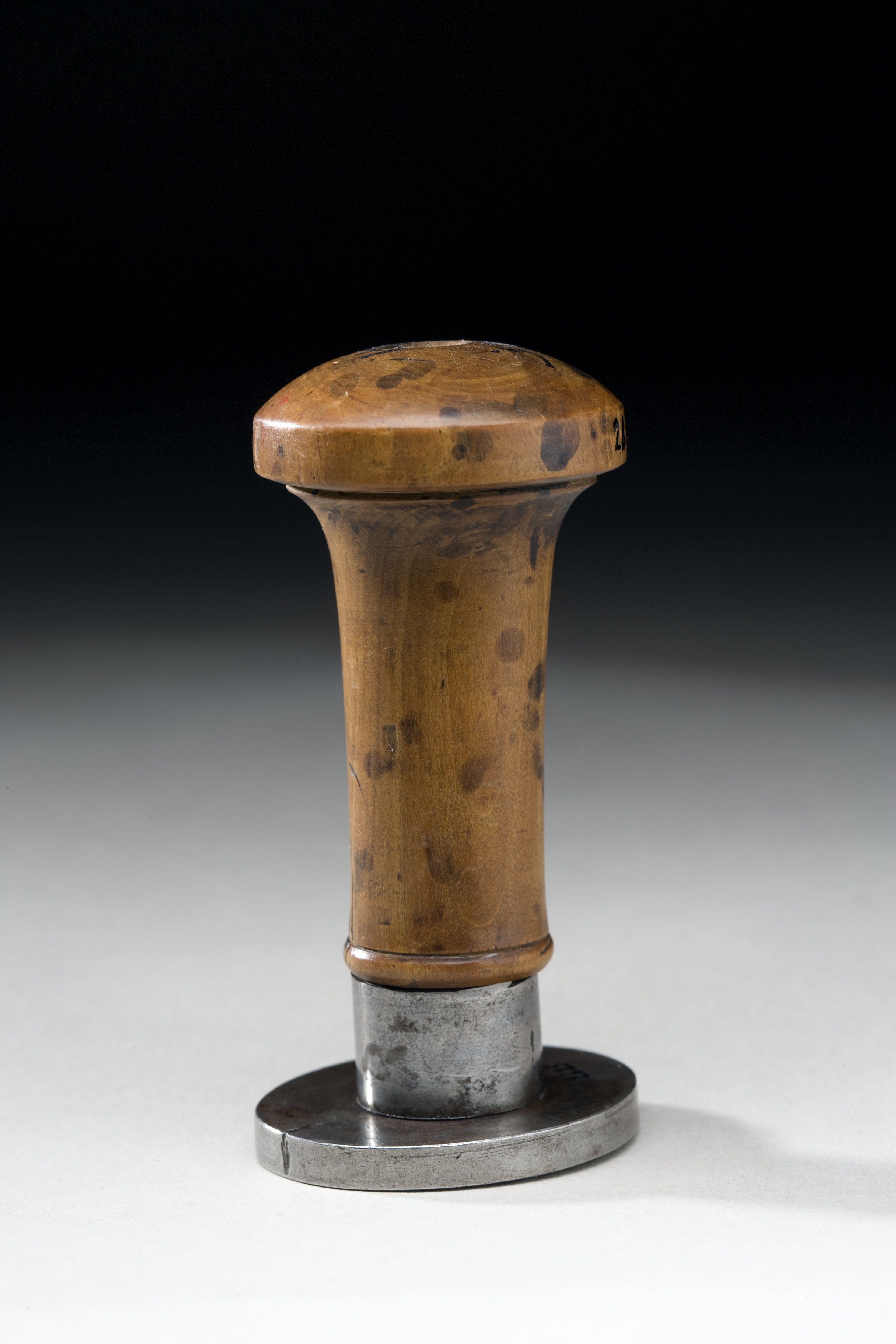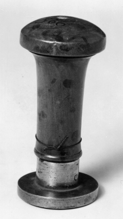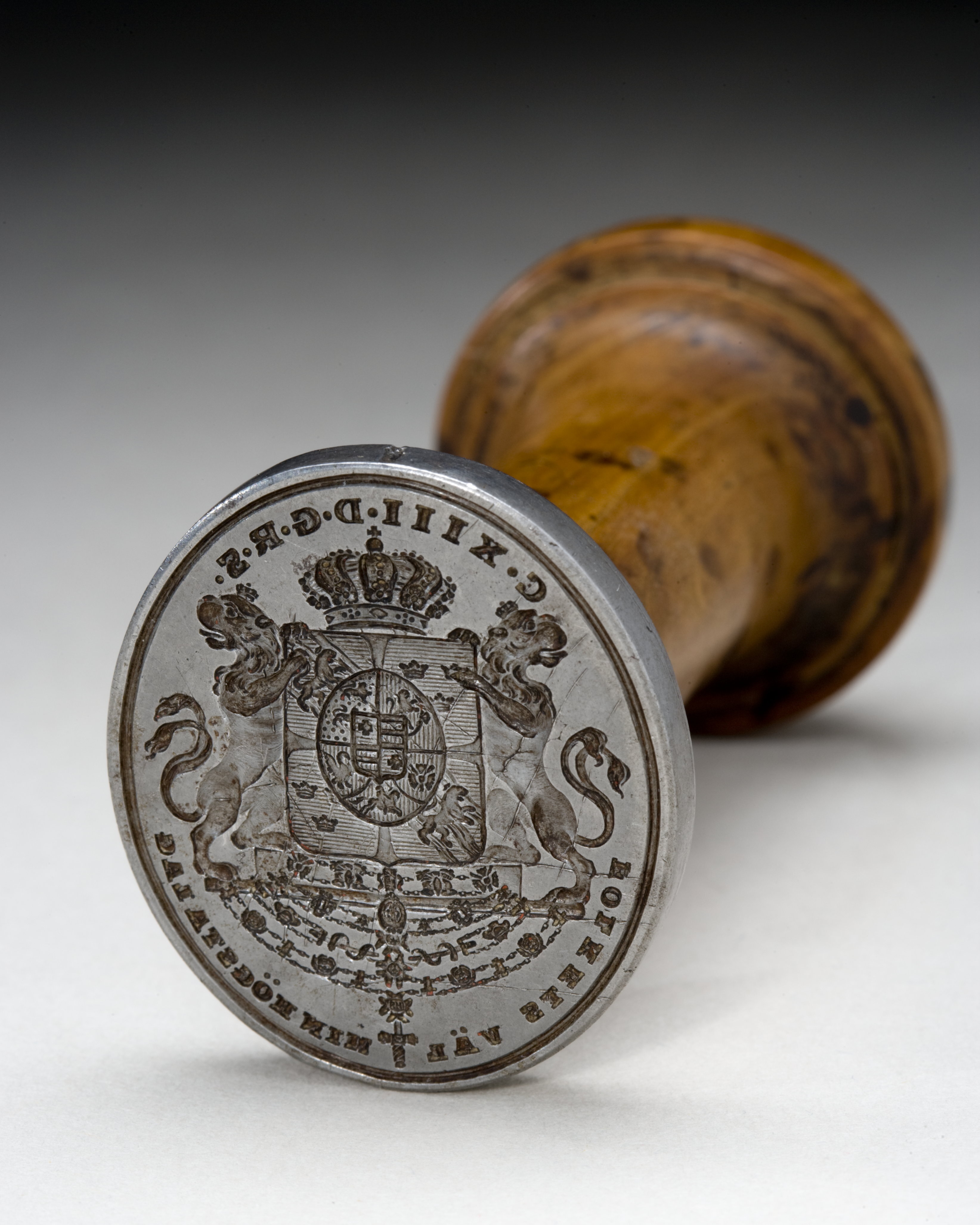 Oval platta av stål, däri graverat vapen, skrafferade färgangivelser. Sköld av fransk typ, kvadrerad med utböjt kors, tre kronor och folkungalejonet. Oval hjärtsköld Holstein-Gottorp. Skölden krönt av kunglig krona, sköldhållare krönt, bakåtseende lejon, postament i två avsatser. Ifrån postamentet hänger Vasa-, Nordstjärne-, Svärds- och Serafimerordens kedjor med tecken, samt svärd för riddare med stora korset av Svärdsorden. Ovanför kronan spegelvänd text: "C.XIII.D.G.R.S.", nedanför vapnet spegelvänt valspråk: Slät kantring. På randen och plattans ovansida är en flamliknande gravering. Holk av stål, d: 20,4 mm, h: 14 mm. Svarvat skaft av ljusbrunt trä, cylinderformigt, uppåt vidgat till rund cylinderformig skiva med välvd ovansida, d: 40 mm.
